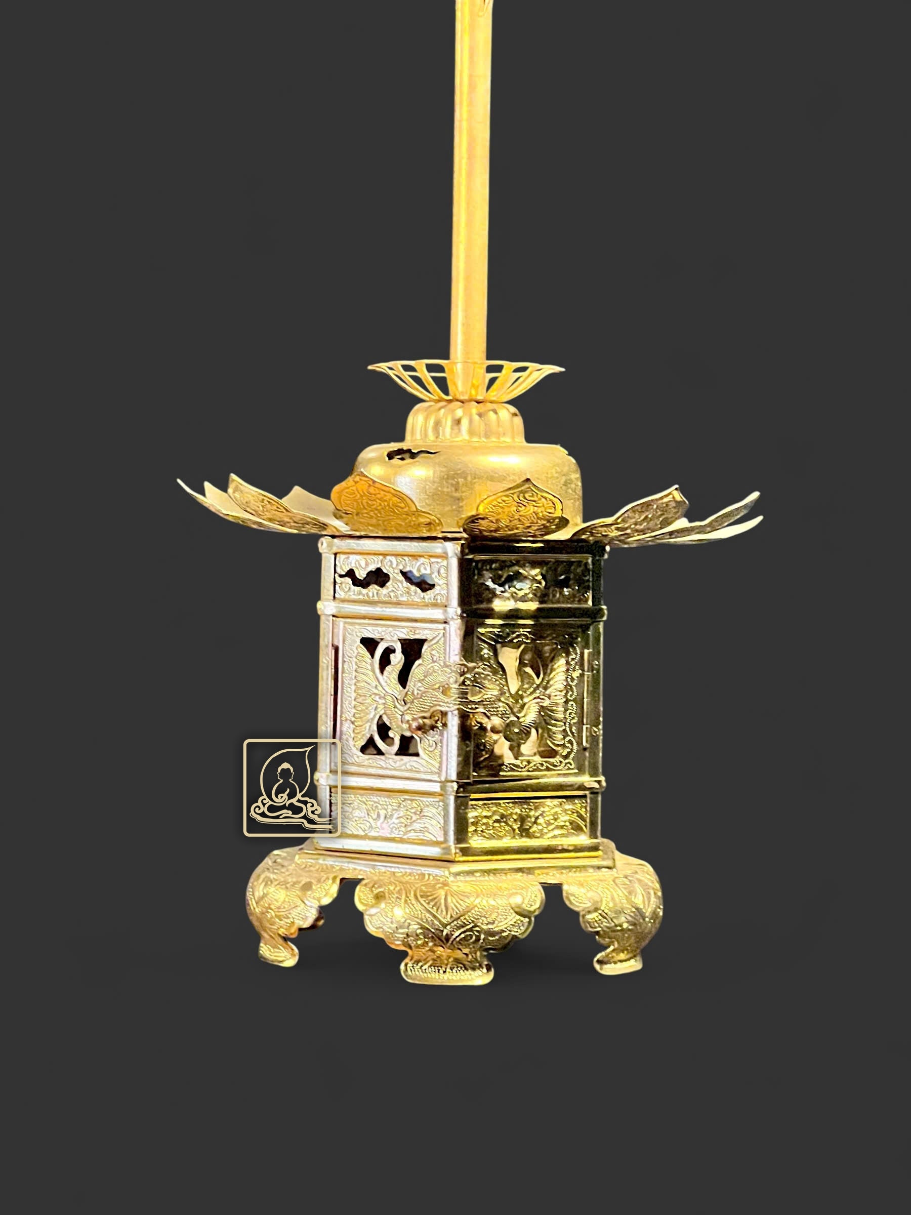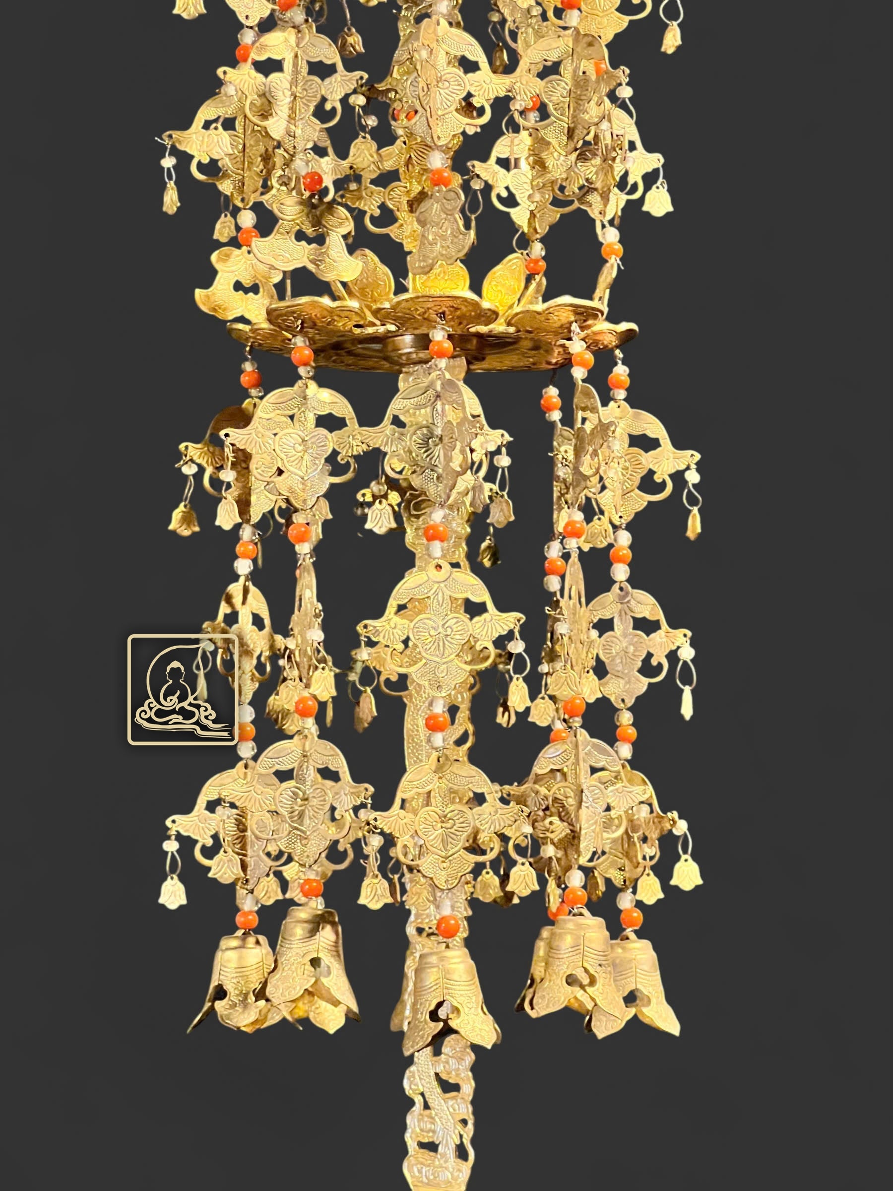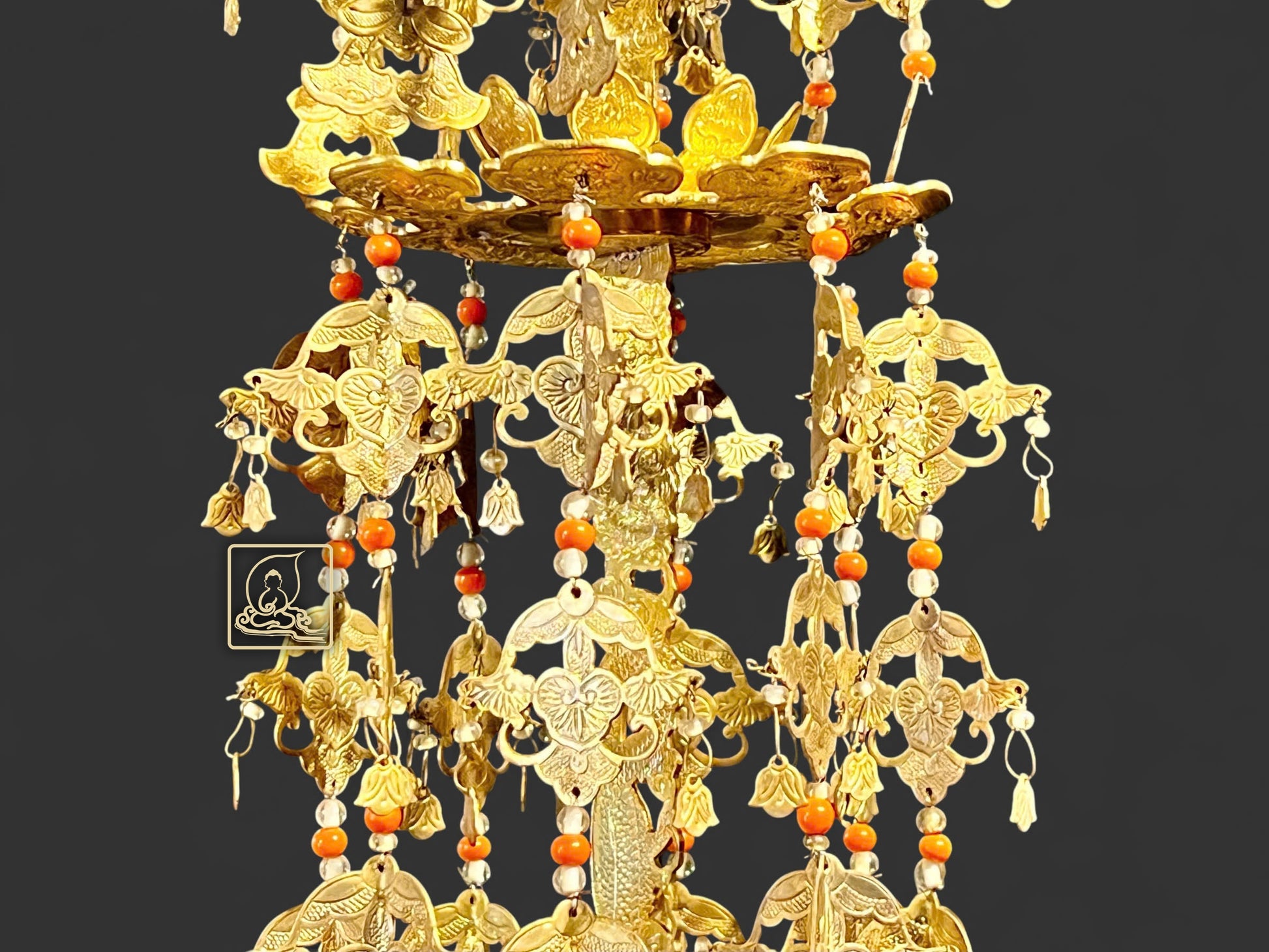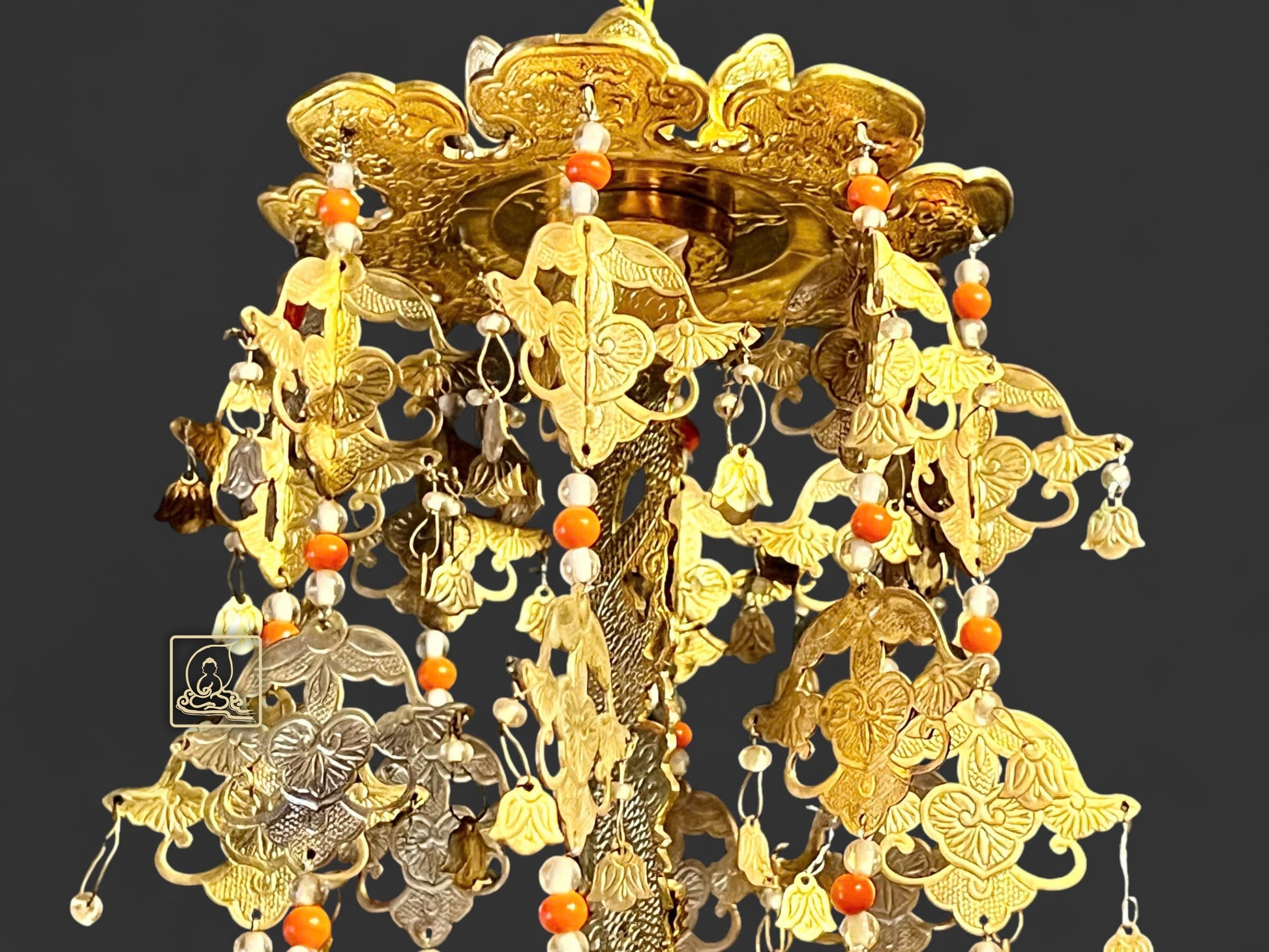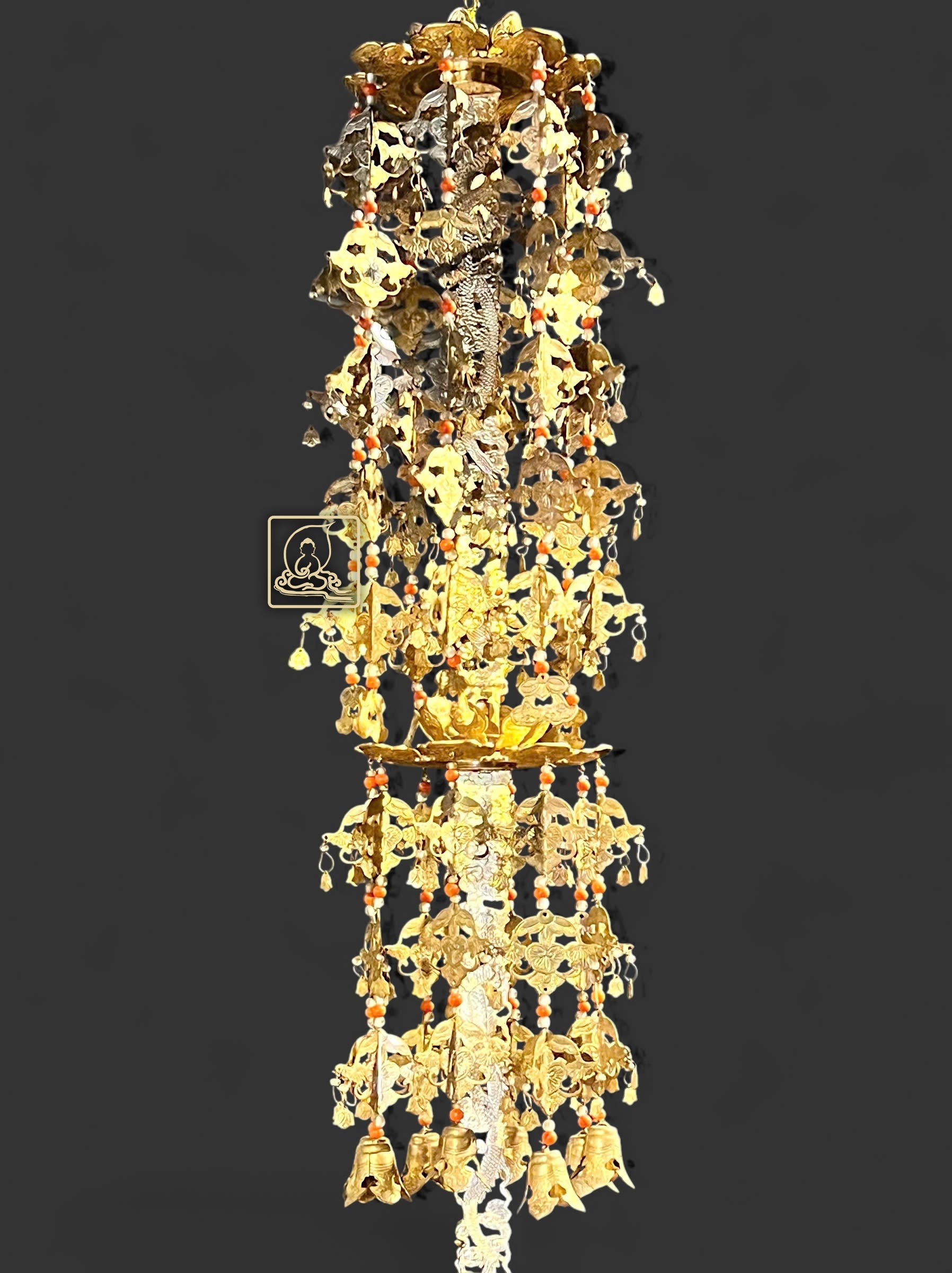 Bộ anh lạc được chạm khắc tỉ mỉ, tinh tế từ chất liệu đồng mạ vàng qua bàn tay khéo léo của nghệ nhân Nhật Bản thực hiện. Với kỹ thuật mạ vàng đã giúp bảo vệ anh lạc qua nhiều thời gian năm tháng không bị ảnh hường tác động của môi trường, kết hợp những hoạ tiết chạm nổi đặc sắc, dùng để cúng dường và góp phần trang nghiêm Phật điện.