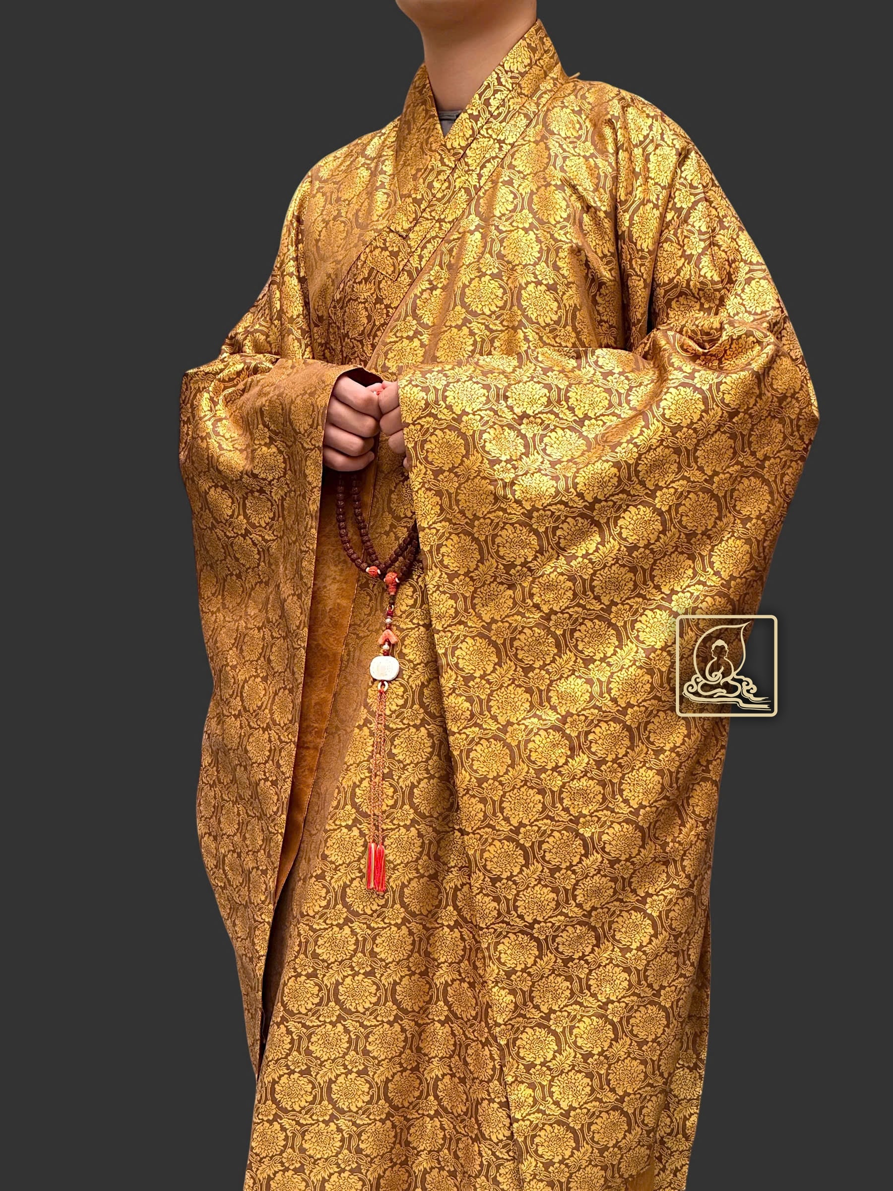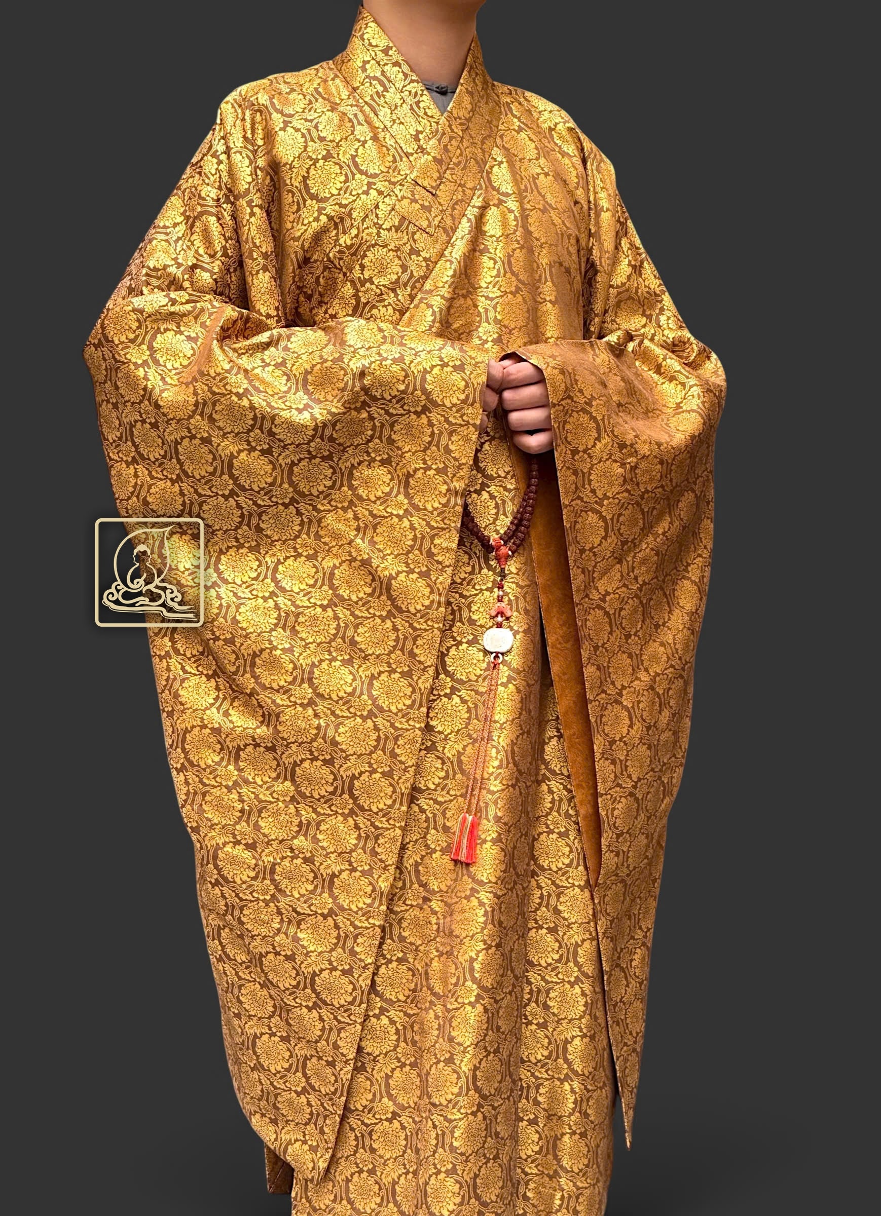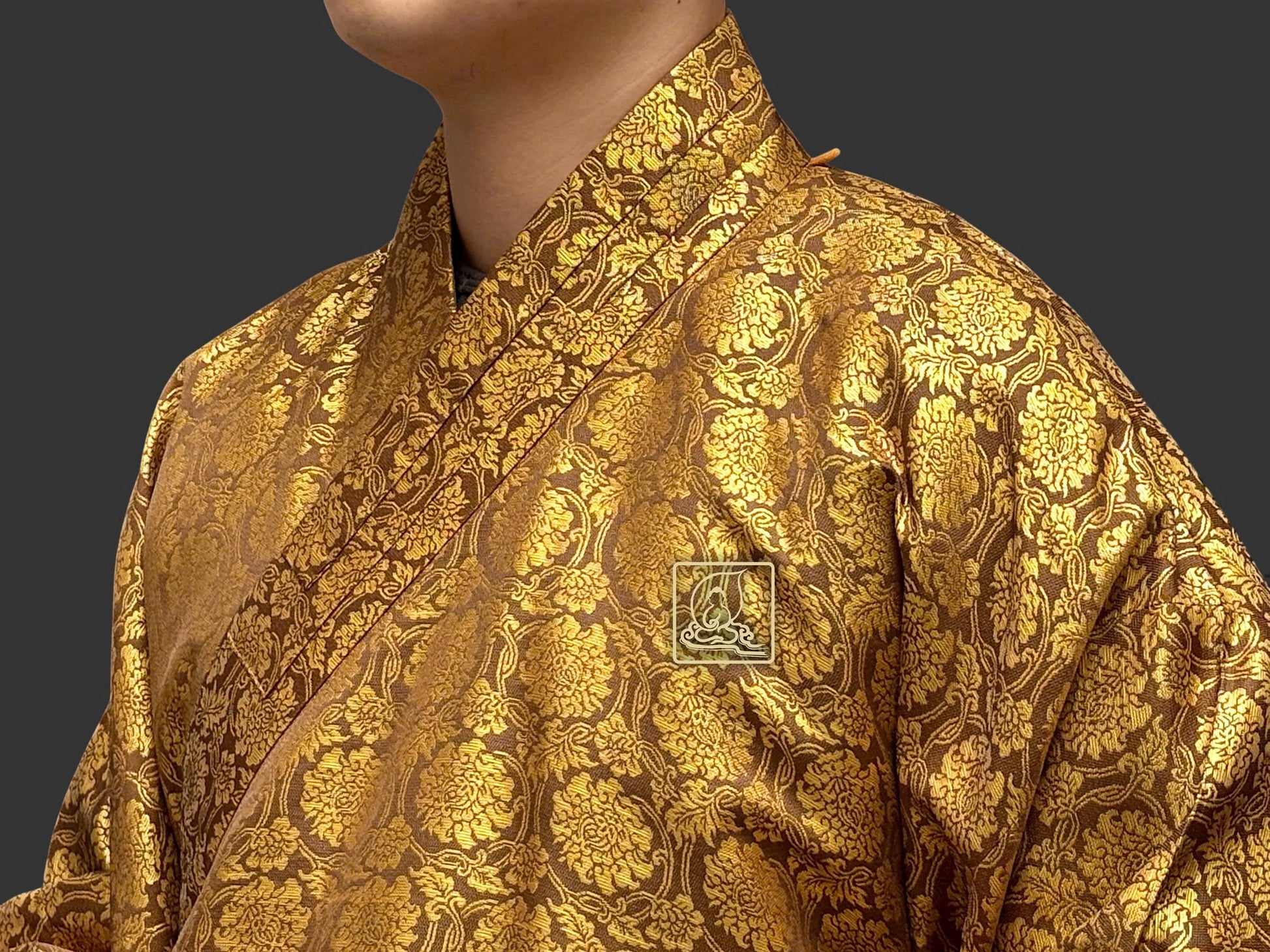 Mẫu áo hậu chư Tăng được chế tác từ gấm Nhật cao cấp, nổi bật với họa tiết hoa văn dệt kết hợp sợi chỉ vàng tạo chiều sâu trang trọng và tinh tế. Tông màu vàng nâu trang nghiêm hòa cùng ánh kim nhẹ của họa tiết mang lại vẻ uy nghi, xứng tôn phẩm hạnh của chư Tôn Đức.