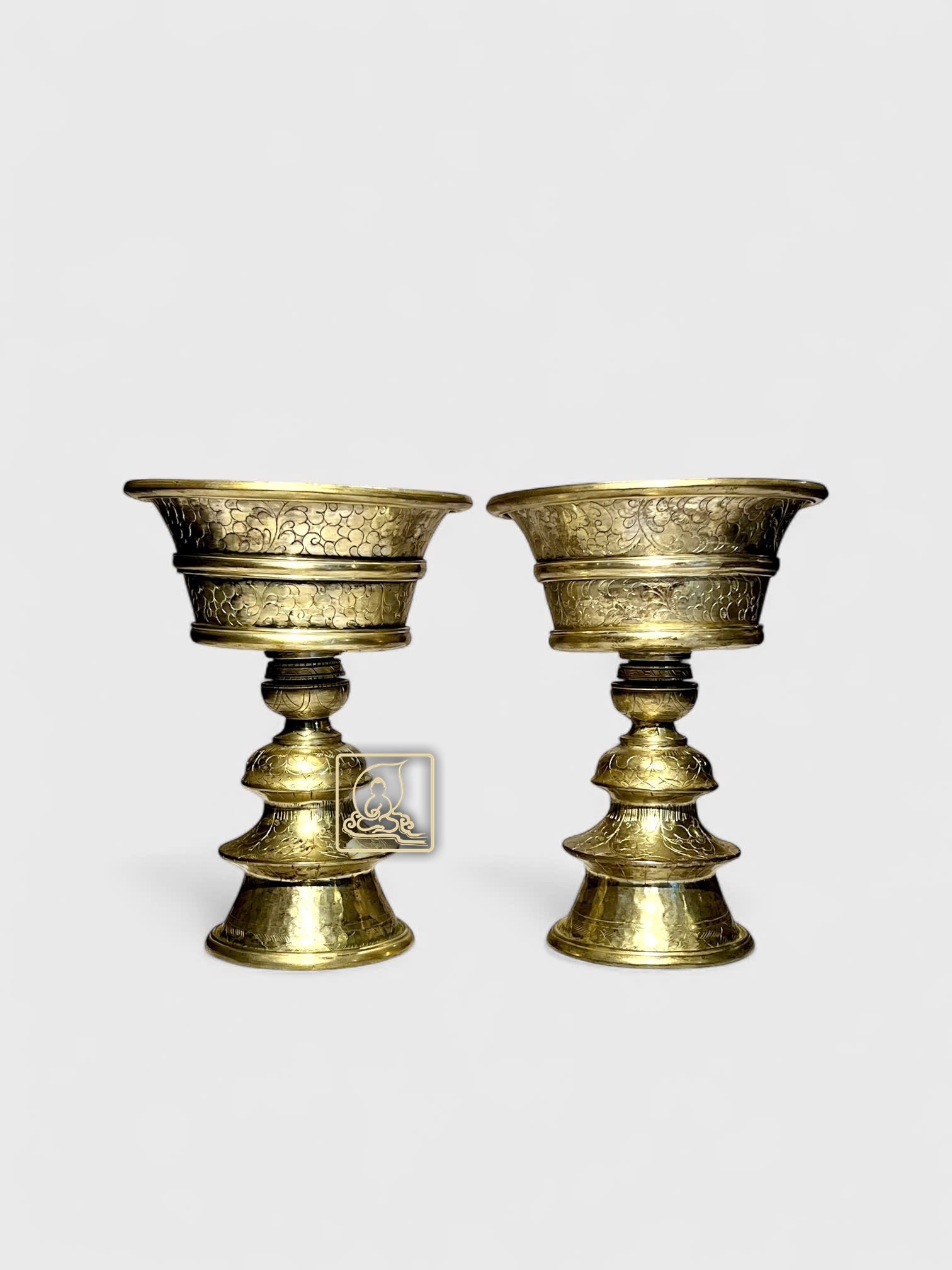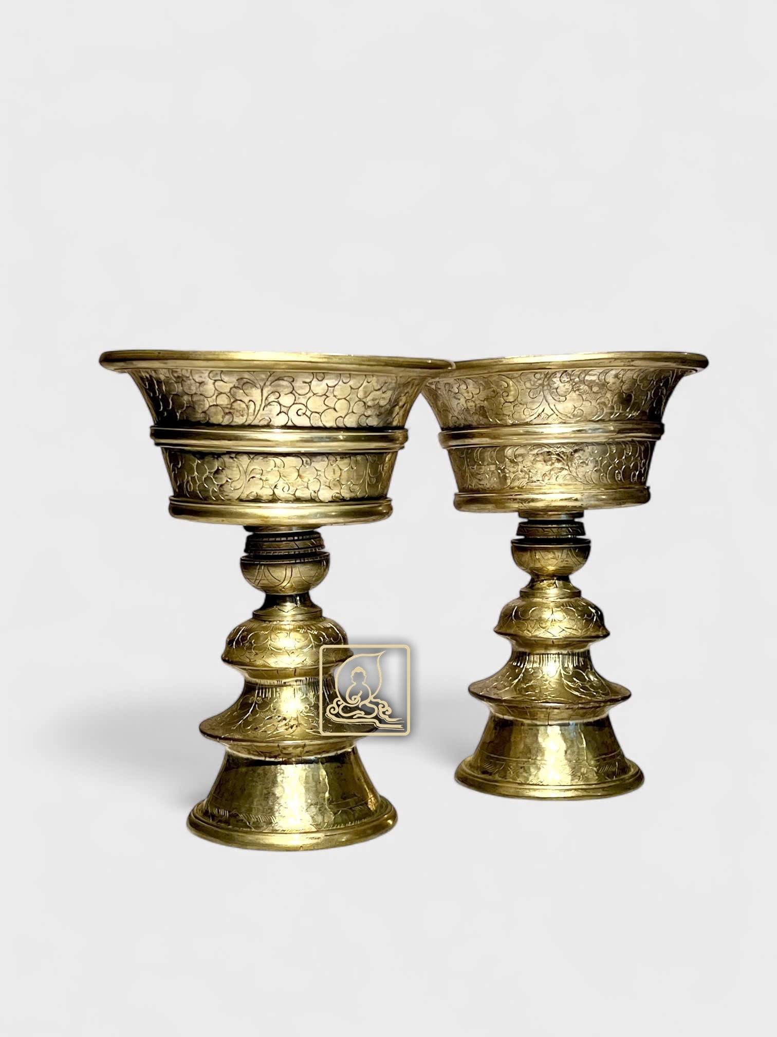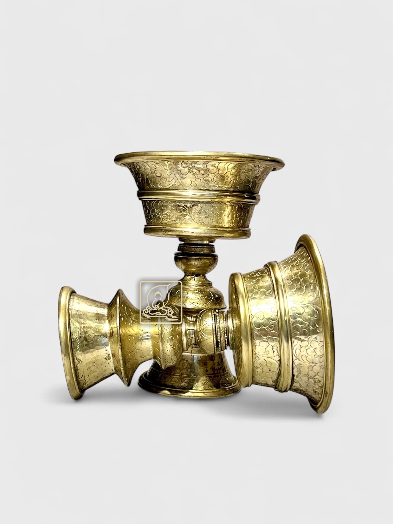 A pair of candle holders are used to hold candles or oil offerings for the Three Jewels. In Buddhism, offering light is a practice to dispel the darkness of ignorance, illuminating clarity and wisdom. By making such offerings, one aspires for the radiant light to shine across realms, ease the suffering of sentient beings, and cultivate the noble wisdom to understand that true happiness arises from wholesome body, speech, and mind. Moreover, this offering invites the hidden light of Buddha-nature to arise within all beings, dispelling the darkness of ignorance and removing the obscurations caused by wrong views.