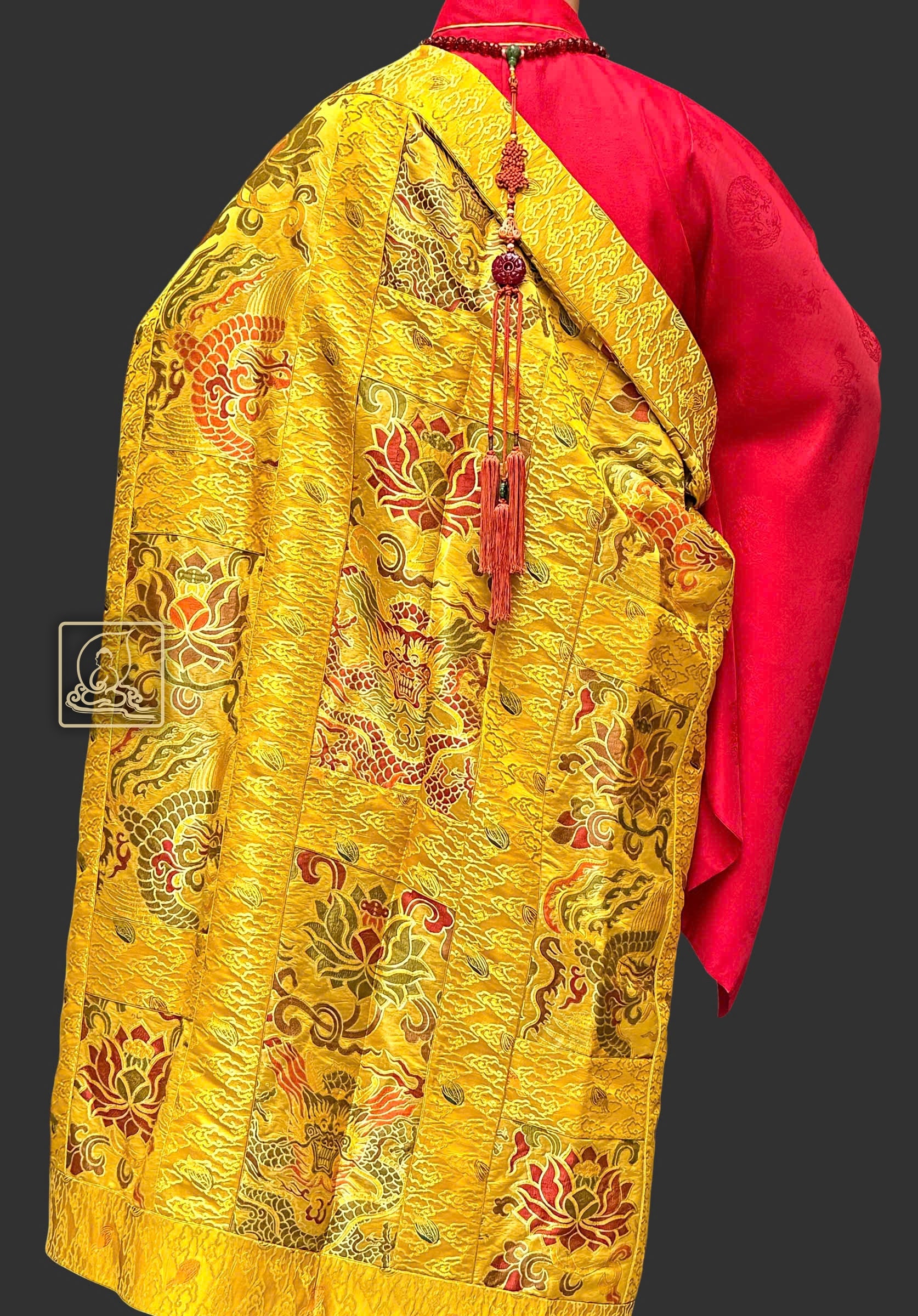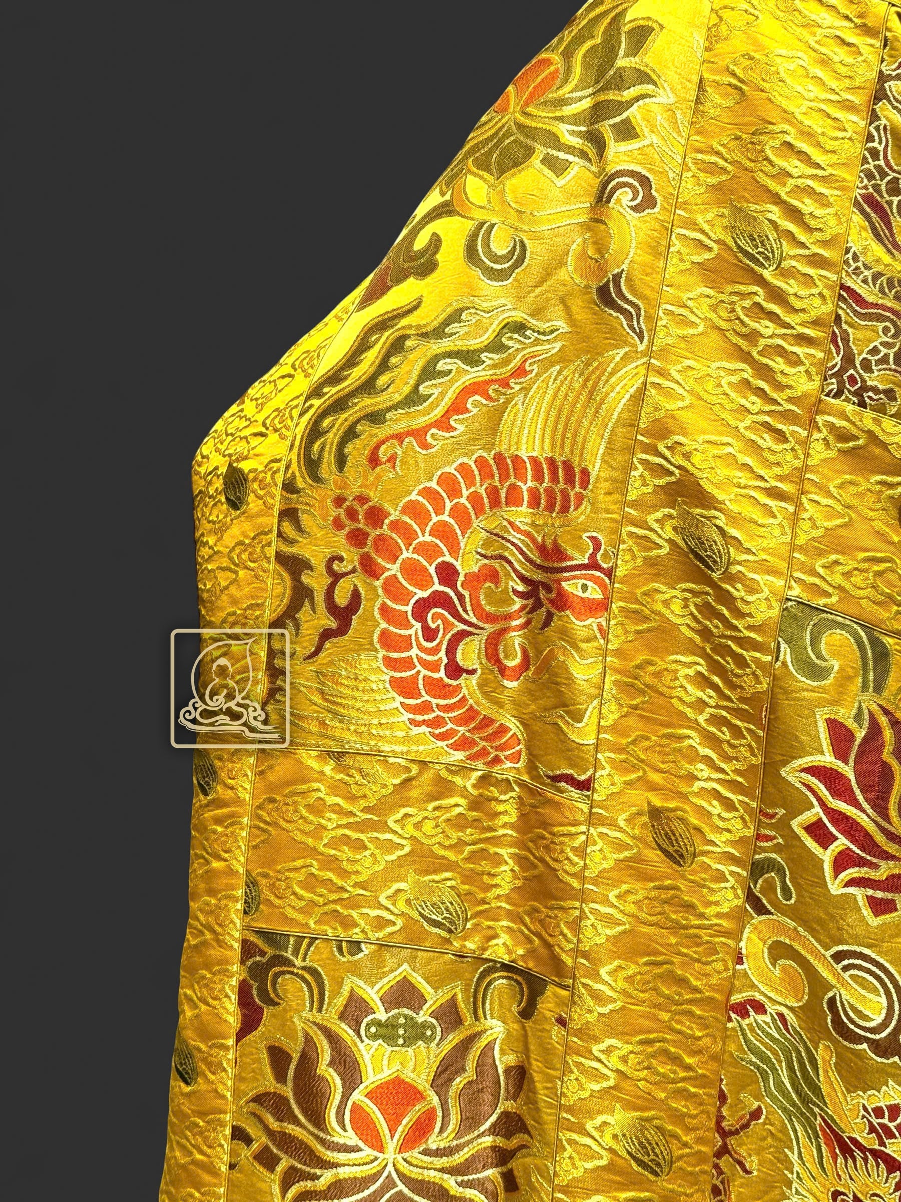 Pháp y được may theo lối y Đường từ chất liệu gấm Nhật phối hợp cùng gấm Tạng dệt thủ công họa tiết hoa văn rồng, phượng và hoa sen làm phần nền chủ đạo của y với sự kết hợp hài hòa giữa các màu sắc. Pháp y được may theo phương pháp may nhíp điệp, cắt ráp tỉ mỉ giữa các phần tạo nên chiếc pháp y hoàn chỉnh. Phối hợp cùng áo sa họa tiết rồng ẩn góp phần trang nghiêm Tăng tướng của chư Tôn Đức sám chủ đàn.