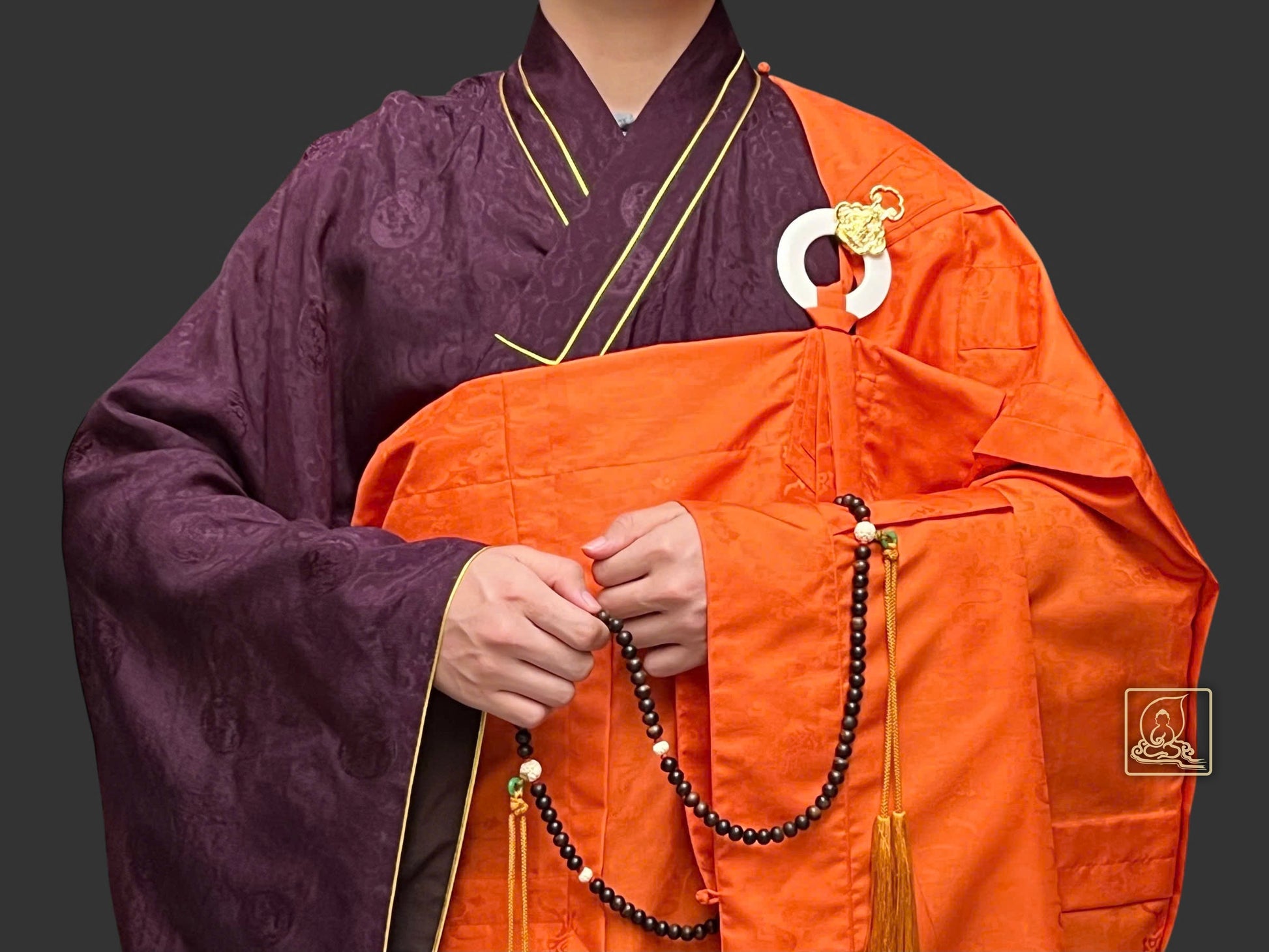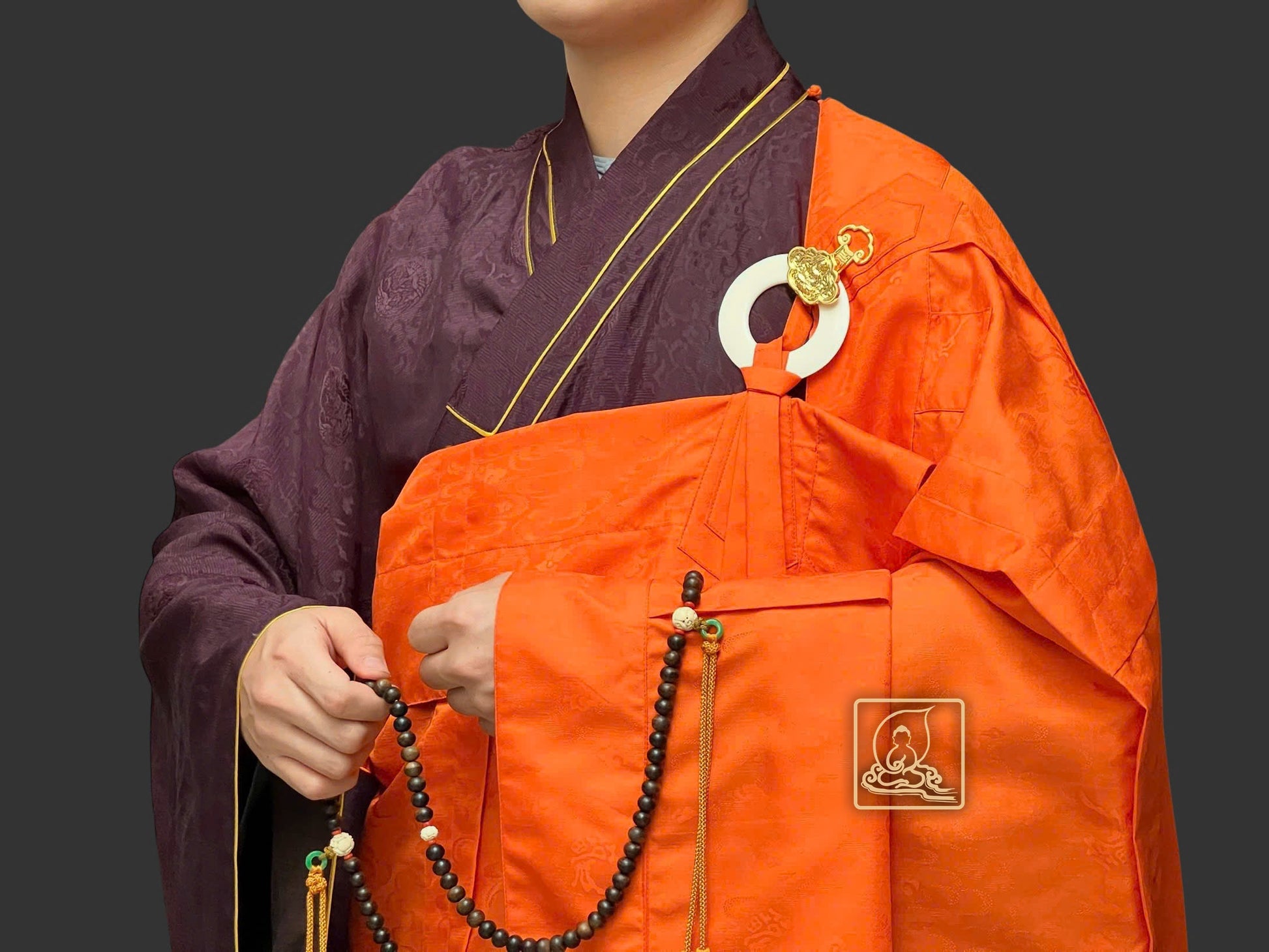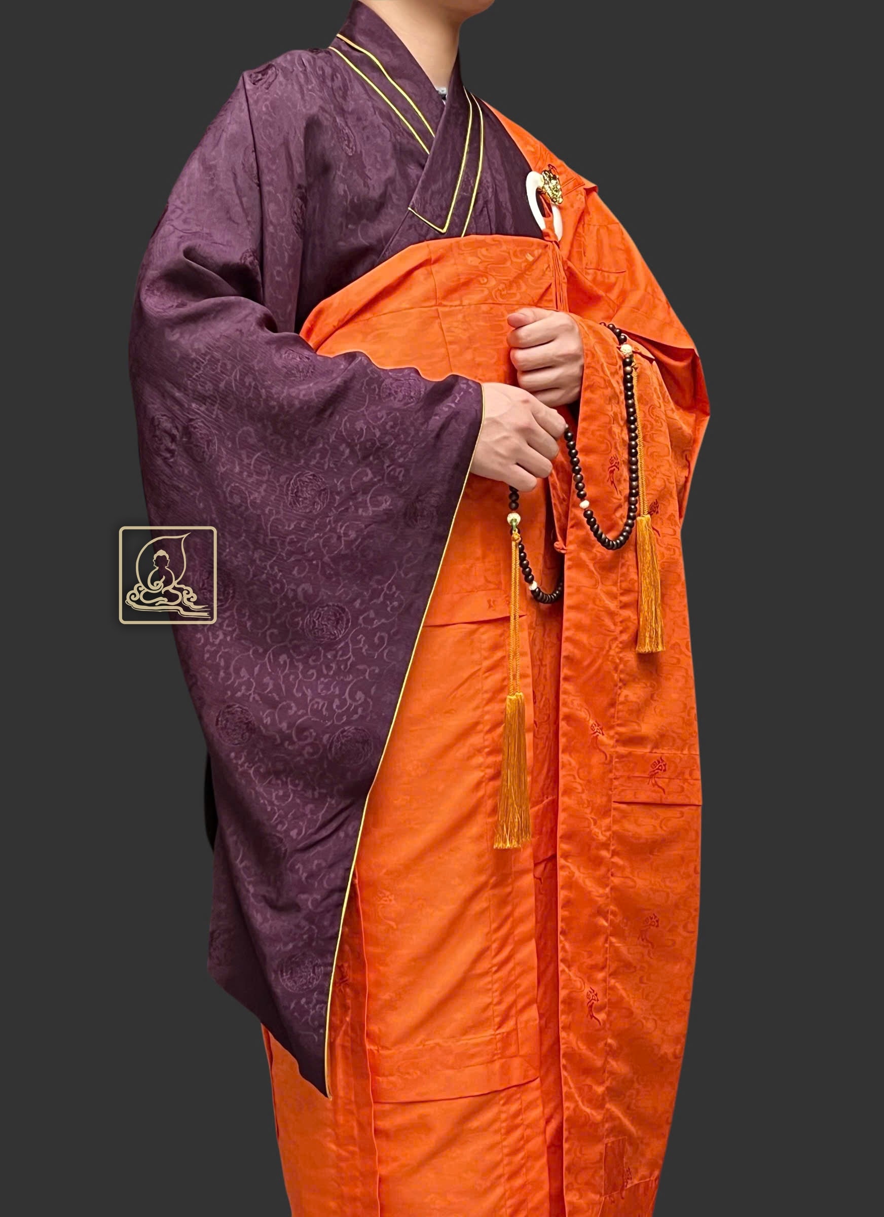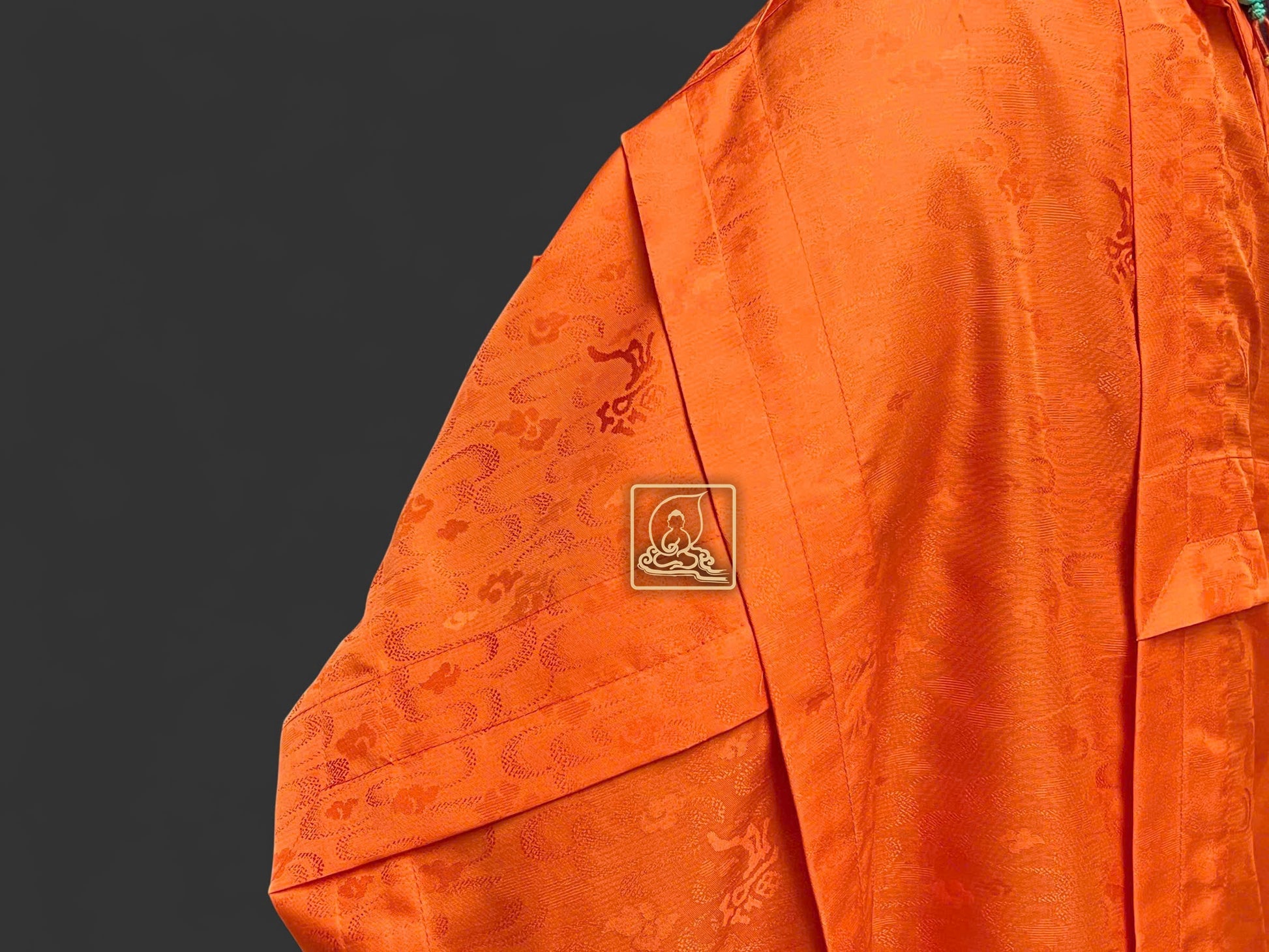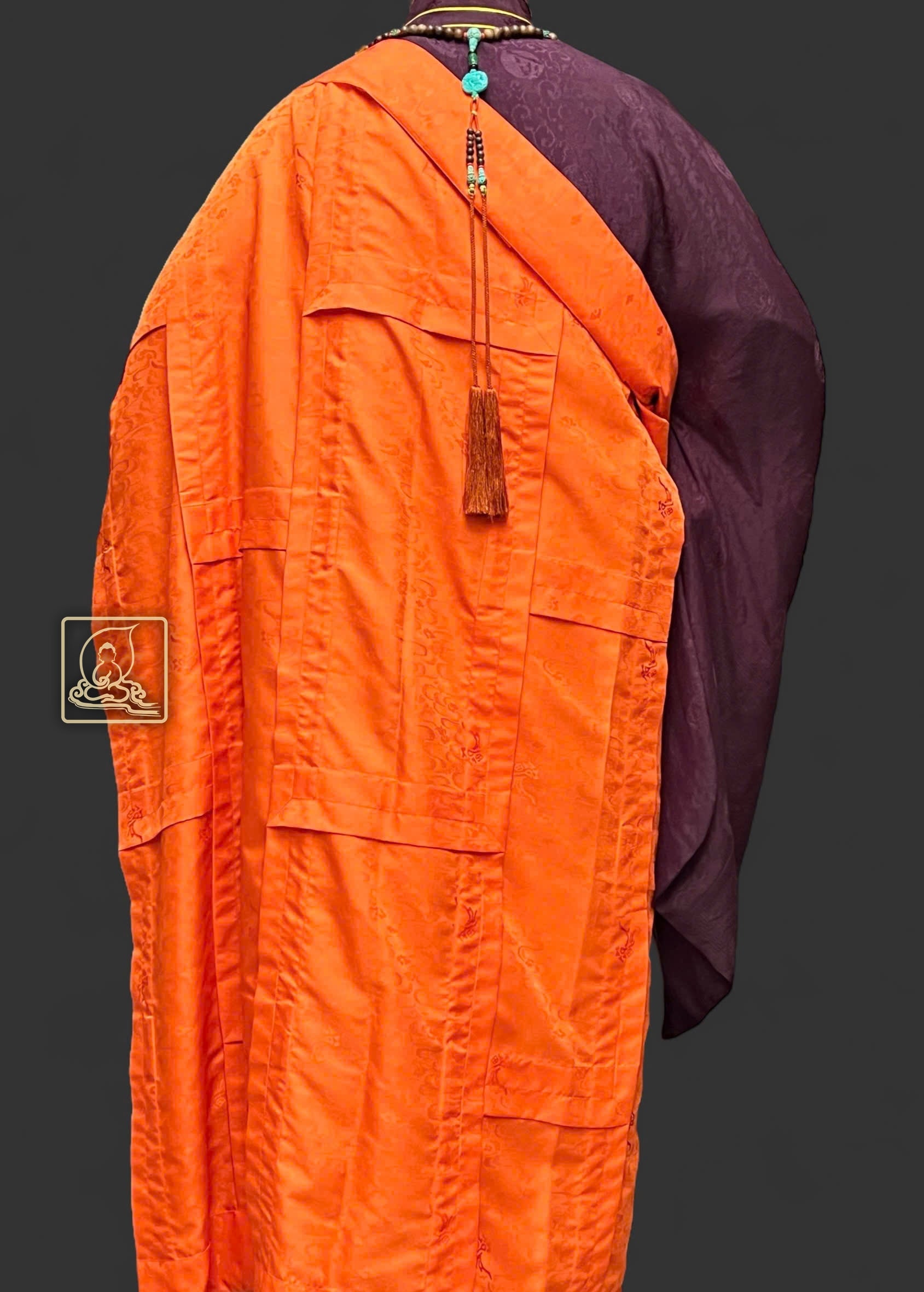 Đại thừa phương tiện pháp y được may tỉ mỉ theo lối y thời Đường (vốn đã mai mọt từ lâu ở một số quốc gia) từ chất liệu sa dệt từ sợi tự nhiên có hoa văn ẩn kết hợp cùng điều y theo lối may chằn điệp làm điểm nhấn nỗi bật của Pháp y. Pháp y phối hợp cùng áo hậu cũng được may từ chất liệu vải sa dệt họa tiết hoa văn rồng đặc sắc, phần cổ áo may theo form dáng chuẩn thẳng tâm khi mặc, phối hợp với pháp y tạo nên một bộ hoàn chỉnh. Mang tông màu sắc cam thích hợp trong những đàn tràng pháp sự cúng Phật, khai kinh hoặc Dược Sư pháp hội.