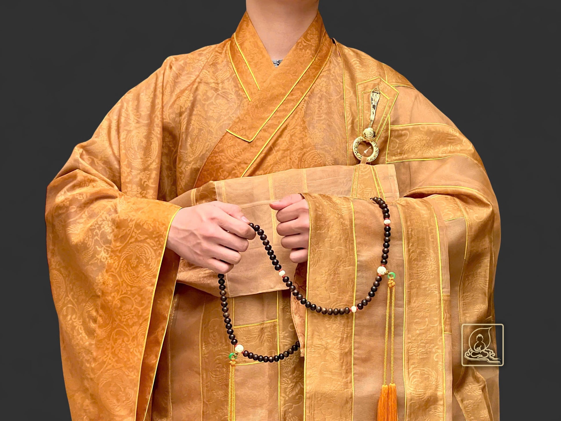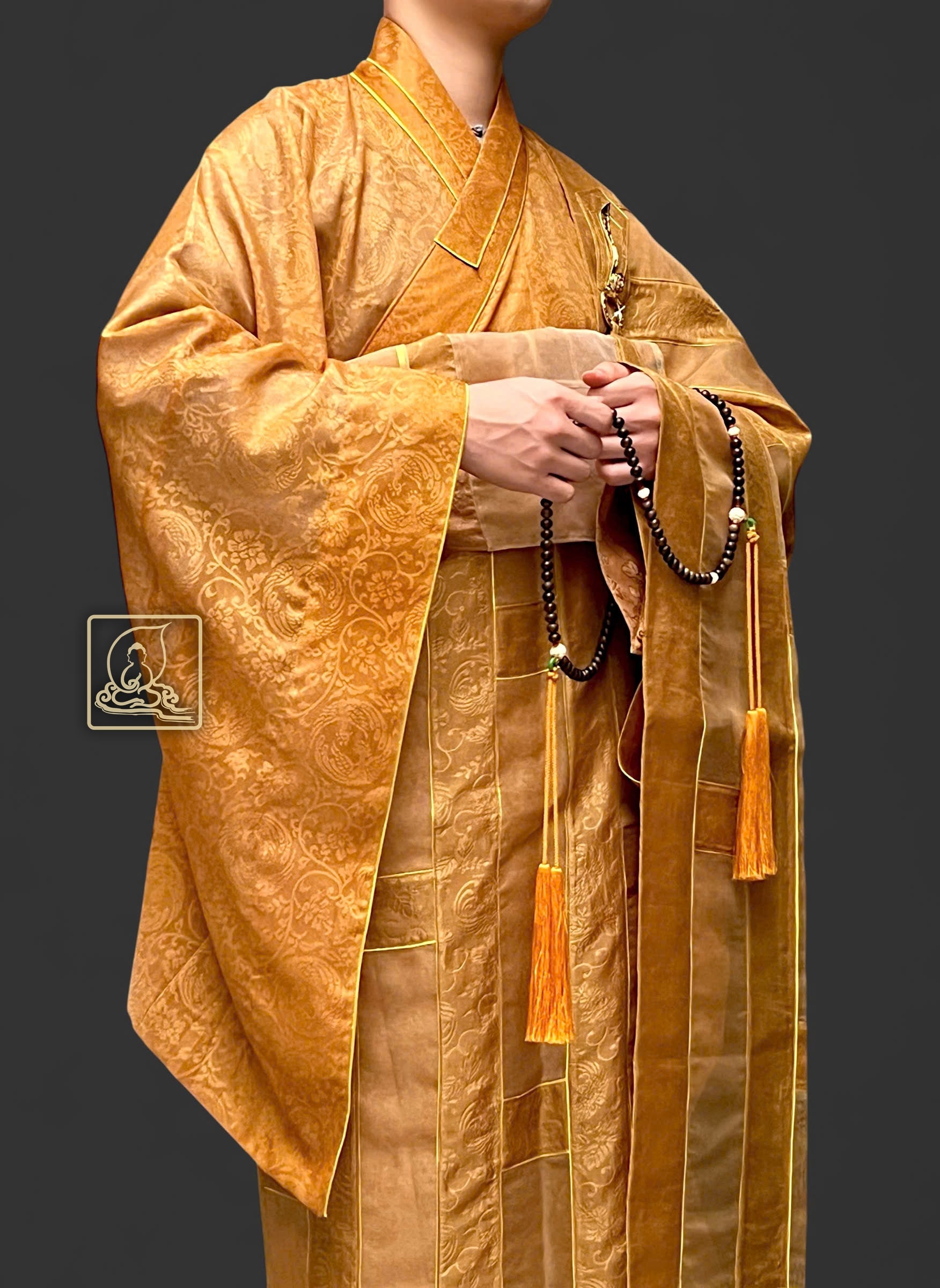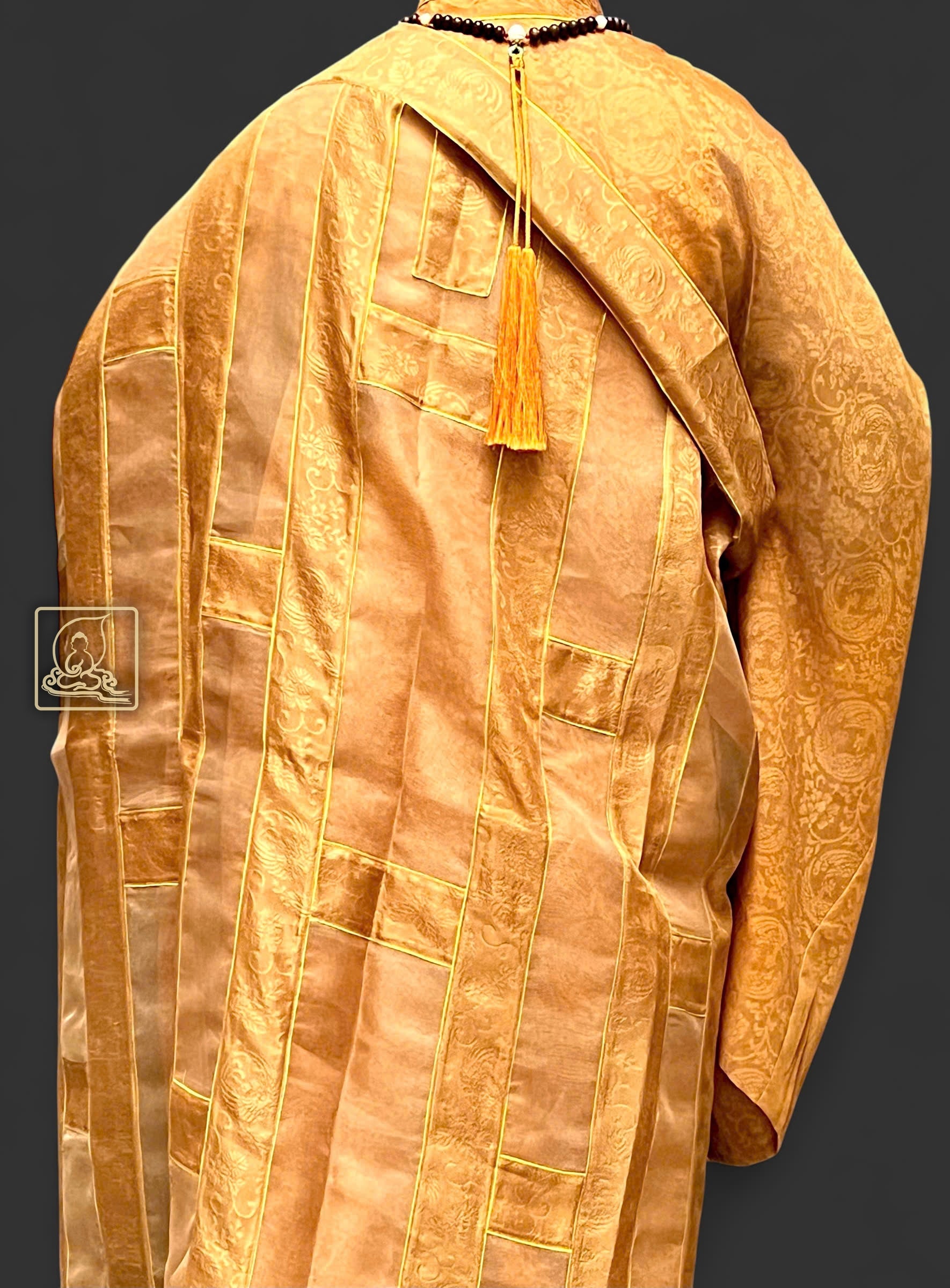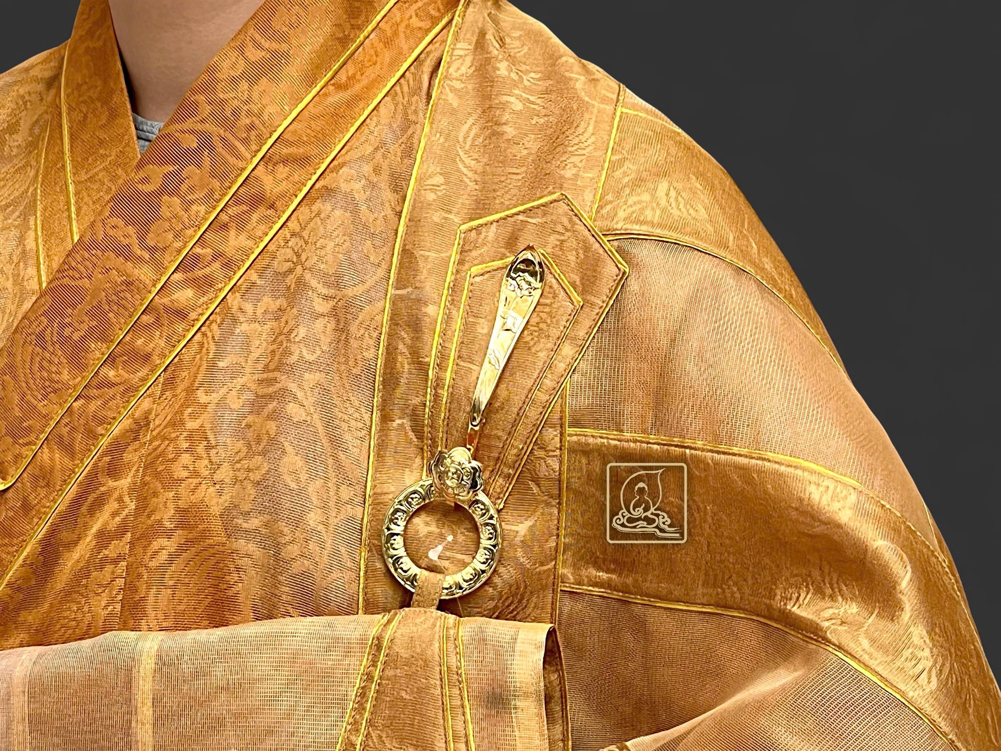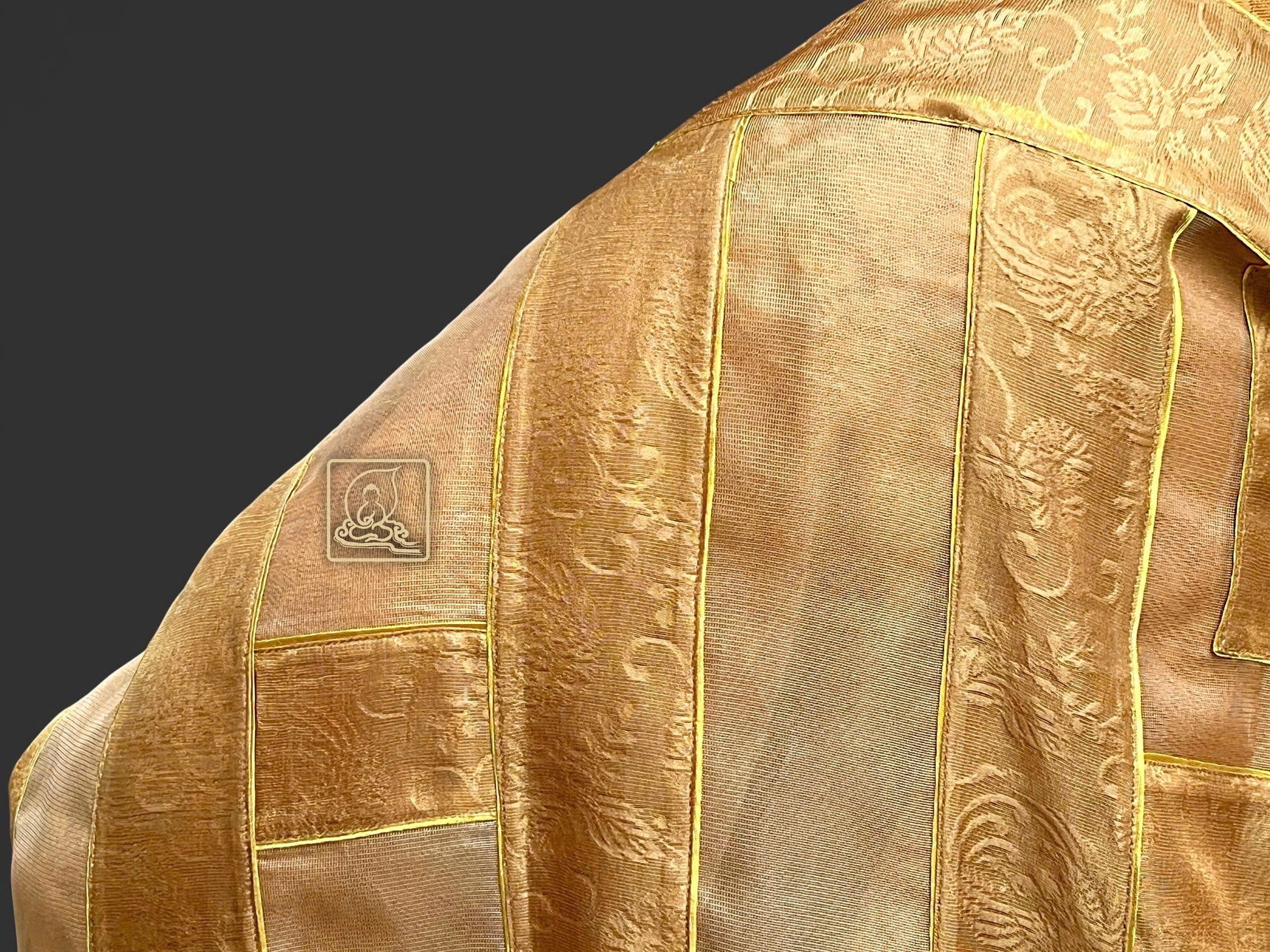 Pháp y được cẩn chế từ chất liệu sa Nhật dệt từ sợi tự nhiên có độ nhẹ, mềm và thoáng mát, với họa tiết hoa văn phượng được làm phần thành và điều y. Pháp y may theo phương pháp nhíp điệp, phối hợp cùng áo hậu sa màu sắc vàng tạo nên sắc màu trang nhã, giúp trang nghiêm Tăng tướng chư Tôn Đức sám chủ.
