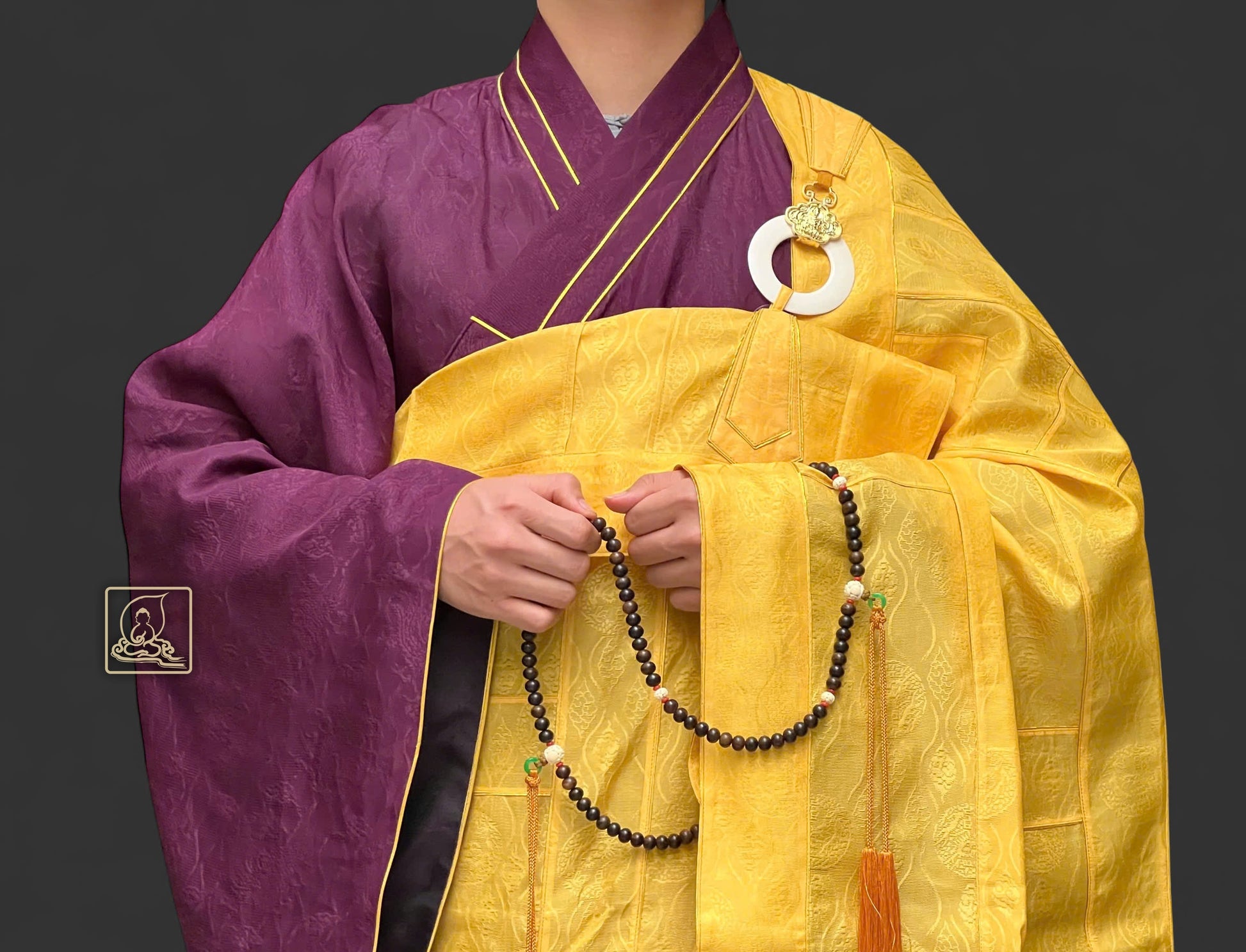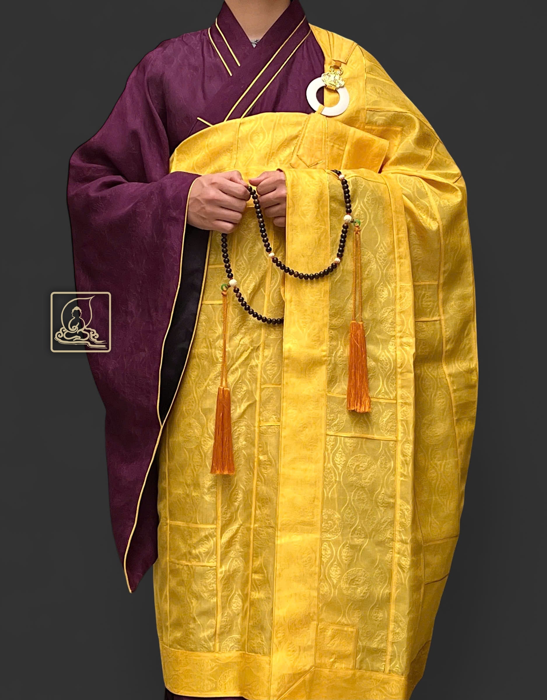 Pháp y được cẩn chế từ chất liệu sa Nhật Nhật dệt từ sợi tự nhiên có độ nhẹ, mềm và thoáng mát, với họa tiết hoa văn rồng dệt ẩn. Pháp y may theo phương pháp nhíp điệp, phối hợp cùng áo hậu sa Nhật màu sắc tím tạo nên sắc màu trang nhã, giúp trang nghiêm Tăng tướng chư Tôn Đức sám chủ.