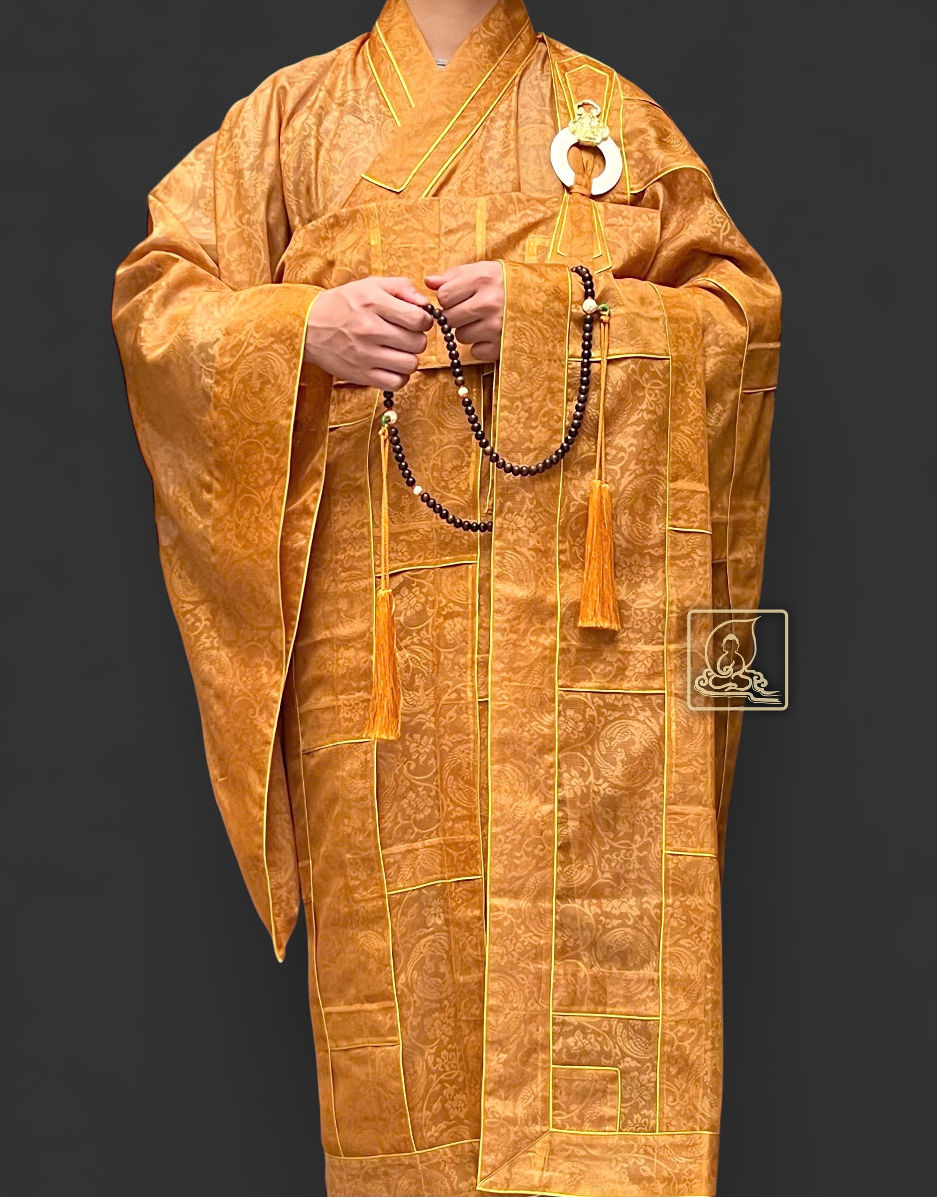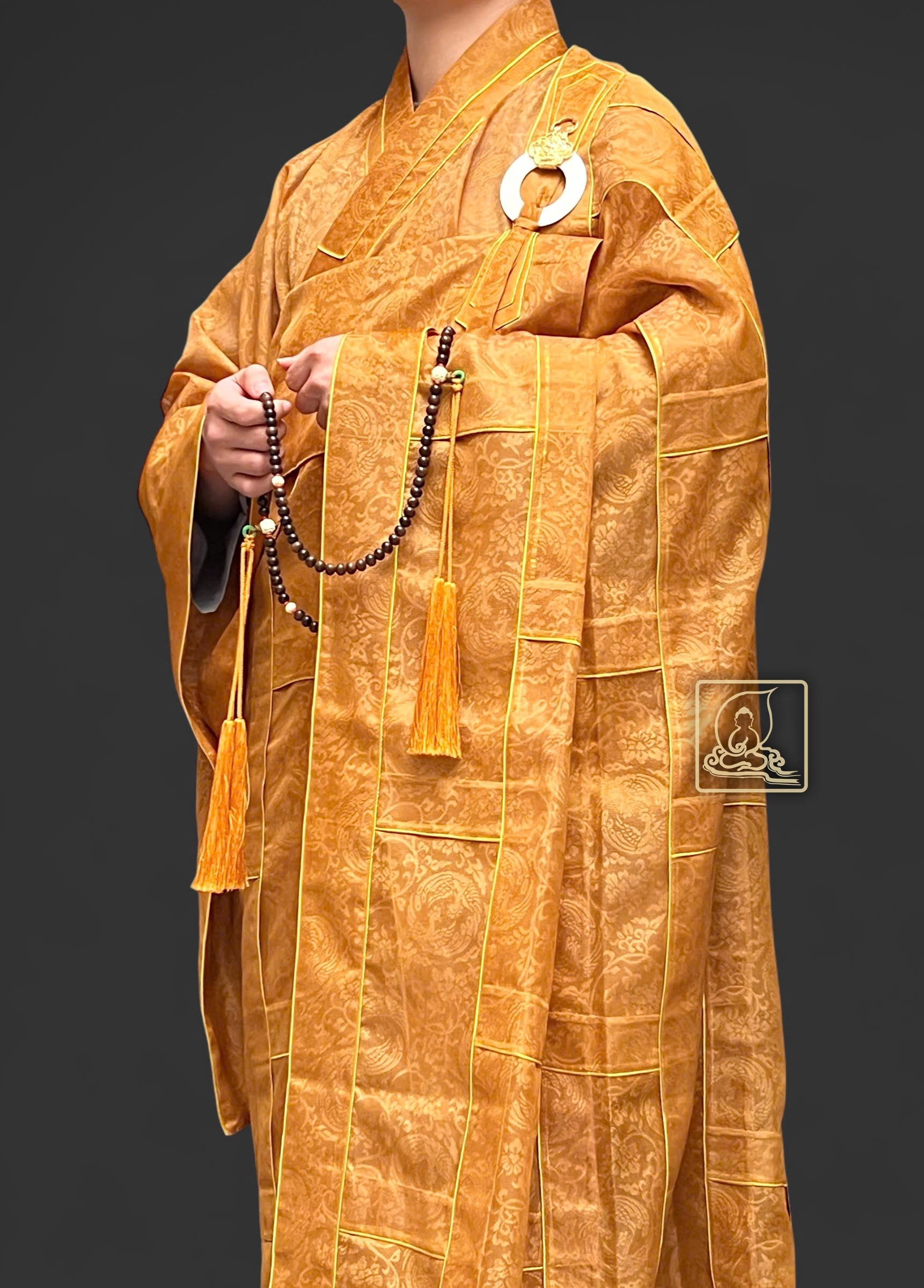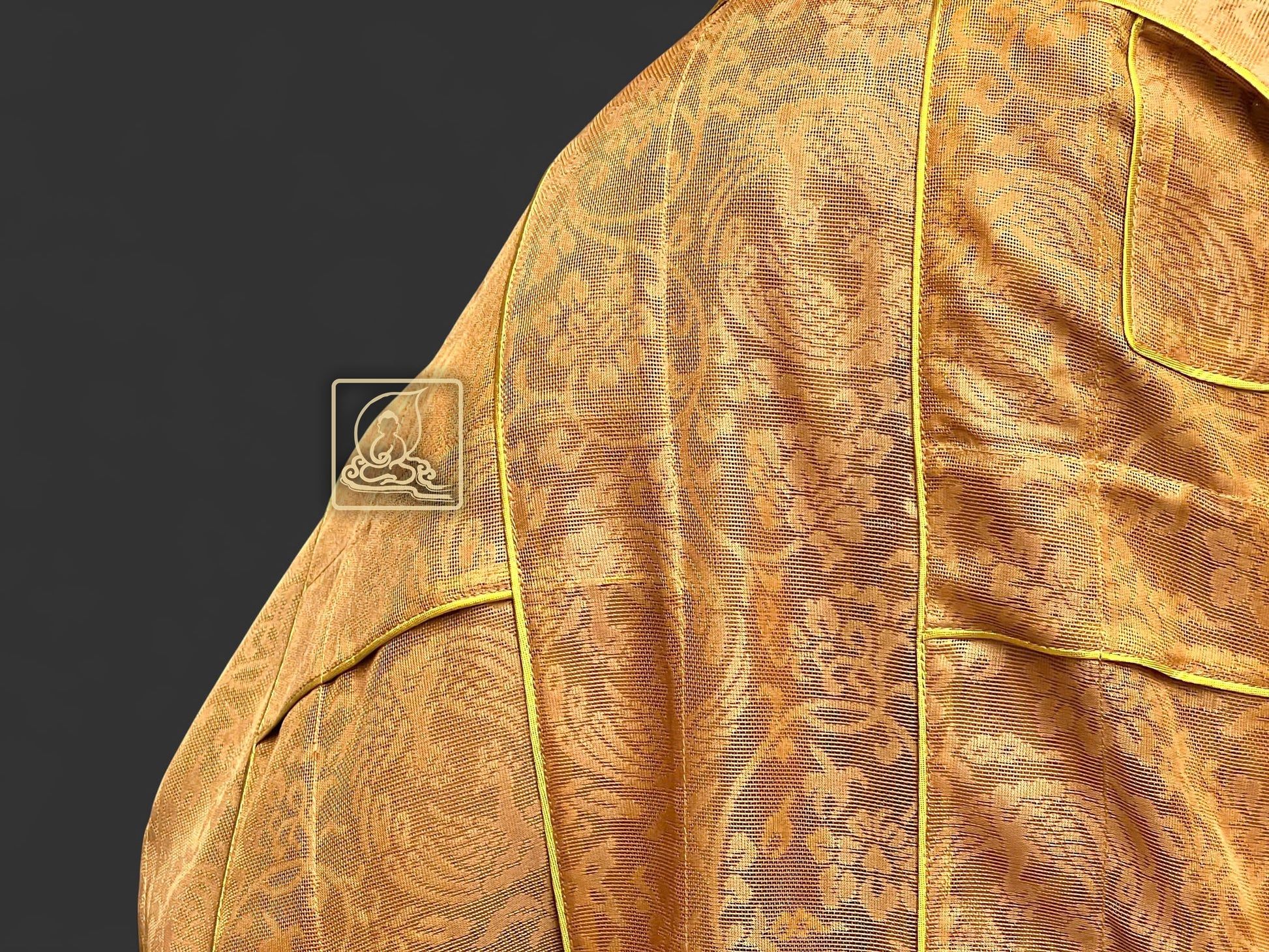 Pháp y được cẩn chế từ chất liệu sa Nhật dệt từ sợi tự nhiên có độ nhẹ, mềm và thoáng mát, với họa tiết hoa văn phượng được làm phần thành và điều y. Pháp y may theo phương pháp mã sỉ (chỗ hở dính), phối hợp cùng áo hậu sa màu sắc vàng tạo nên sắc màu trang nhã, giúp trang nghiêm Tăng tướng chư Tôn Đức sám chủ.
