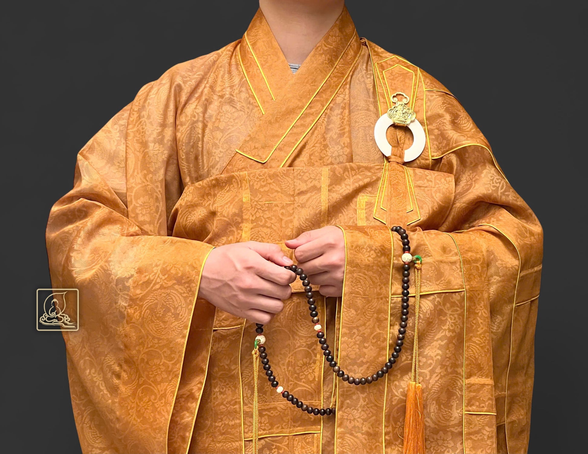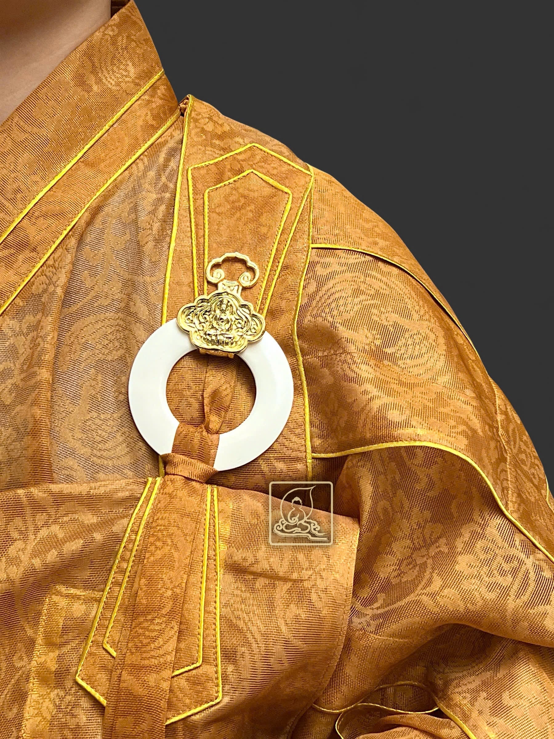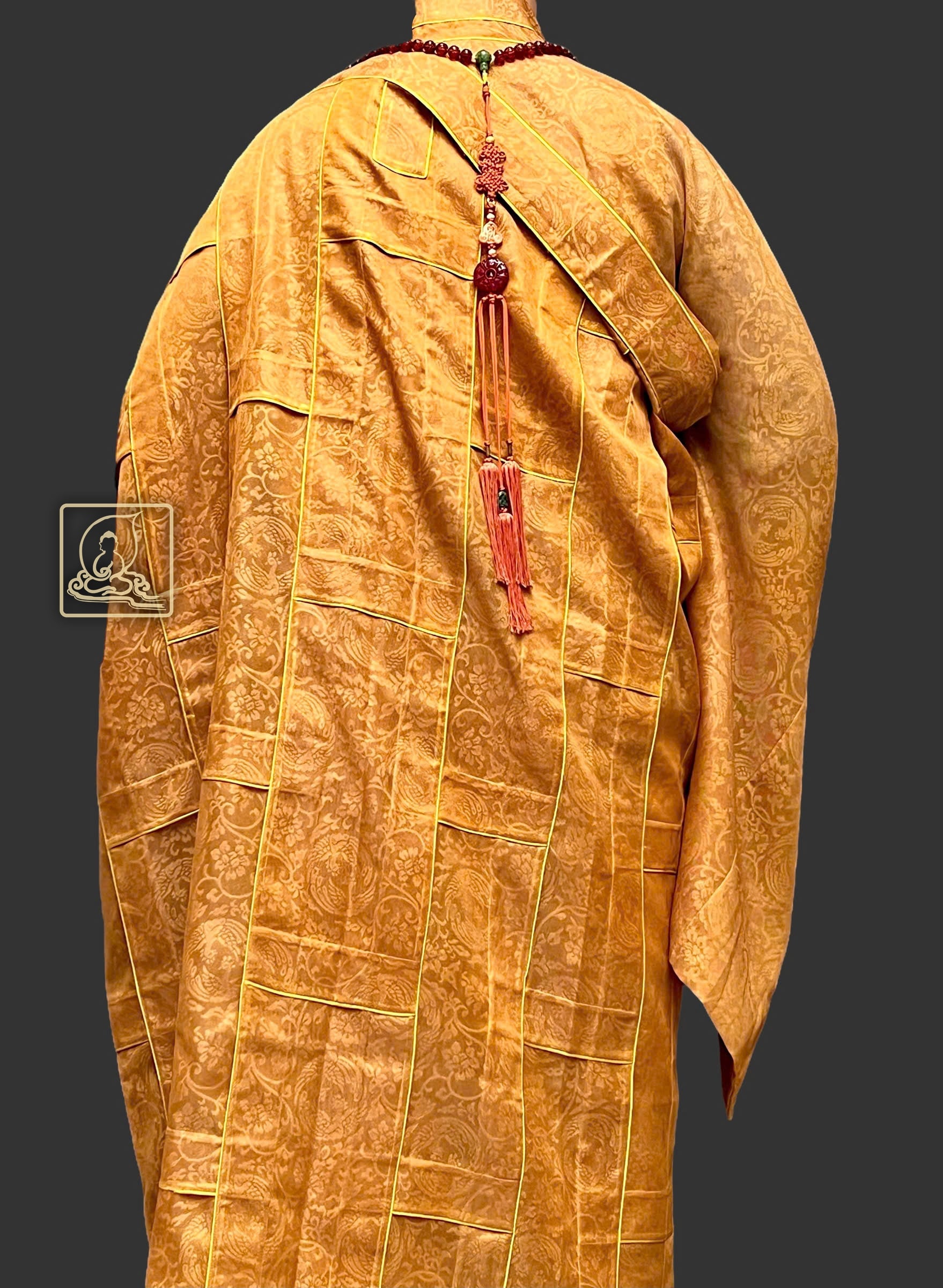 Pháp y được cẩn chế từ chất liệu sa Nhật dệt từ sợi tự nhiên có độ nhẹ, mềm và thoáng mát, với họa tiết hoa văn phượng được làm phần thành và điều y. Pháp y may theo phương pháp mã sỉ (chỗ hở dính), phối hợp cùng áo hậu sa màu sắc vàng tạo nên sắc màu trang nhã, giúp trang nghiêm Tăng tướng chư Tôn Đức sám chủ.