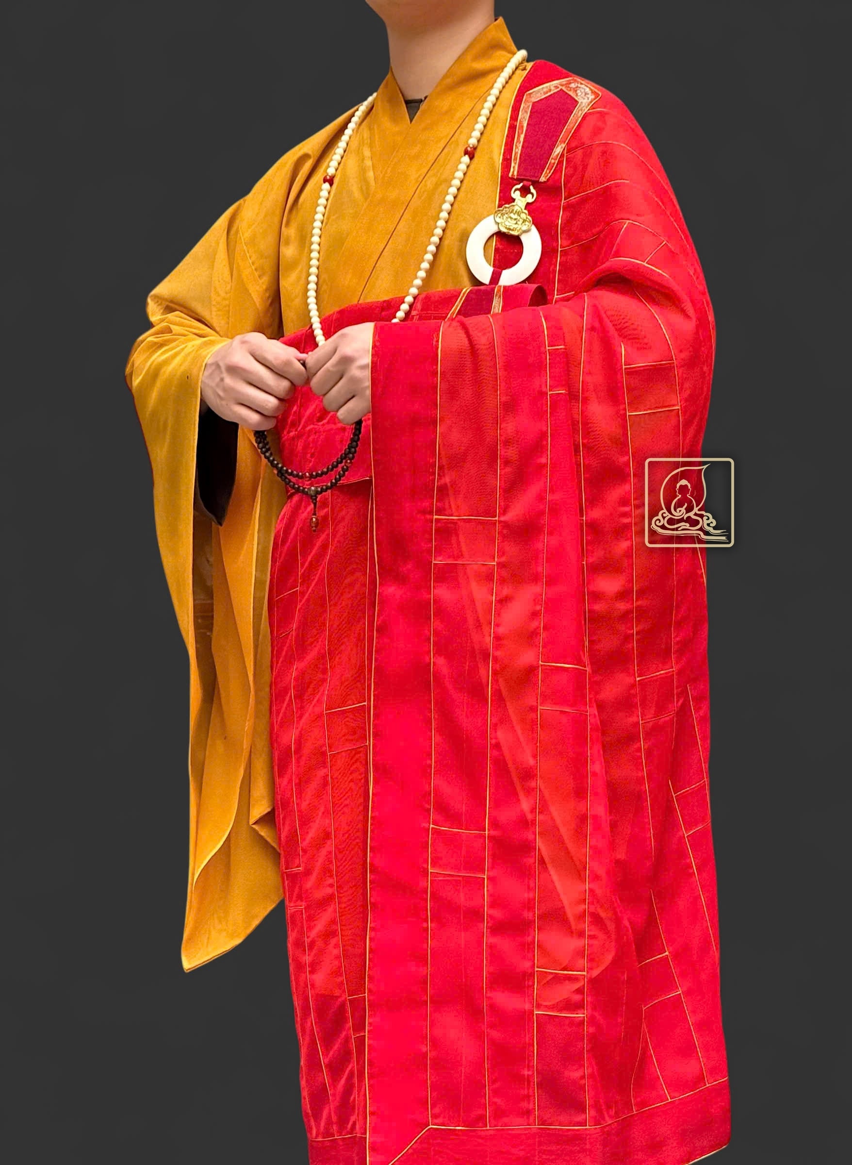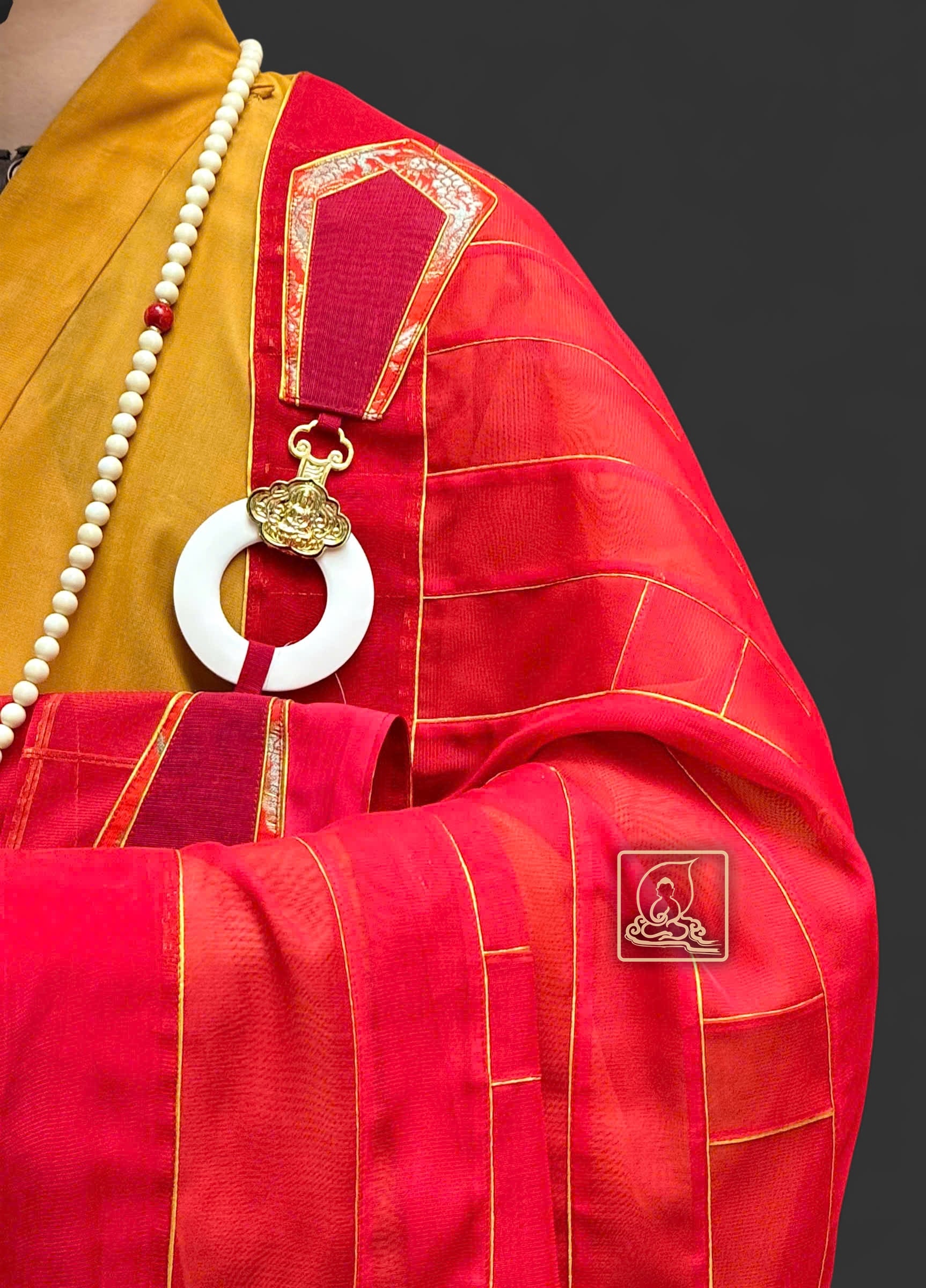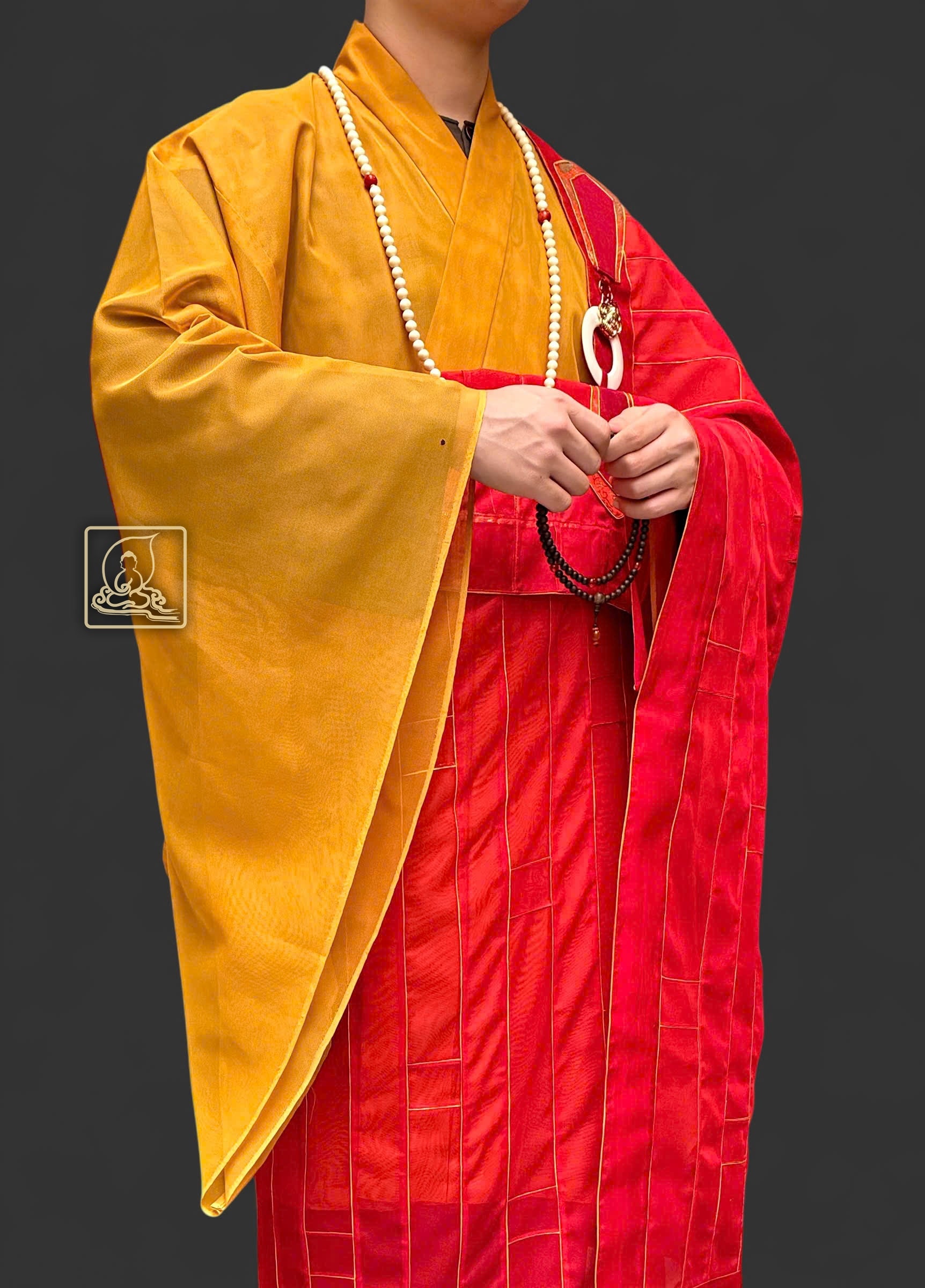 Phần viền chỉ vàng và bần bà móc y đồng tạo điểm nhấn tinh tế, làm nổi bật nét trang nghiêm của chư Tăng khi khoác y hành lễ. Khi phối cùng áo hậu sa Nhật màu vàng, pháp y ca sa càng toát lên vẻ uy nghi, thanh thoát.