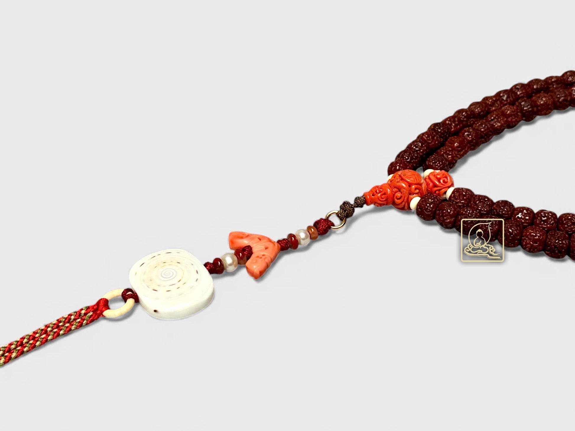 The mala is crafted from rare five-faced ancient Rudraksha beads, highlighted by a hand-carved red coral separator engraved with the character “壽” symbolizing longevity, peace, and good fortune. Five-faced Rudraksha carries strong protective energy, helping dispel negativity and bring calmness, confidence, and inner balance.