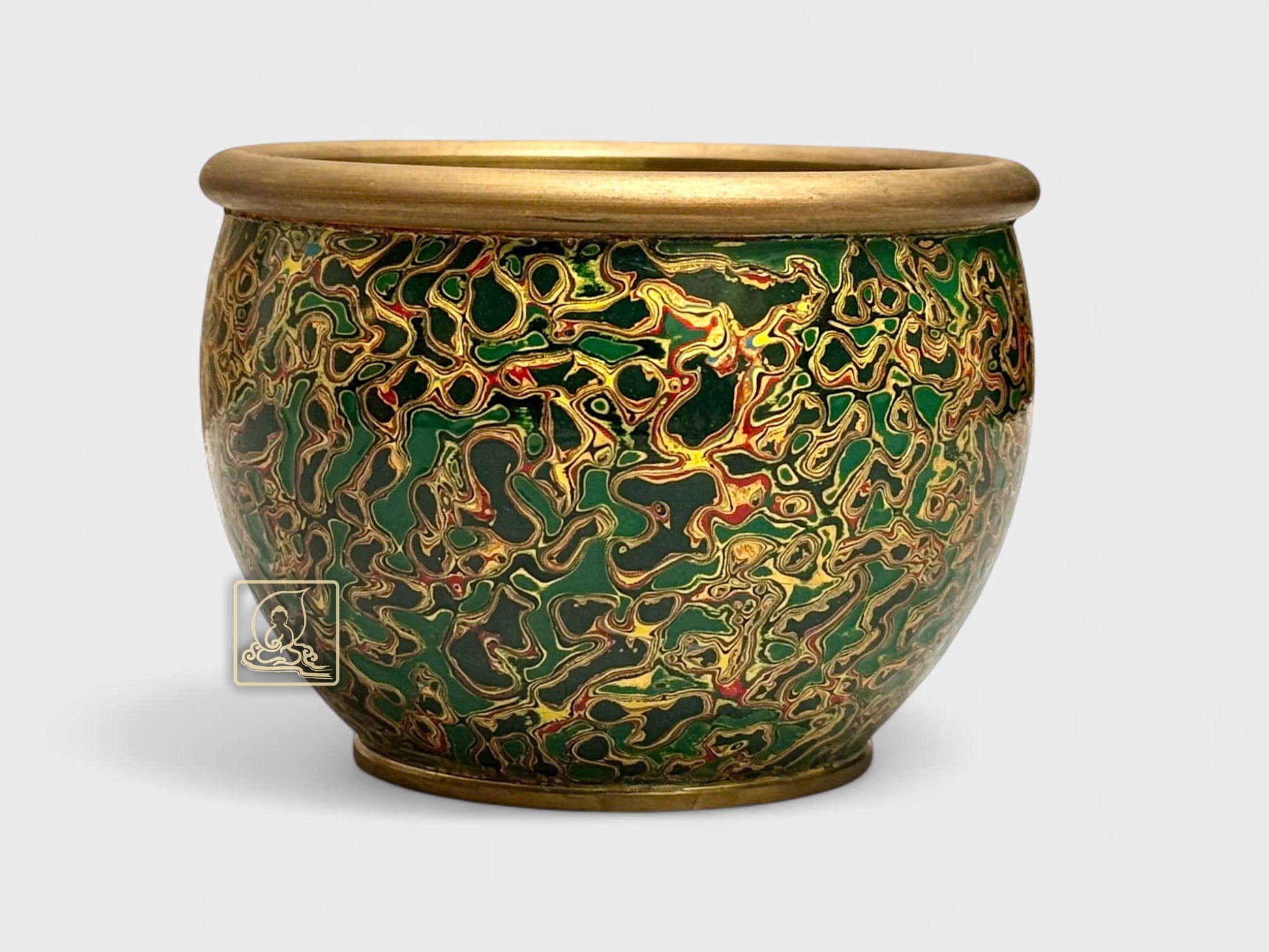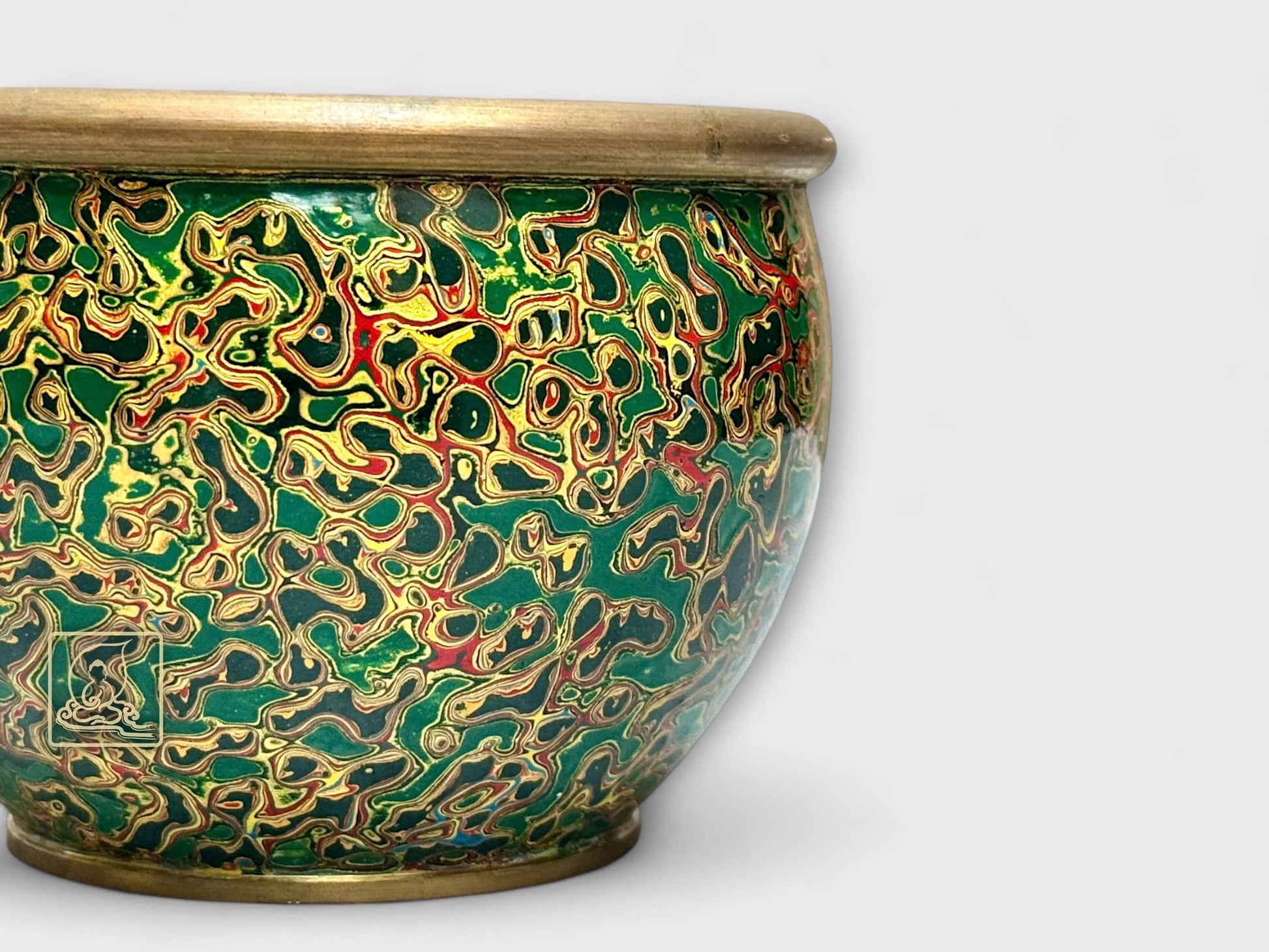 The enameled bronze technique involves forming intricate patterns using fine copper filaments attached to a bronze base. These sections are then filled with multi-colored enamel, fired multiple times in a kiln until the enamel reaches perfect thickness and sheen. Finally, the surface is polished and the copper lines gilded with gold, resulting in a flawless, radiant work of art.