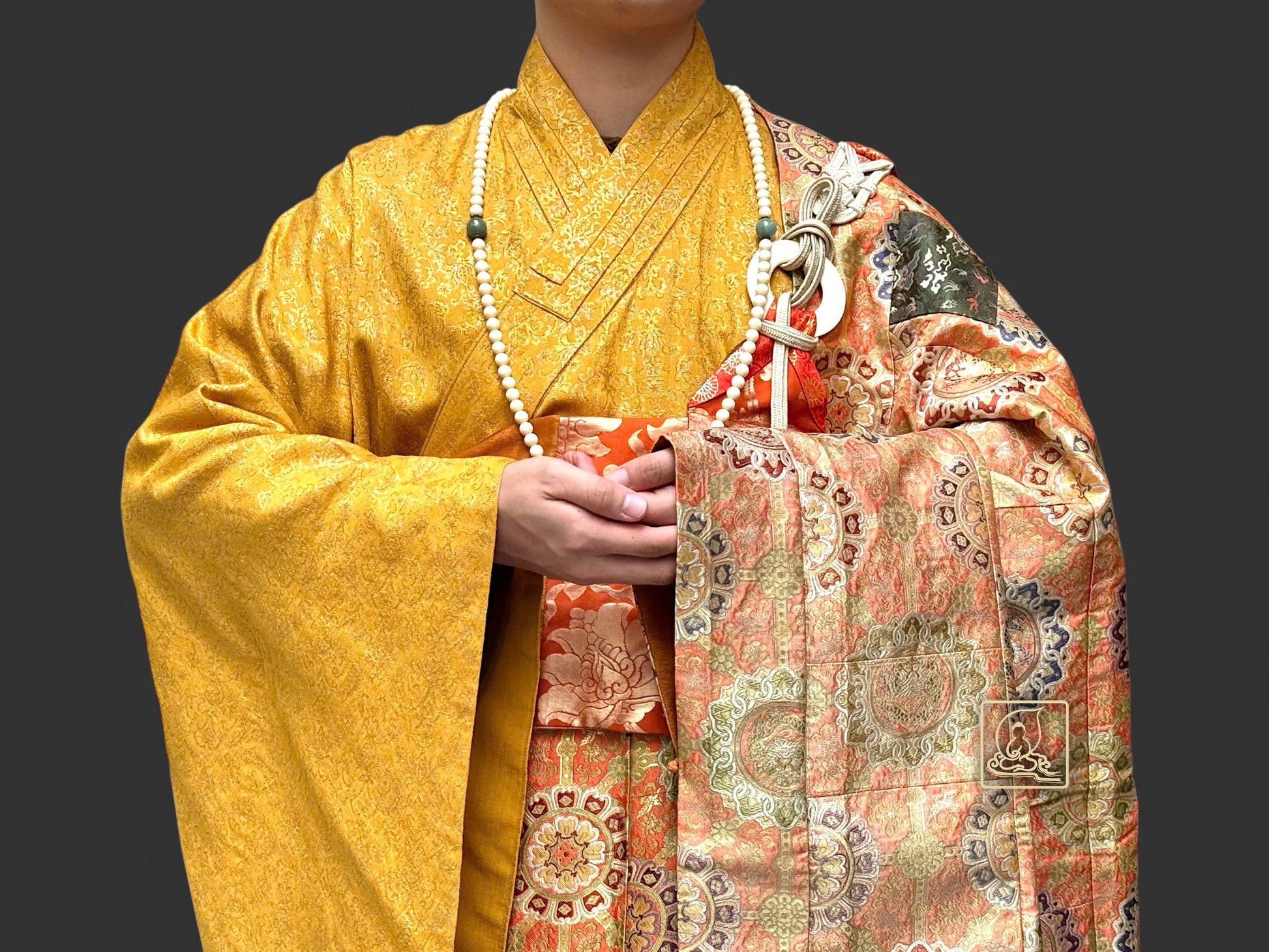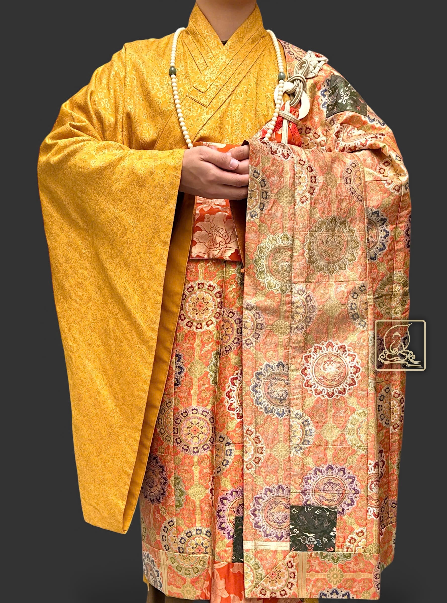 Pháp y được cẩn chế theo lối y thời Đường với những đường may tinh tế, tỉ mỉ trên chất liệu gấm Nhật xưa dệt thủ công họa tiết hoa văn Mandala ngũ sắc kết hợp sợi chỉ vàng. Thành và nền y được may cùng một chất liệu, phối hợp cùng áo hậu gấm Nhật màu sắc vàng tạo nên tông màu cổ kính, trang nhã. Pháp y ngoài giúp trang nghiêm Tăng tướng chư Tôn Đức, còn góp phần trang nghiêm pháp hội.