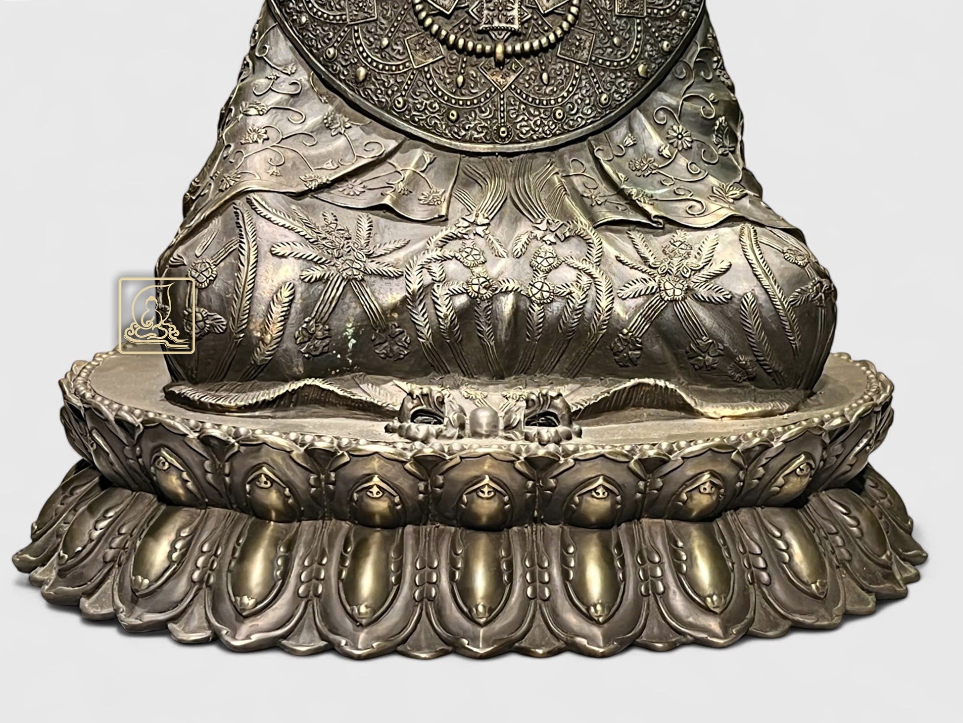 The Shakyamuni Buddha statue is meticulously crafted from bronze, featuring a serene and dignified expression in the esoteric form. The Buddha is depicted in the full-lotus posture, wearing a jeweled crown, with the body adorned in elegant ornaments symbolizing the perfected Sambhogakāya.