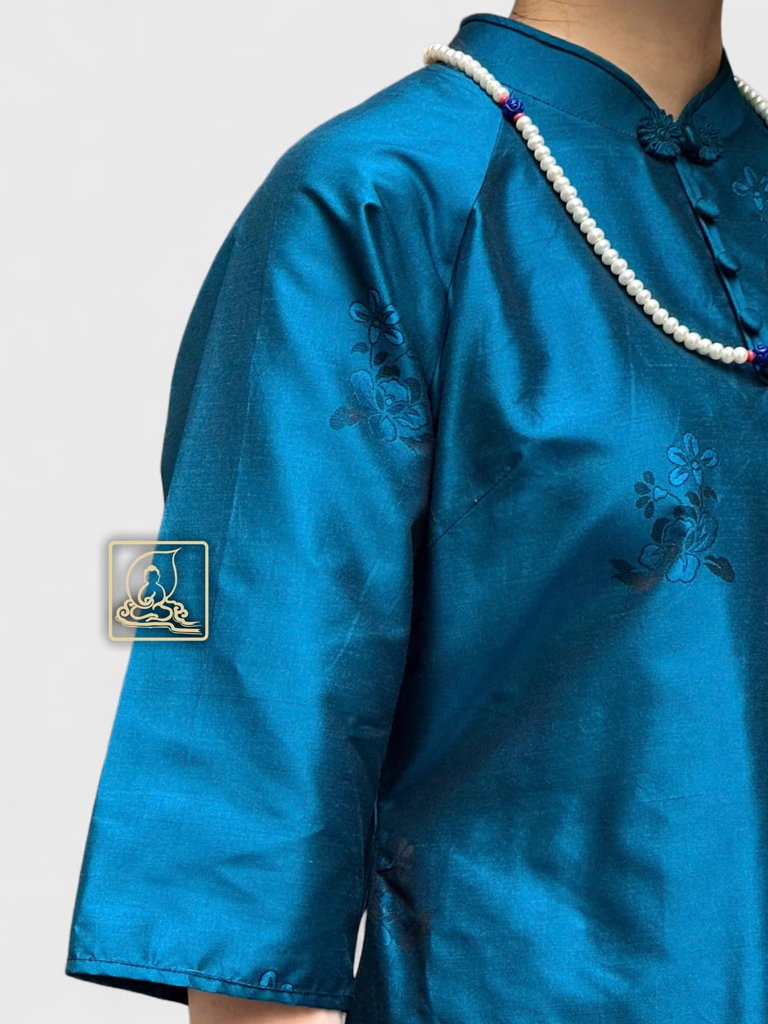 Qua sự bàn tay khéo léo và ý tưởng độc đáo từ nhà thiết kế Phạm Nghiêm Trai đã biến những mảnh vải thành một chiếc áo dài độc đáo. Chiếc áo được may từ chất liệu gấm Hàn dệt họa tiết hoa văn ẩn mang màu sắc xanh. Kết hợp phần cổ áo theo dáng cổ trụ ôm sát tôn thêm dáng tạo điểm nhấn đắc sắc với những chiếc nút thắt.
