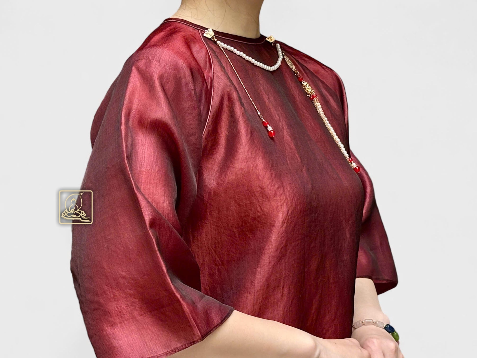 Phạm Nghiêm Trai introduces a new áo dài design made from soft gauze fabric blended with silk in a gentle pink tone. The double-layer style and delicate collar detail create an elegant yet simple look — reflecting the purity and mindfulness of a devoted practitioner.