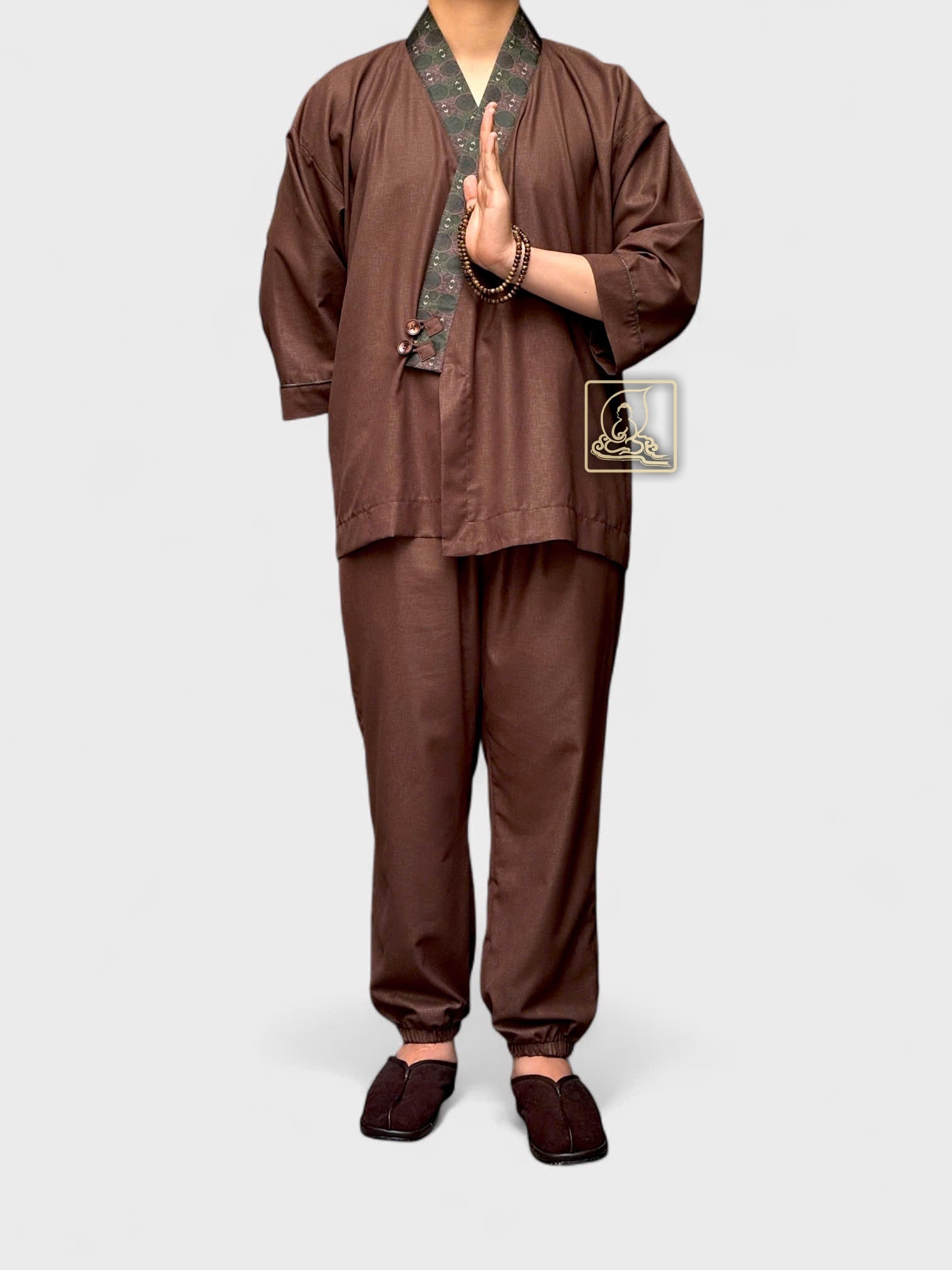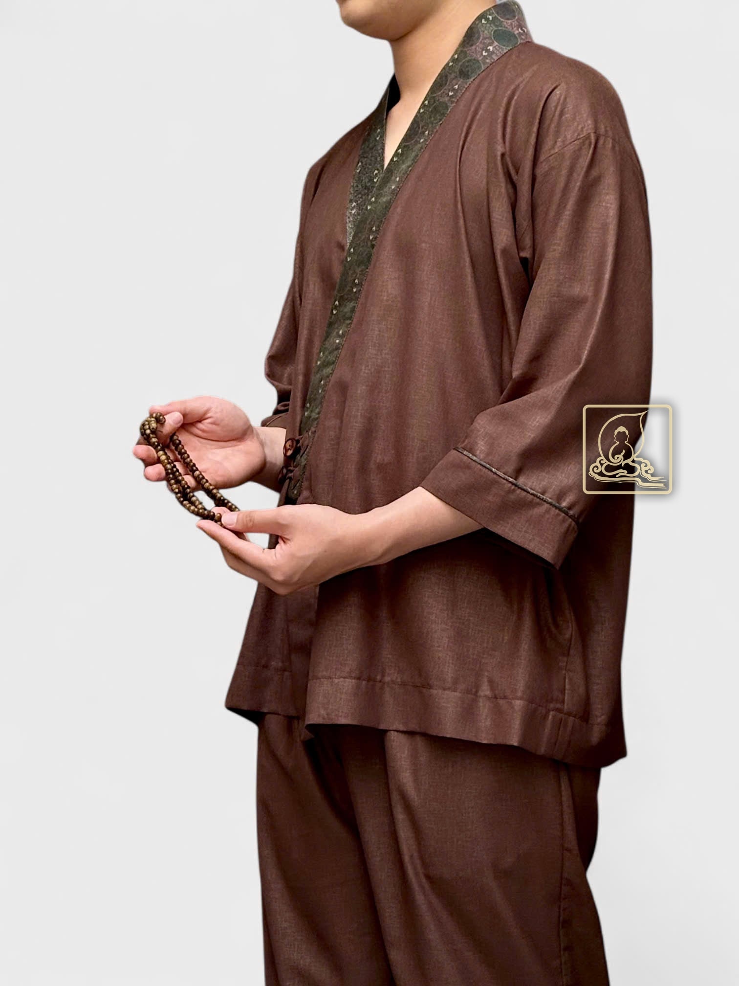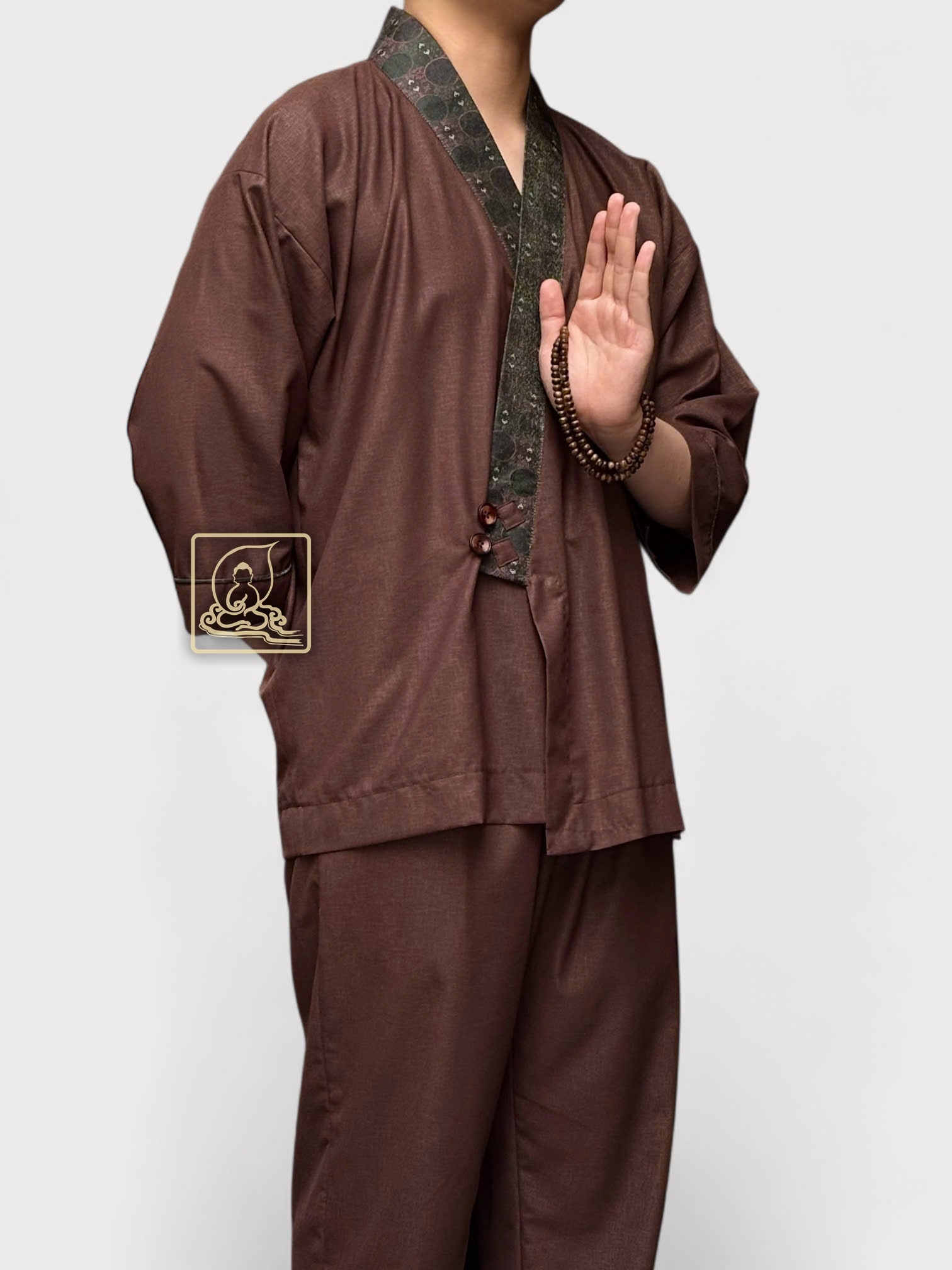 This men’s Buddhist outfit is made from dark brown cotton that feels soft, cool, and comfortable to wear. The collar is decorated with patterned brocade, adding a gentle and elegant touch that suits the peaceful temple setting.