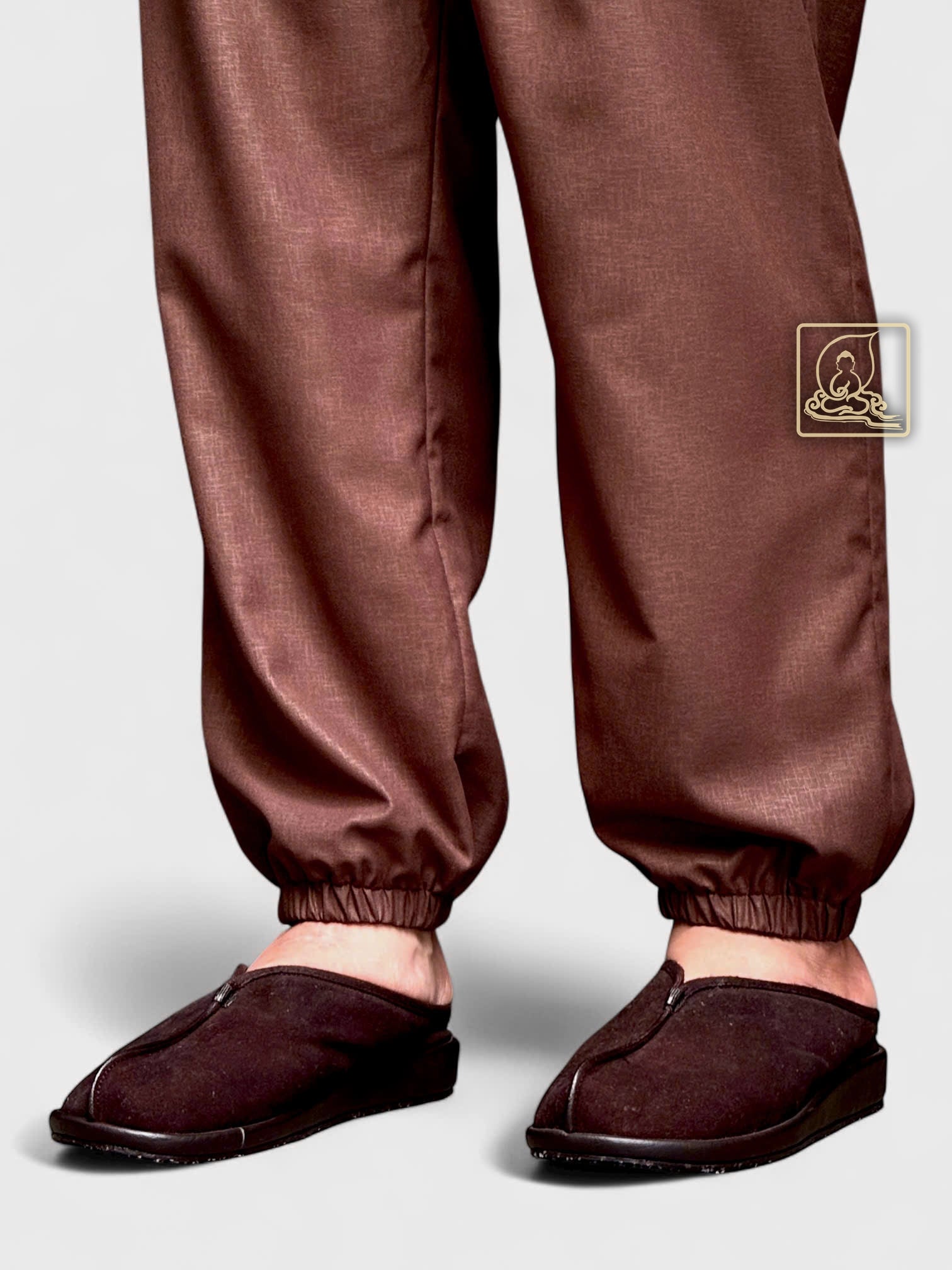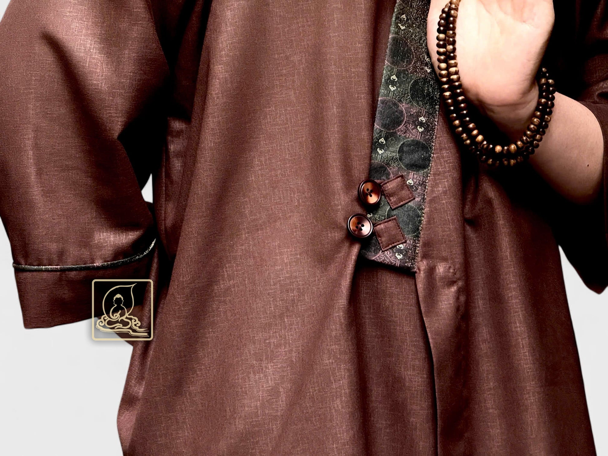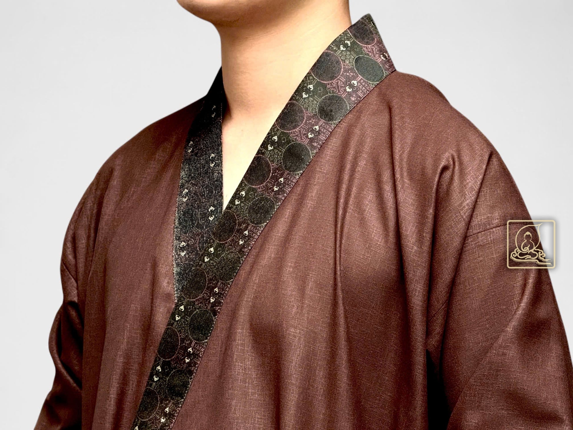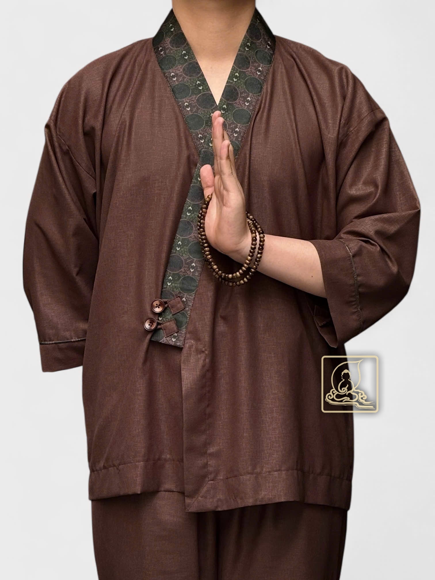 This men’s Buddhist outfit is made from dark brown cotton that feels soft, cool, and comfortable to wear. The collar is decorated with patterned brocade, adding a gentle and elegant touch that suits the peaceful temple setting.