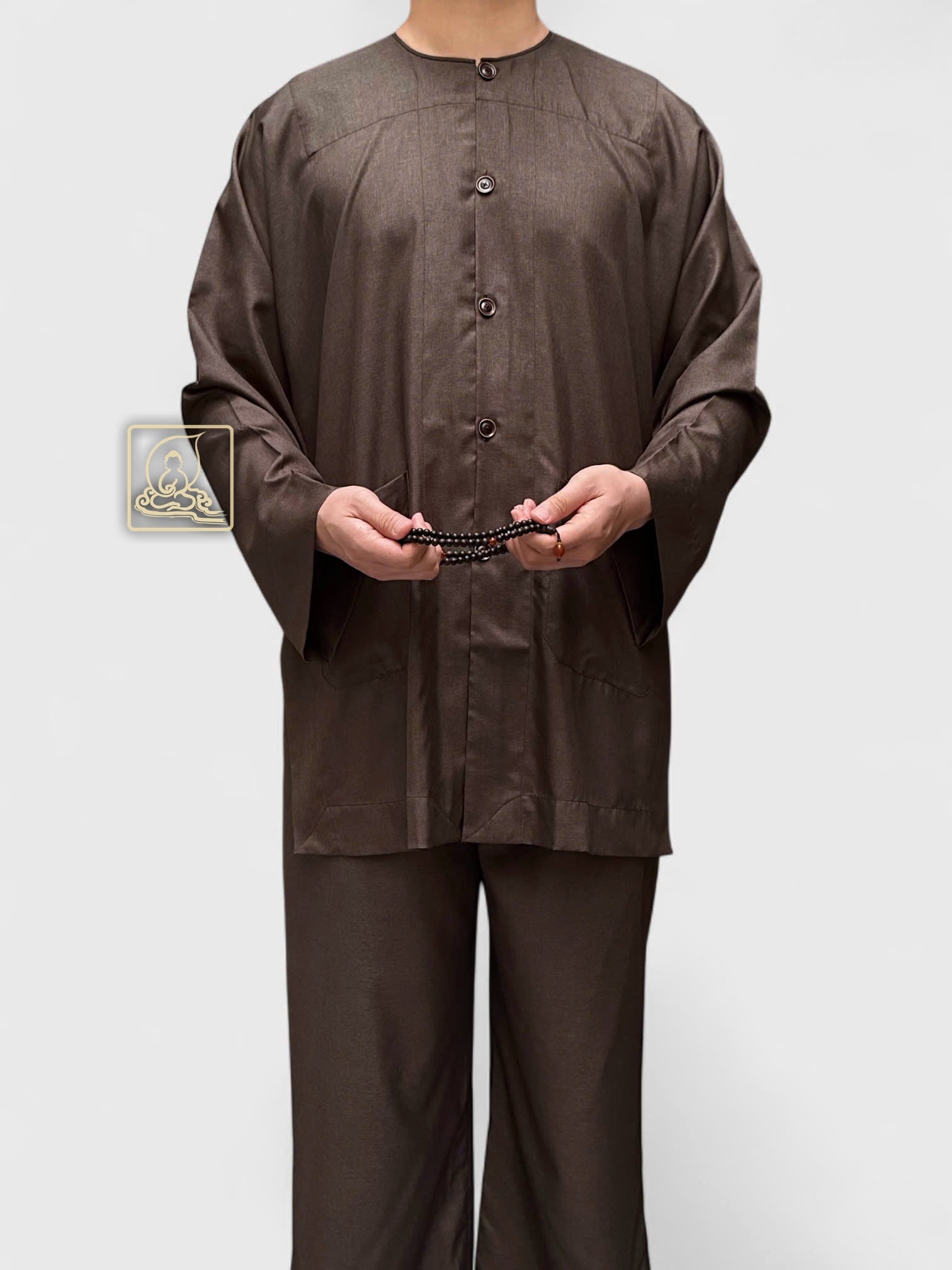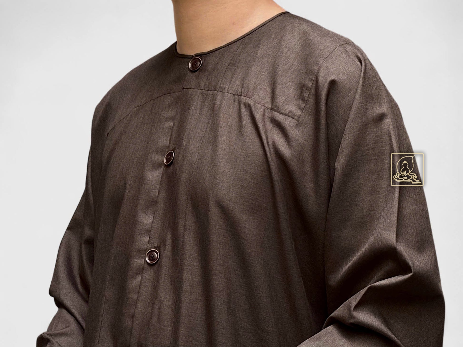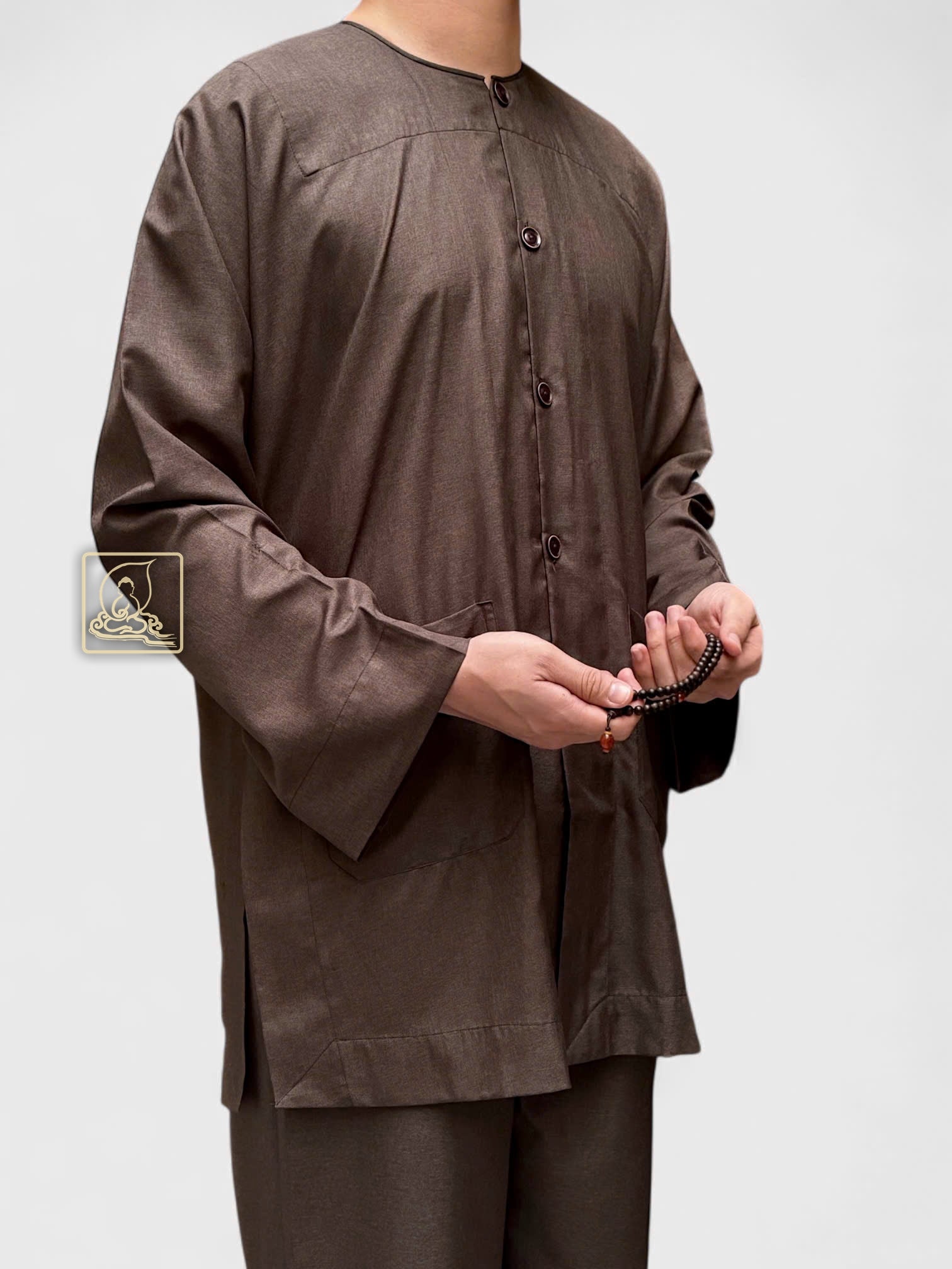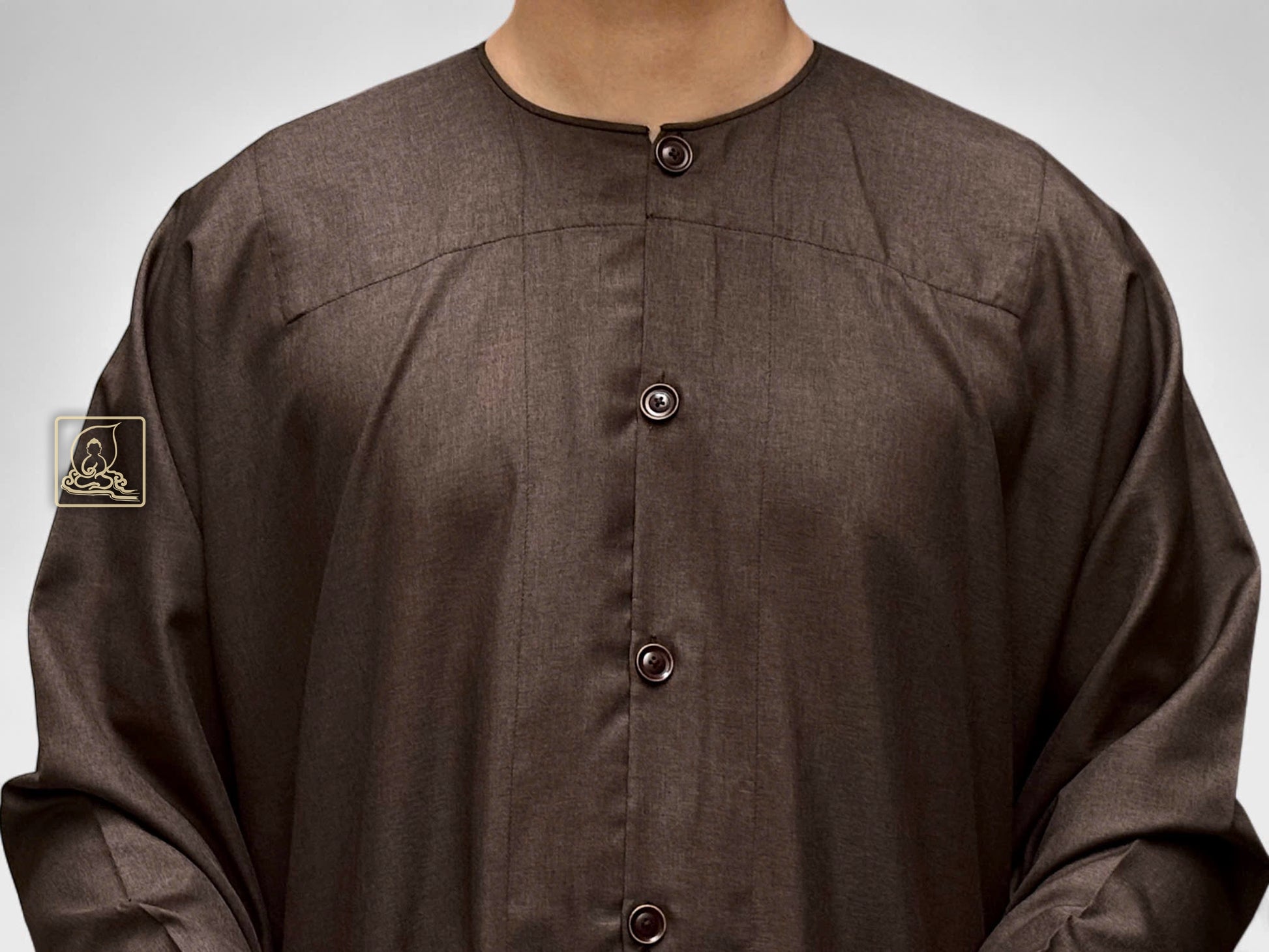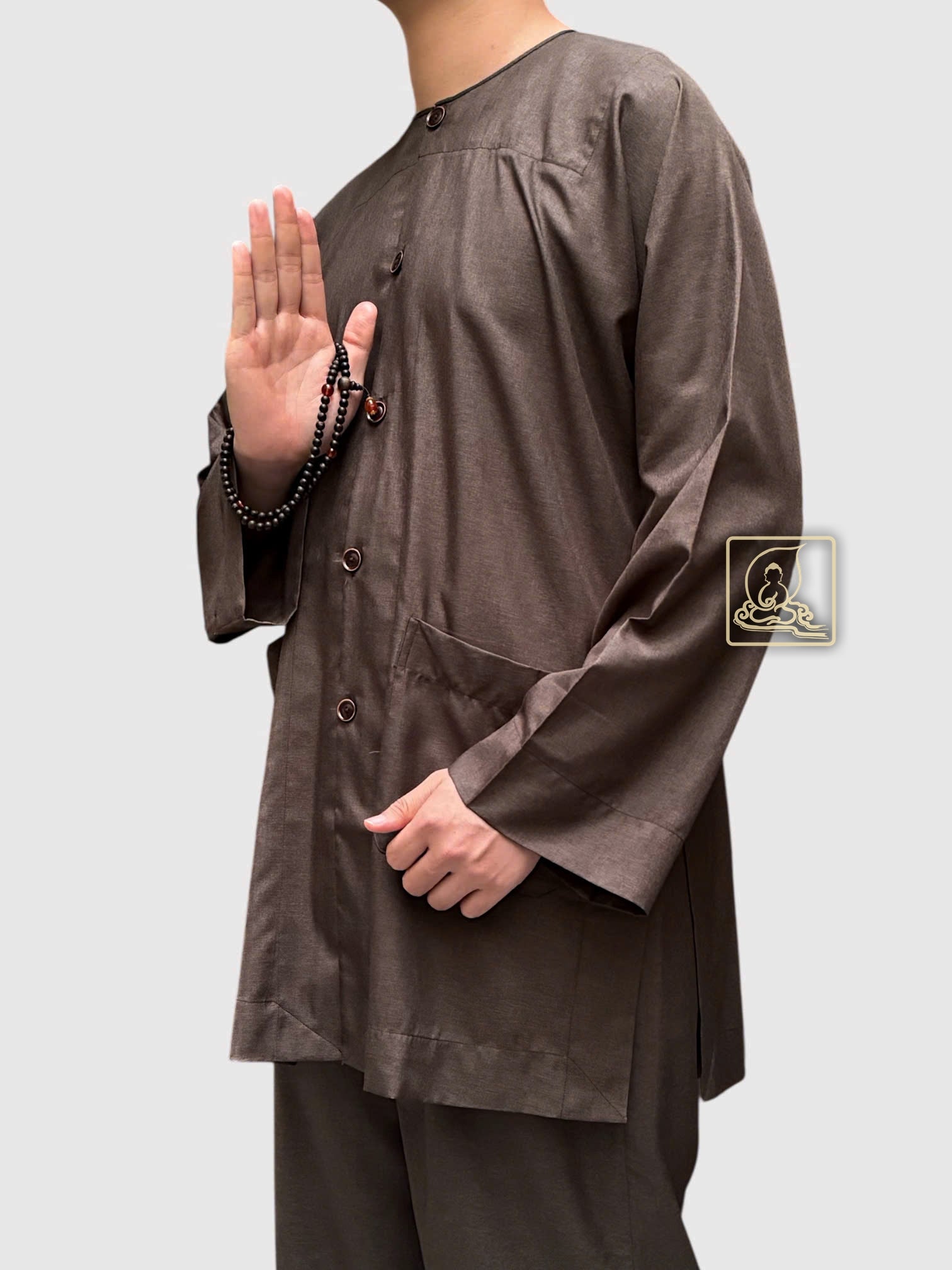 Áo cổ tròn, nút khuy gài tạo điểm nhấn tinh tế, vừa giữ được nét truyền thống vừa mang lại sự tiện dụng và chỉnh tề. Đây là lựa chọn lý tưởng dành cho Phật tử nam yêu thích phong cách thanh nhã, thể hiện tâm thành kính qua từng nếp áo.