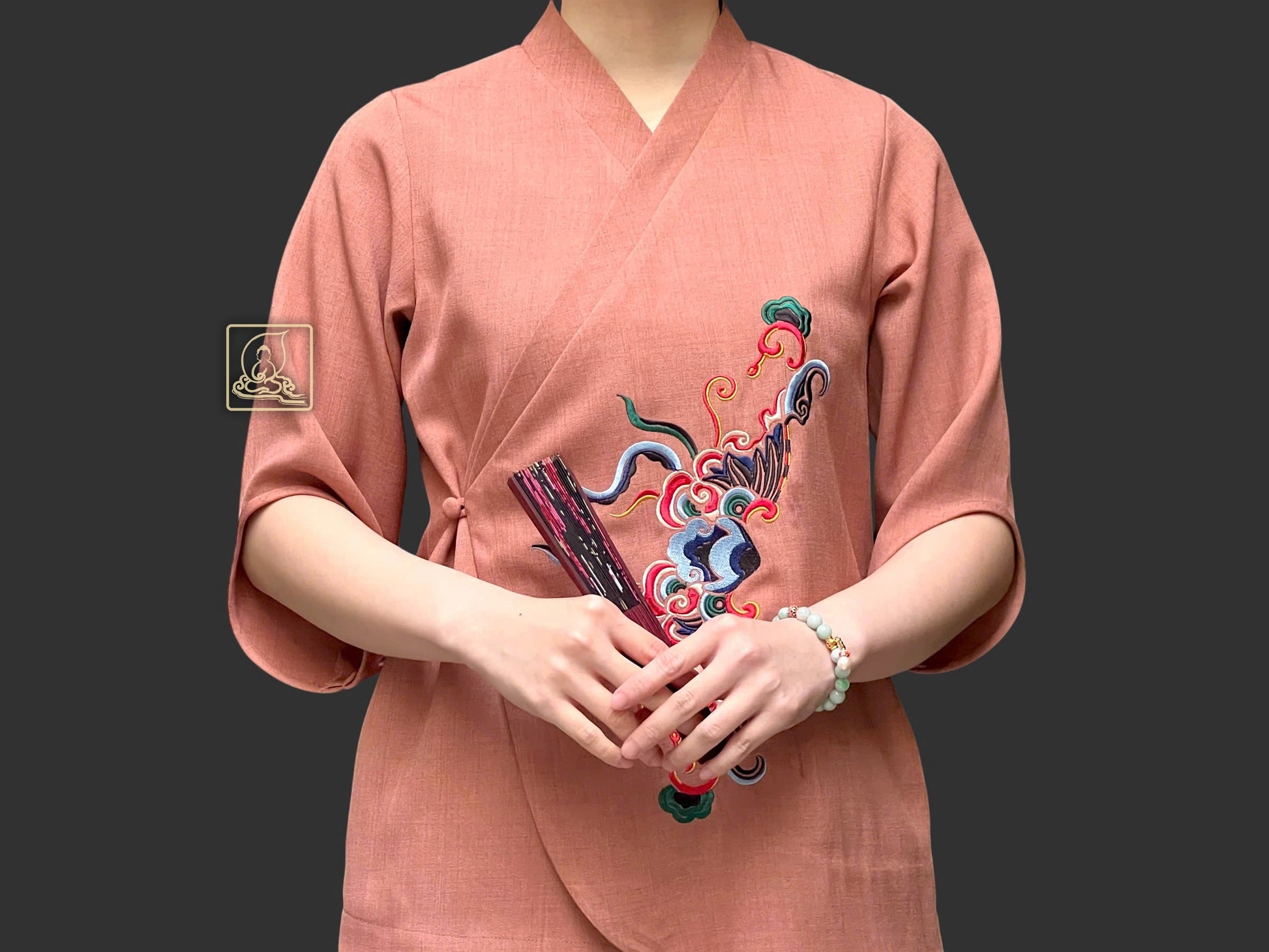 Mẫu trang phục nữ được thiết kế với kiểu dáng vạt chéo từ chất vải bố thun được nhập ngoại, kết hợp họa tiết hoa văn Dơi (phúc tinh) mang biểu tượng của sự may mắn. Vải bố thun là một trong những loại vải được ưa chuộng trong ngành may mặc. Với vẻ ngoài mộc mạc, vải bố thun còn mang đến sự trang trọng, tinh tế và là sự lựa chọn hoàn hảo cho những ai yêu thích sự đơn giản nhưng không kém phần độc đáo.