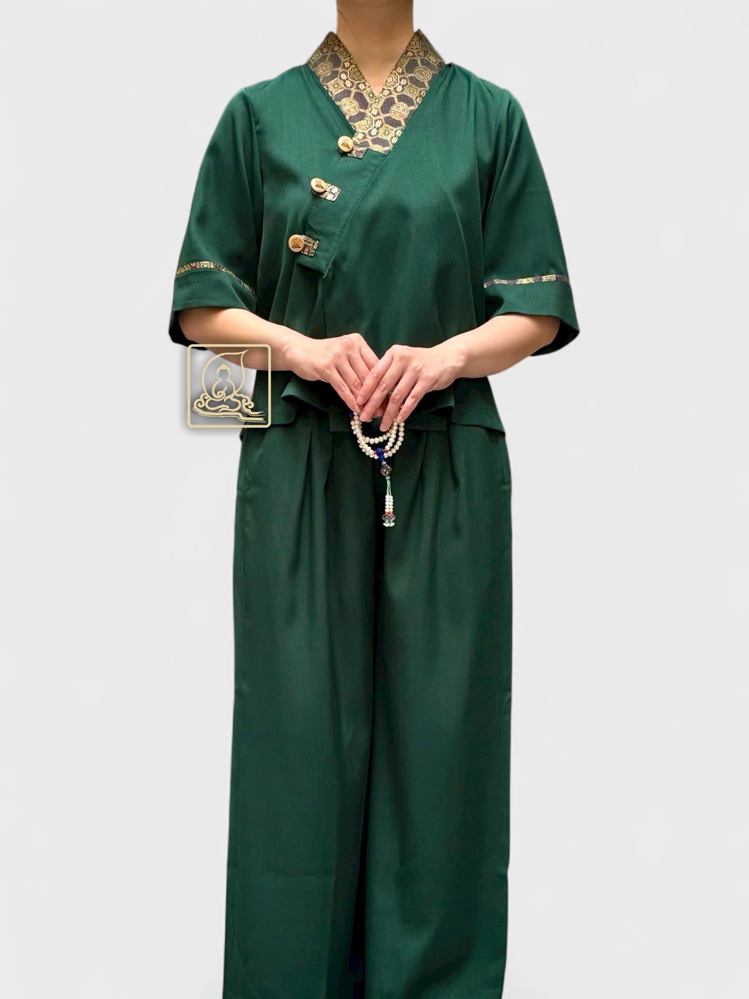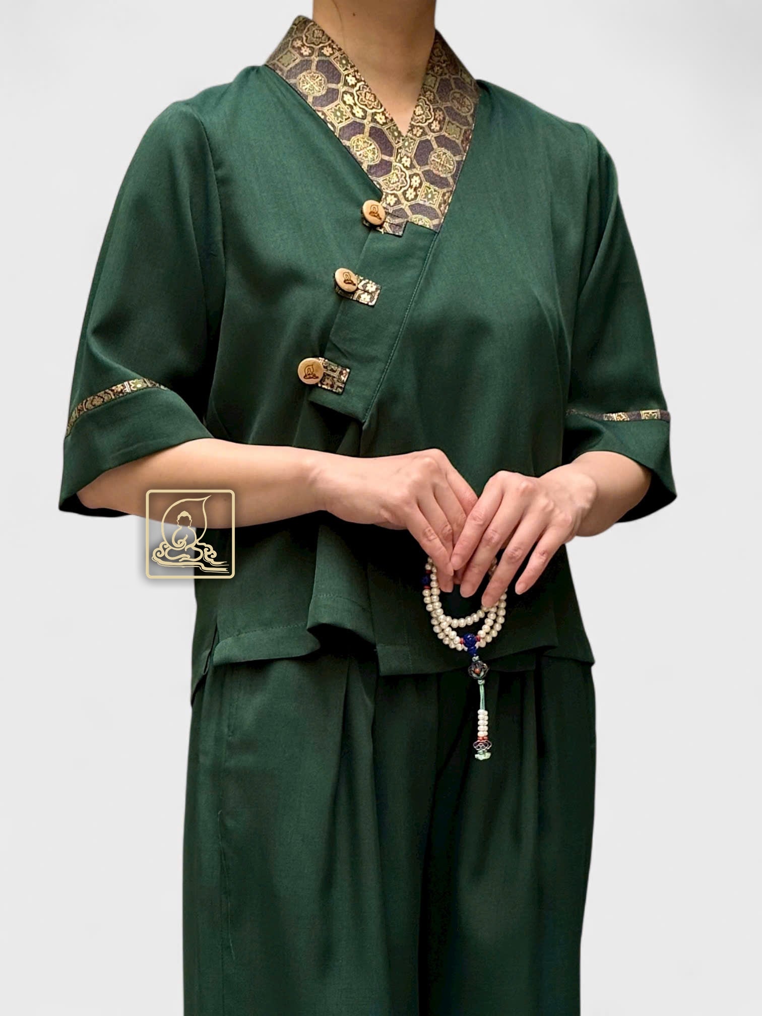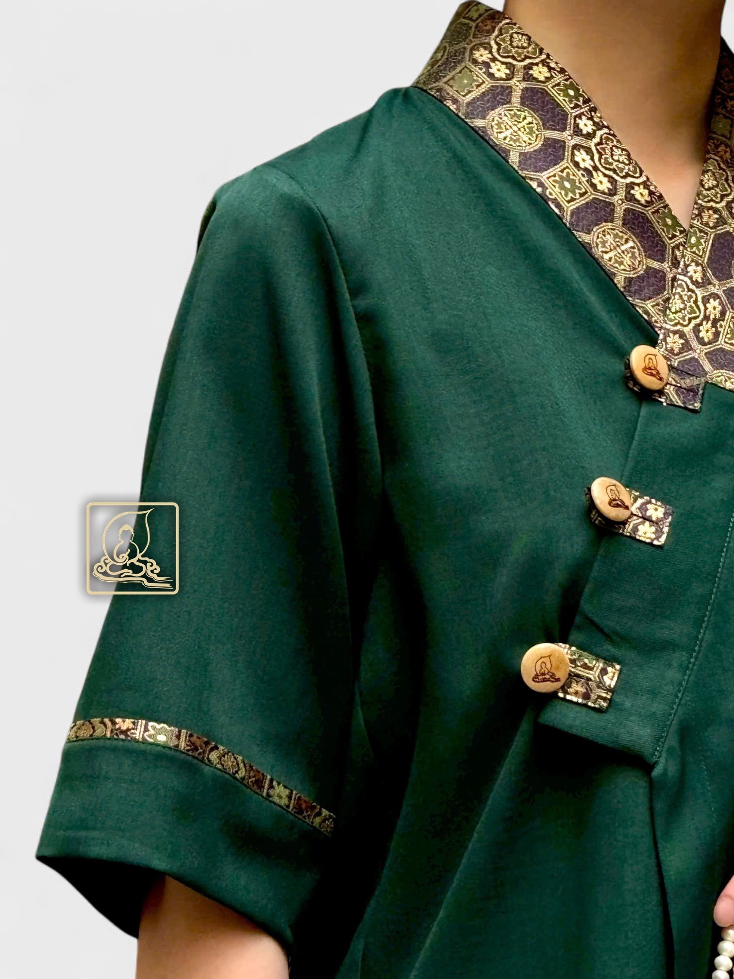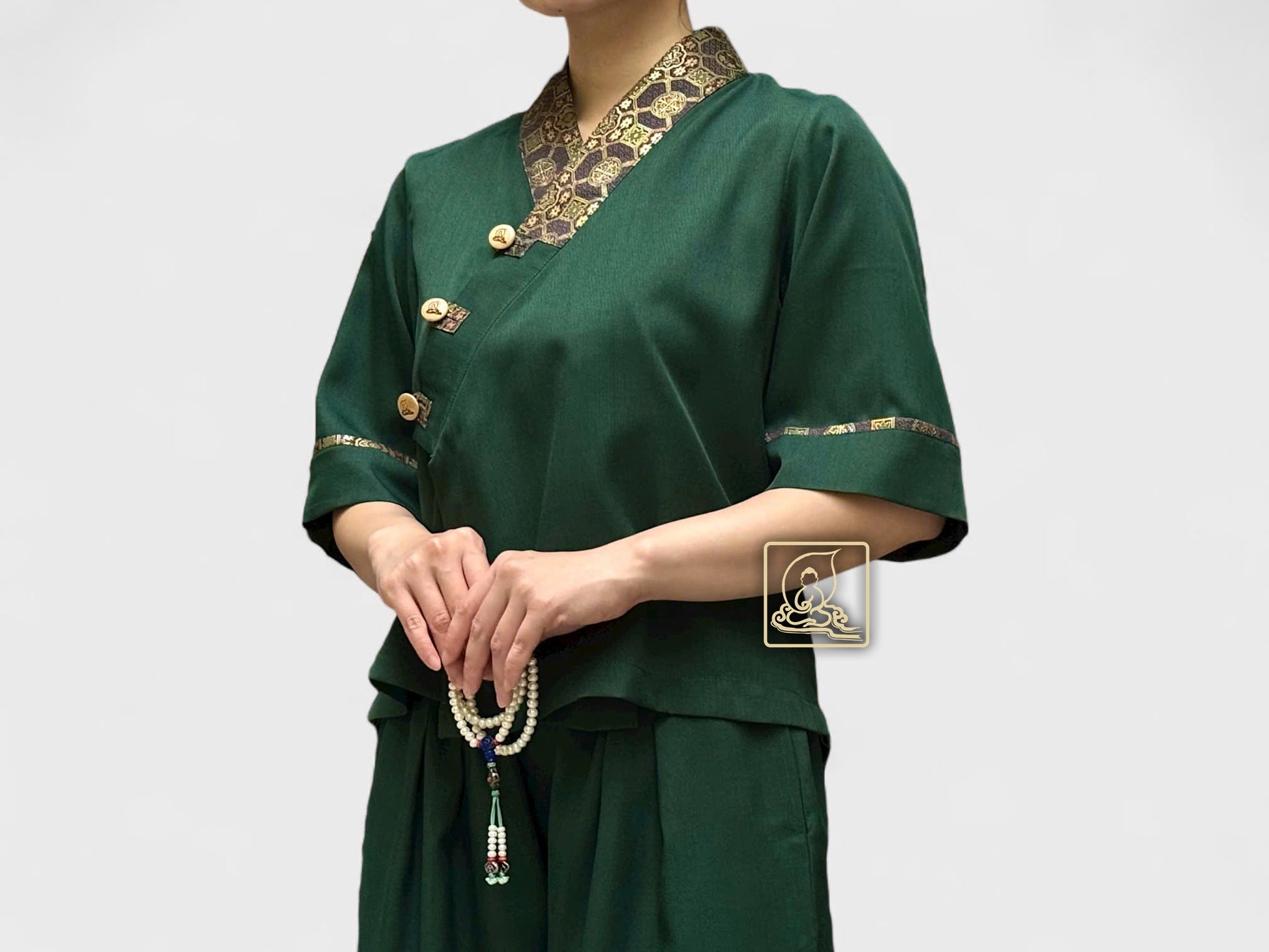 Mẫu trang phục nữ được thiết kế với kiểu dáng vạt chéo từ chất vải cotton nhập ngoại, sở dĩ cotton lại được dùng trong trang phục Phật tử vì độ thoáng khí cao của vải mang lại. Bên cạnh đó, cotton lại là chất liệu phù hợp từng vóc dáng khác nhau giúp tôn dáng tăng phần trang nghiêm.