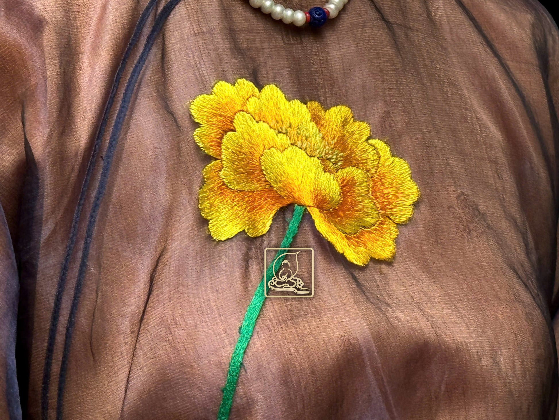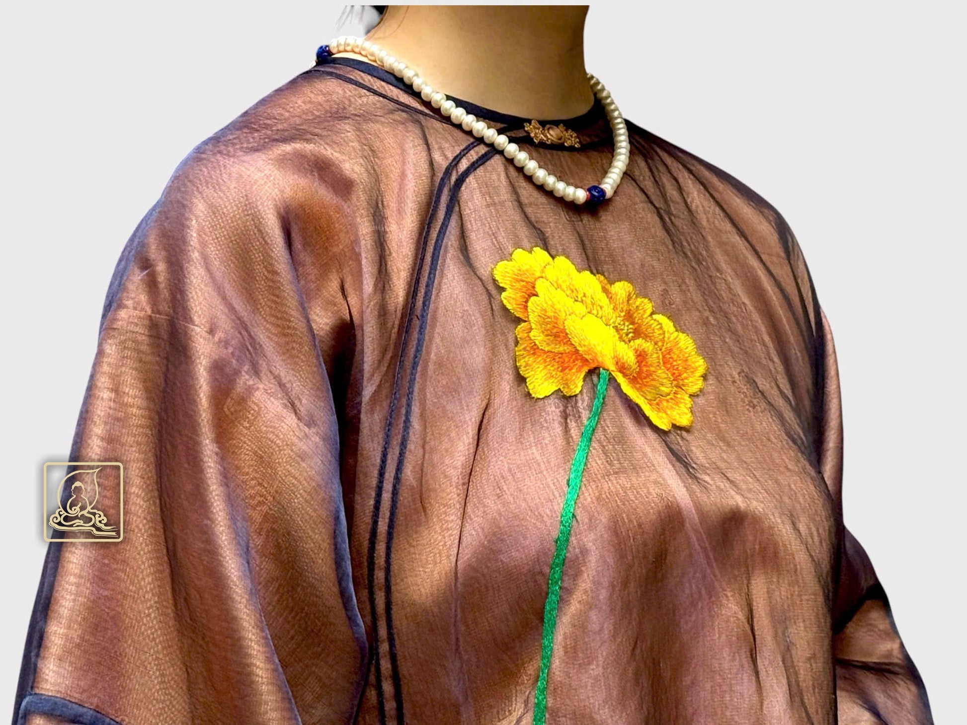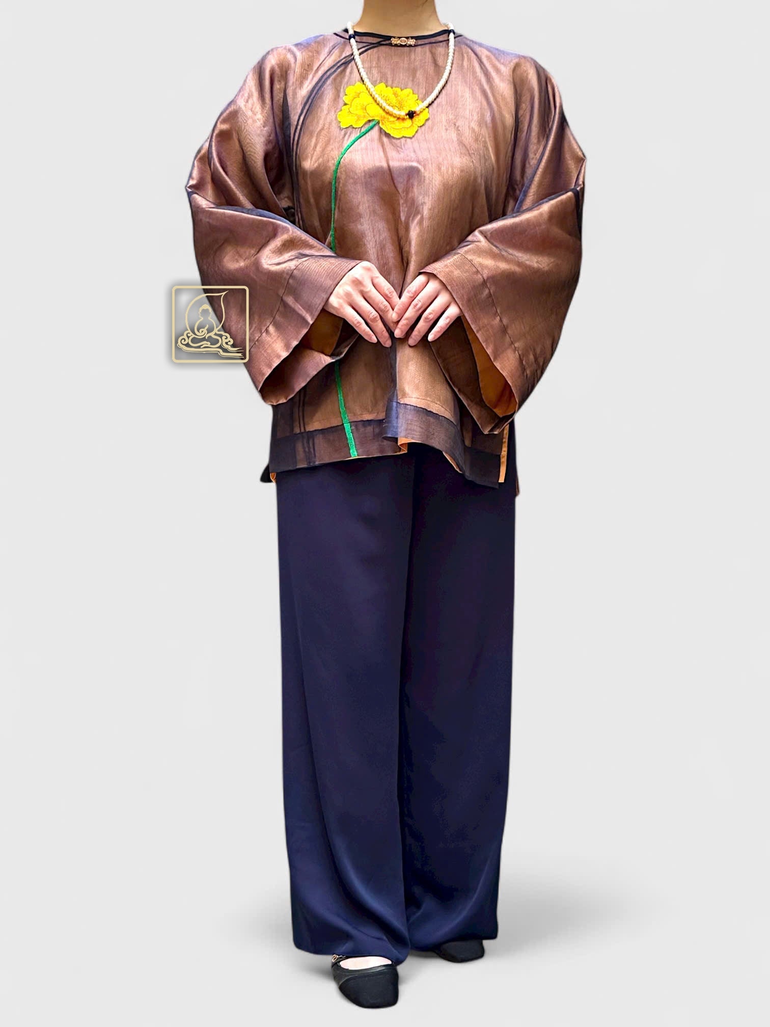 Mẫu trang phục nữ được đội ngũ thiết kế Phạm Nghiêm Trai chế tác tỉ mỉ với kiểu dáng trang trọng, từ việc lụa chọn chất vải đến họa tiết thêu trên áo đều được đưa lên tiêu chí hàng đầu trong mẫu thiết kế.