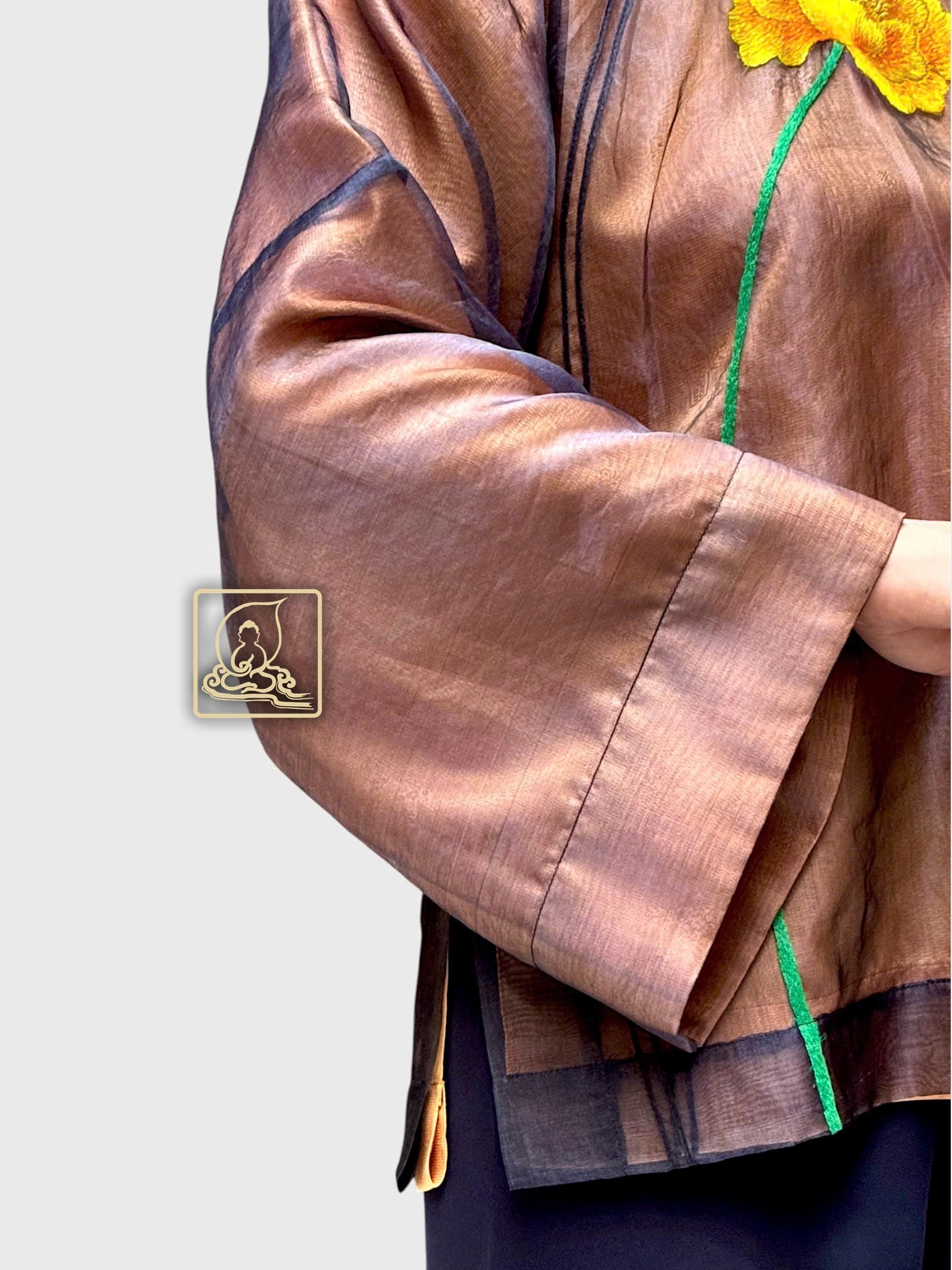 Bộ trang phục được sử dụng chất vải sa làm chủ đạo. Vải sa được dệt từ sợi tơ tạo thành, có trọng lượng nhẹ và độ bền cao hơn so với các chất liệu khác, ngoài ra còn có độ bóng tạo cảm giác nhẹ nhàng cho người sử dụng. Vào mùa hè, vải sa được sử dụng nhiều vì có tính chất vải thoáng mát, thân thiện với làn da nhạy cảm. Bên cạnh đó, phần phối cùng chất vải lụa làm lót bên trong, kết hợp cùng họa tiết hoa văn được thêu ở phần giữa áo giúp tôn thêm sự trang trọng cho người mặc.