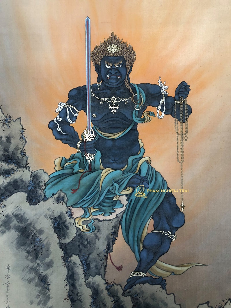 Sắc tướng uy mãnh của Ngài có thể khiến cho tà ma trông thấy phải khiếp sợ. Kiếm sắc ở tay phải biểu thị đầy đủ công năng tiêu diệt Tham – Sân – Si, là ba thứ độc hại đối với trí huệ. Sợi dây ở tay trái có thể trói buộc tất cả những kẻ ỷ mạnh làm càn. Ngọn lửa dữ sau lưng Ngài có thể thiêu đốt hết thảy các thứ phiền não. Từng đường nét ấy được các nghệ nhân thể hiện một cách tỉ mỉ chi tiết, tranh họa trên giấy lụa bồi gấm giúp cho tranh luôn thẳng và không bị cong gãy. Kết hợp hài hòa giữa các màu sắc cũng góp phần tô điểm thêm nét đẹp của bức tranh, thể hiện được sự uy mãnh, lòng từ bi nhiếp phục và giáo hóa chúng sanh cang cường.