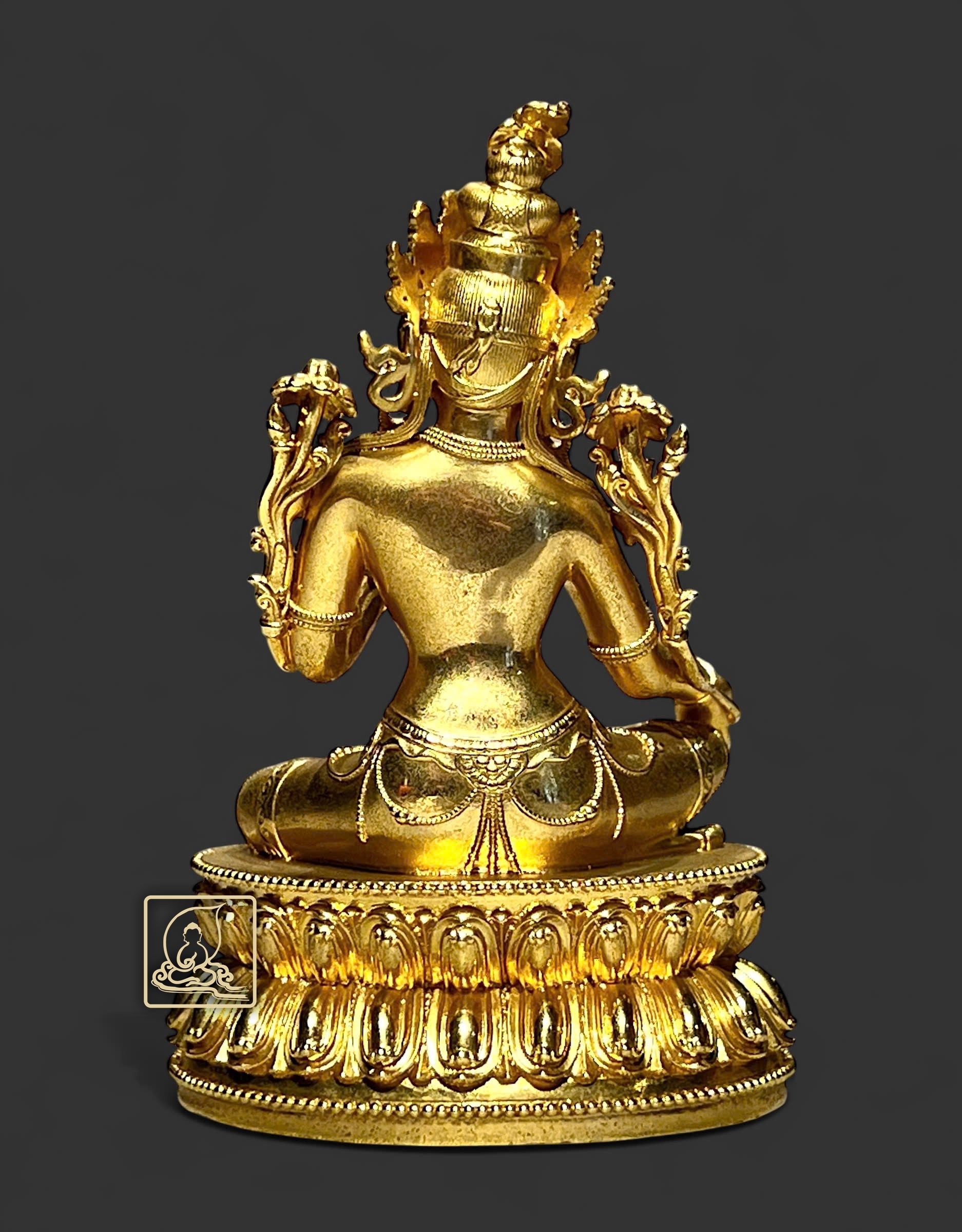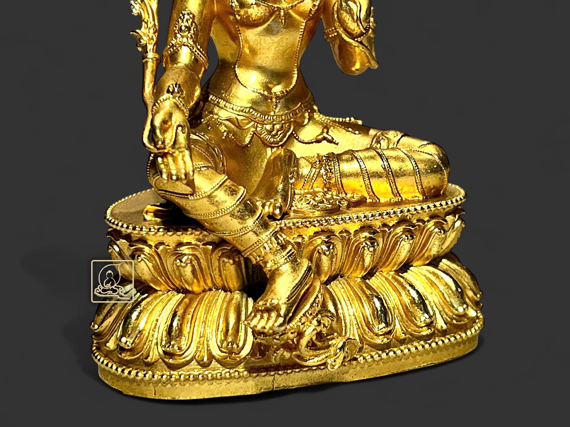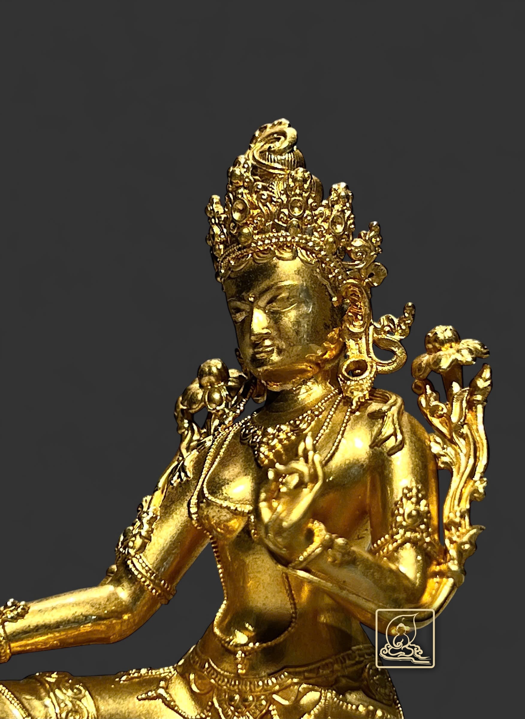 Tôn tượng Đức Lục Độ Mẫu (Green Tara) được nghệ nhân chạm khắc tỉ mỉ từ chất liệu đồng mạ vàng với những đường nét uyển chuyển đặc sắc. Sắc diện Ngài đoan nghiêm, thân trang hoàng thất bảo thù thắng, phần áo được chạm khắc họa tiết hoa văn ẩn đặc sắc. Mỗi đặc điểm sắc tướng của Đức Tara minh hoạ cho toàn bộ con đường giác ngộ đạt đến Phật quả và Tara là hợp nhất các tinh túy đức tính, thần lực và công hạnh giác ngộ.
