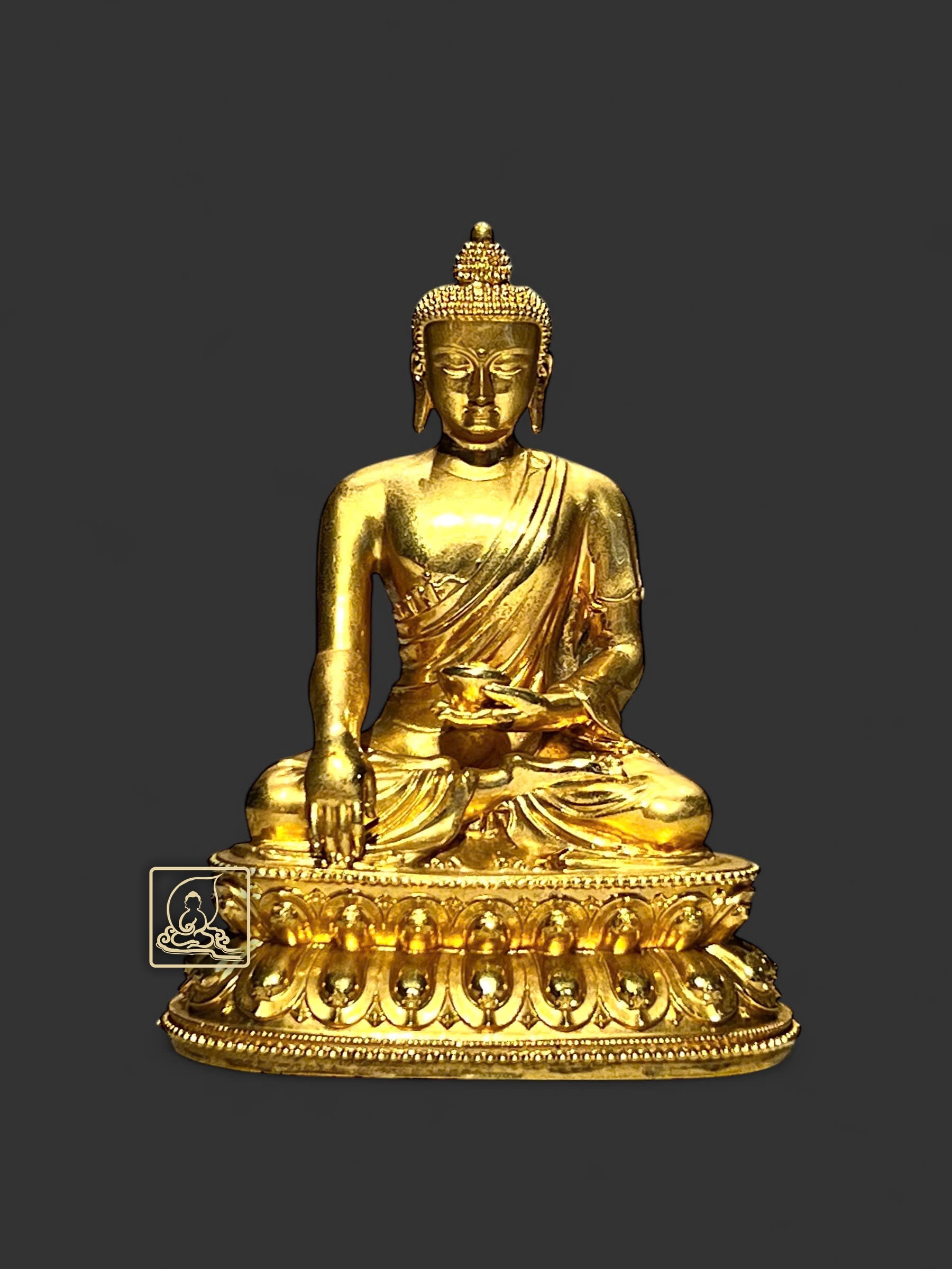 The statue is meticulously handcrafted by artisans from gold-plated bronze, depicting Shakyamuni Buddha seated in full lotus on a lotus pedestal. His serene and dignified expression, blessing-field robe, left hand holding the alms bowl, and right hand in the earth-touching mudra all embody the noble presence of the Enlightened One