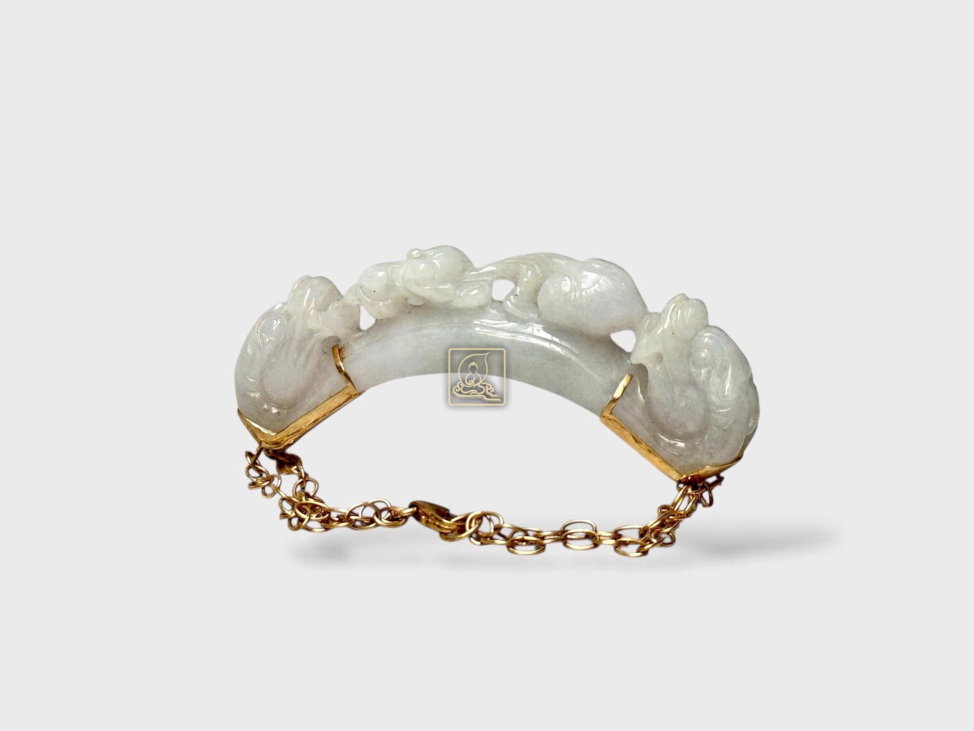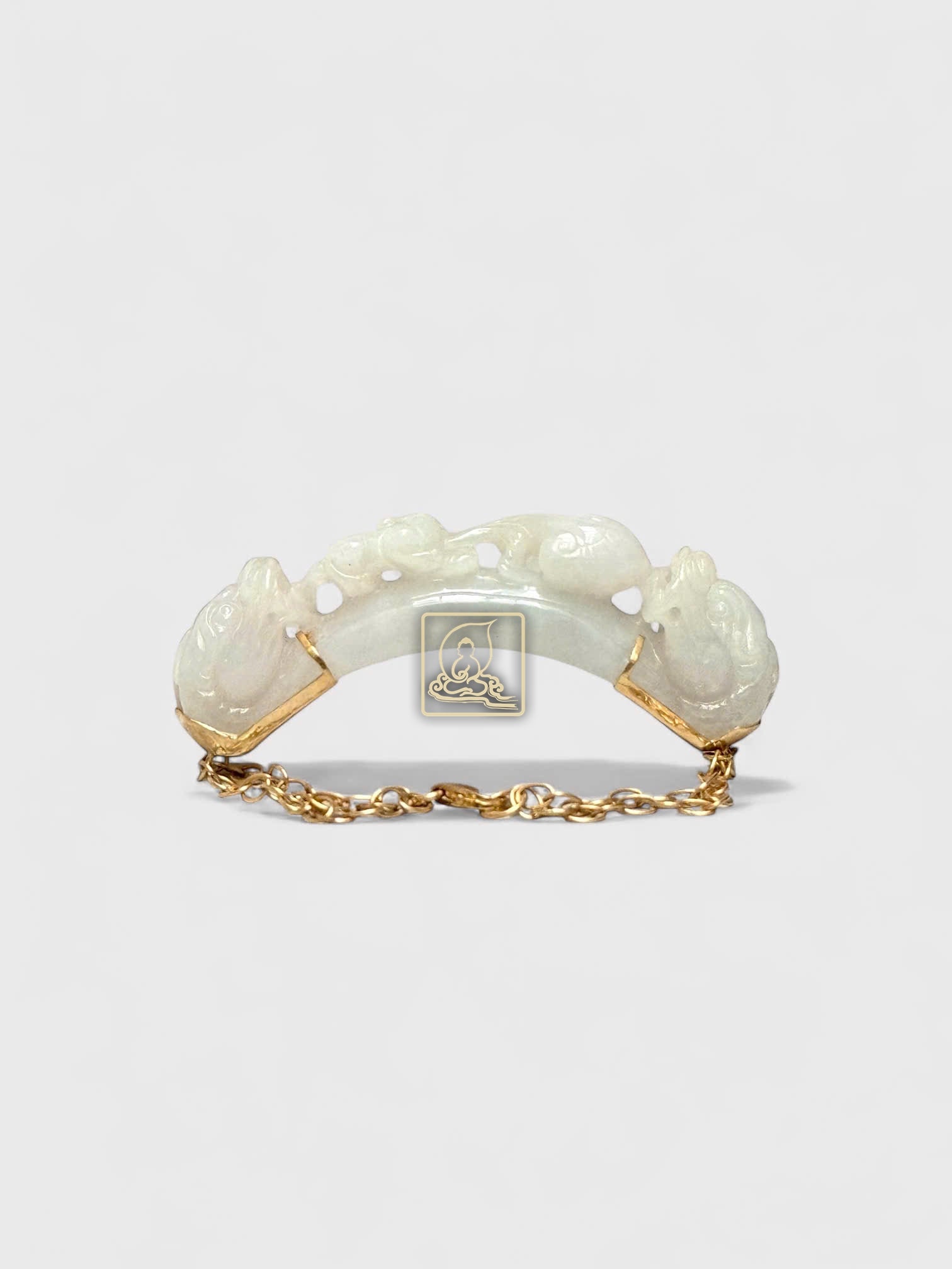 Vòng tay được chế tác từ ngọc cẩm thạch chạm khắc hình dáng như ý trượng, phía trên chạm nổi họa tiết hoa văn rồng và tỳ hưu đặc sắc.