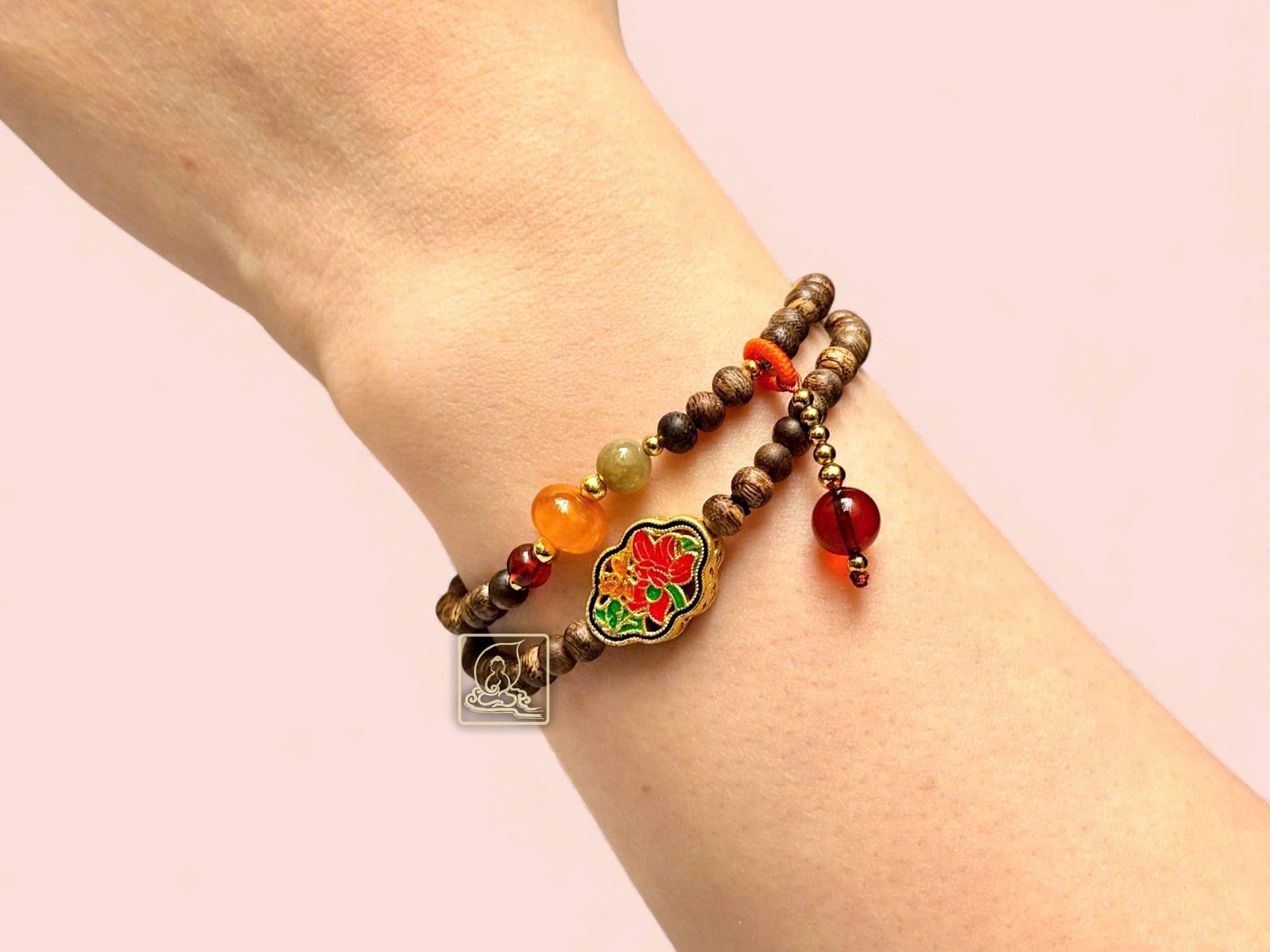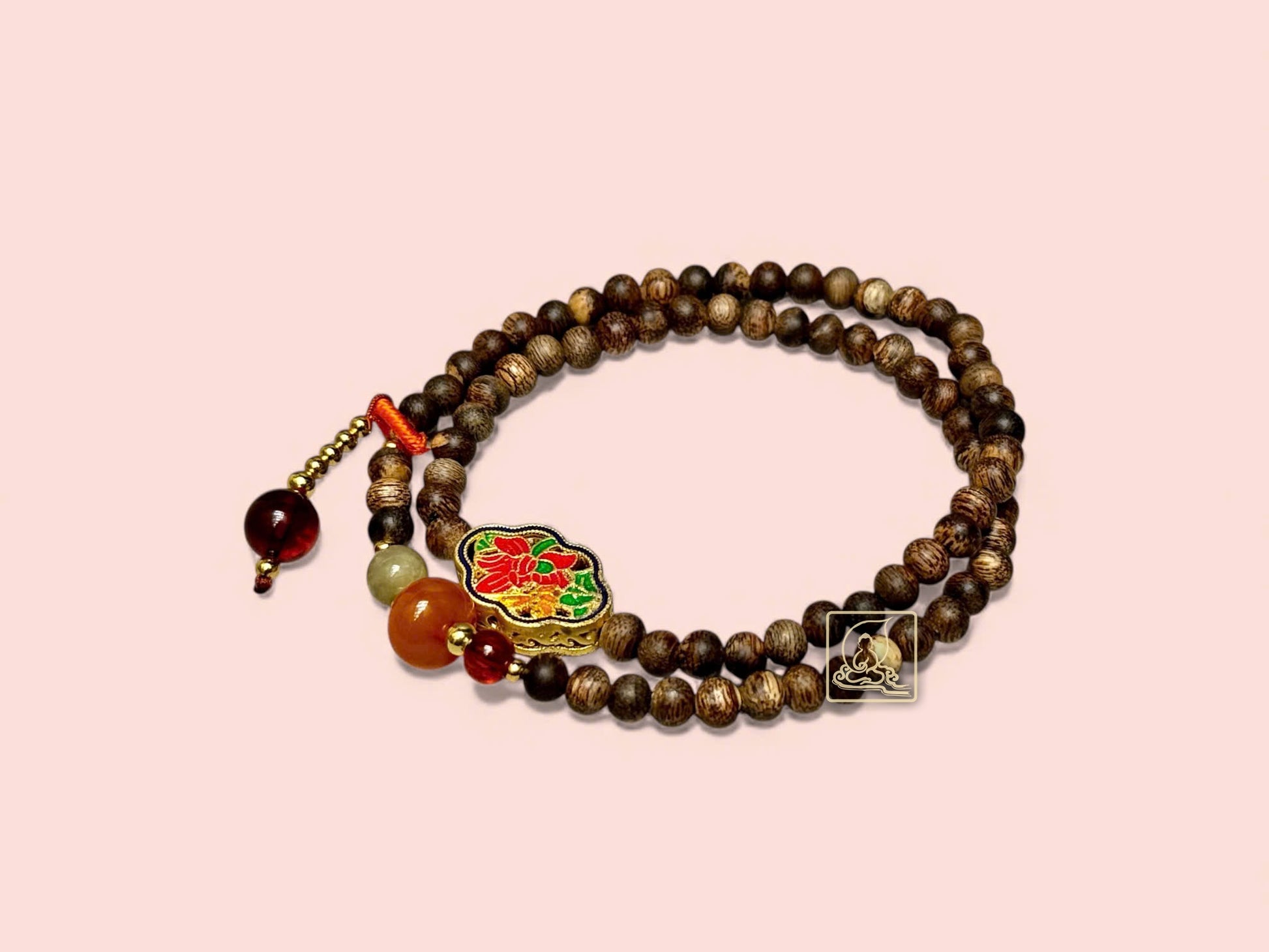 The double-wrap design is accented with gold-plated engraved charms, vibrant red amber, and soft green jadeite. The tassel features hand-carved amber, adding a charming finishing touch that highlights the elegance and poise of the modern woman.
