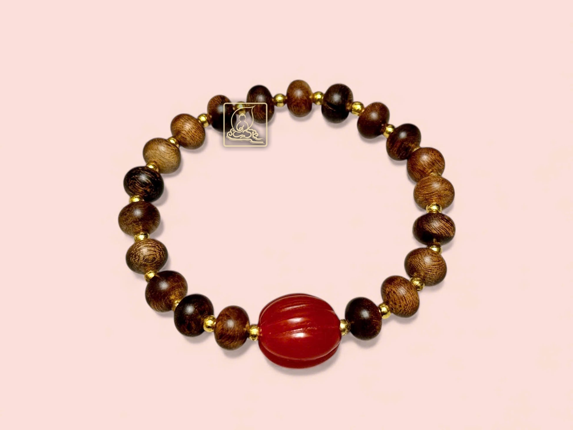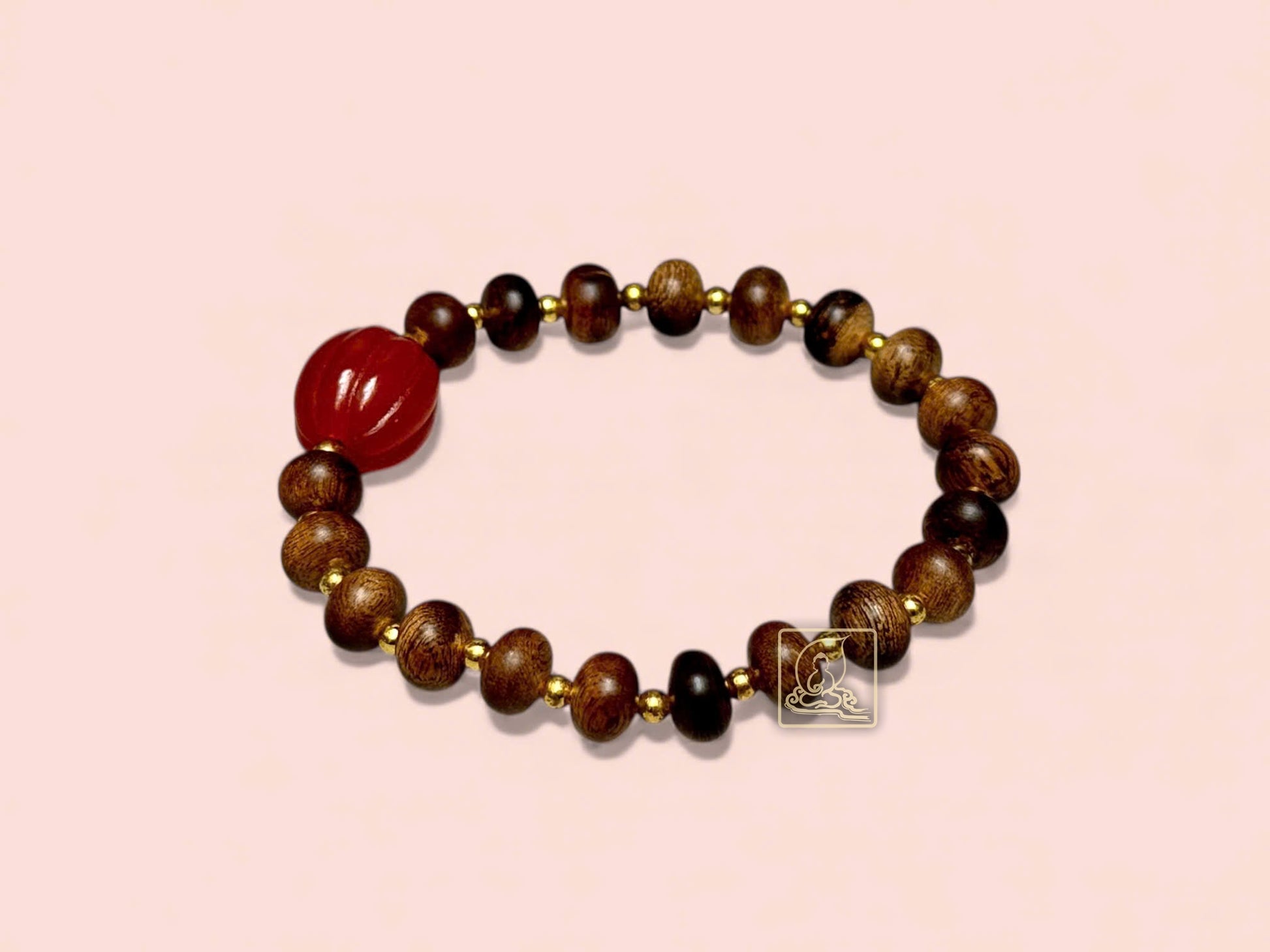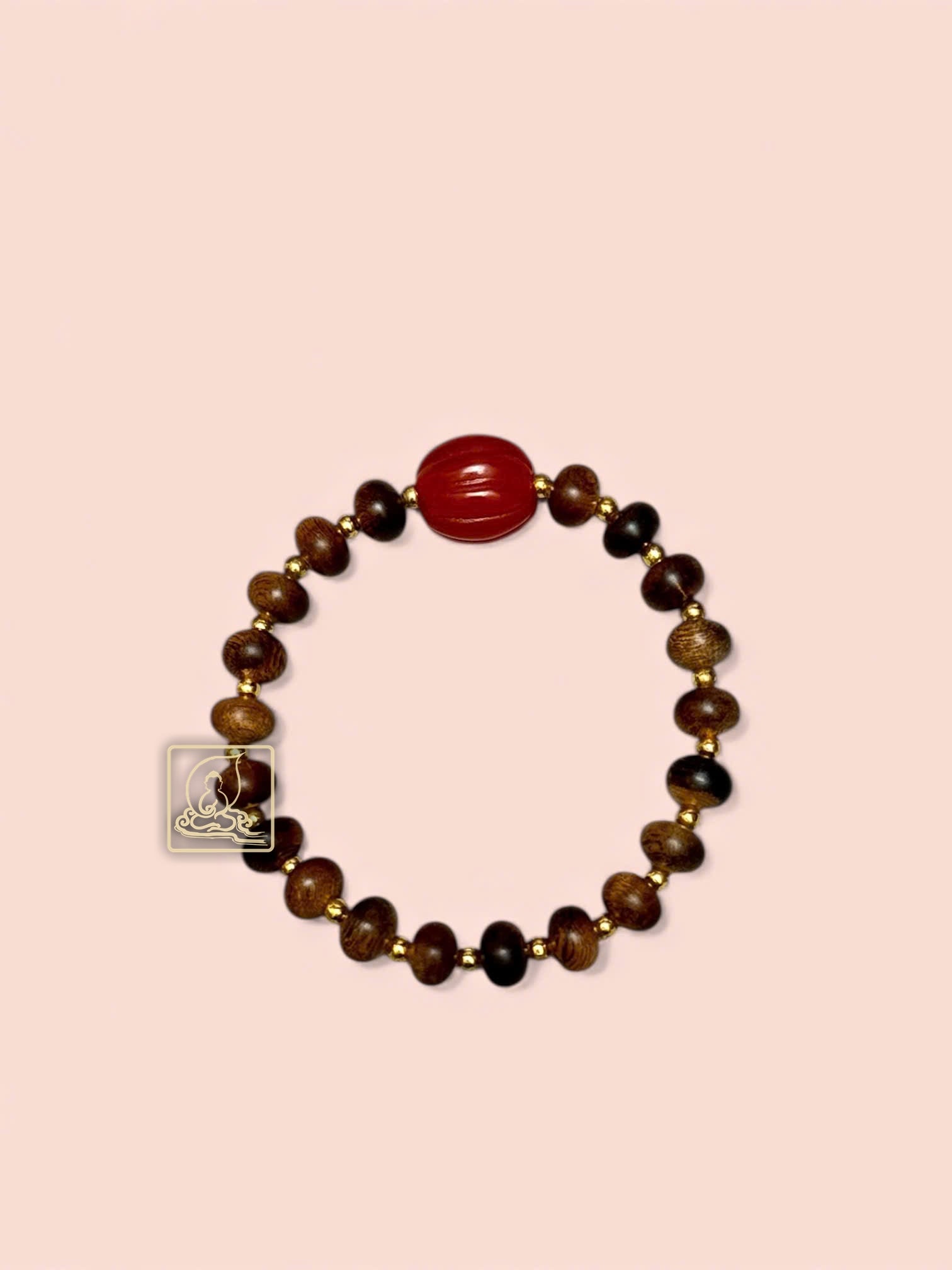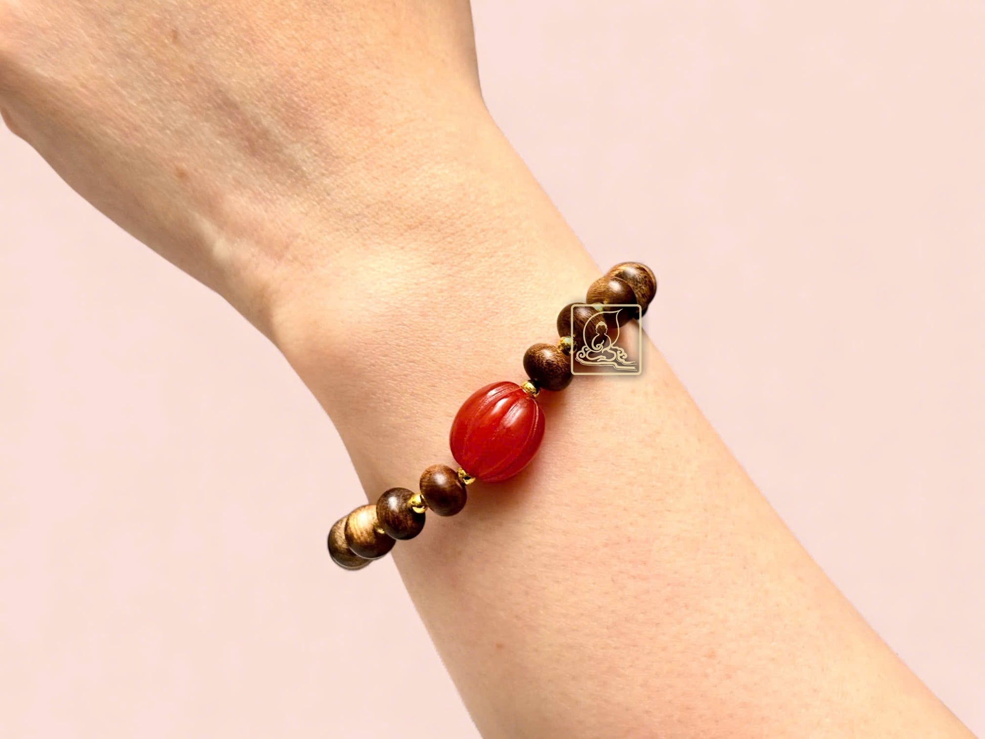 Crafted from premium Vietnamese agarwood, the 8mm oval beads wrap gently around the wrist. Gold-plated 925 silver bead charms alternate with intricately carved red agate, symbolizing luck, love, and positive energy.
