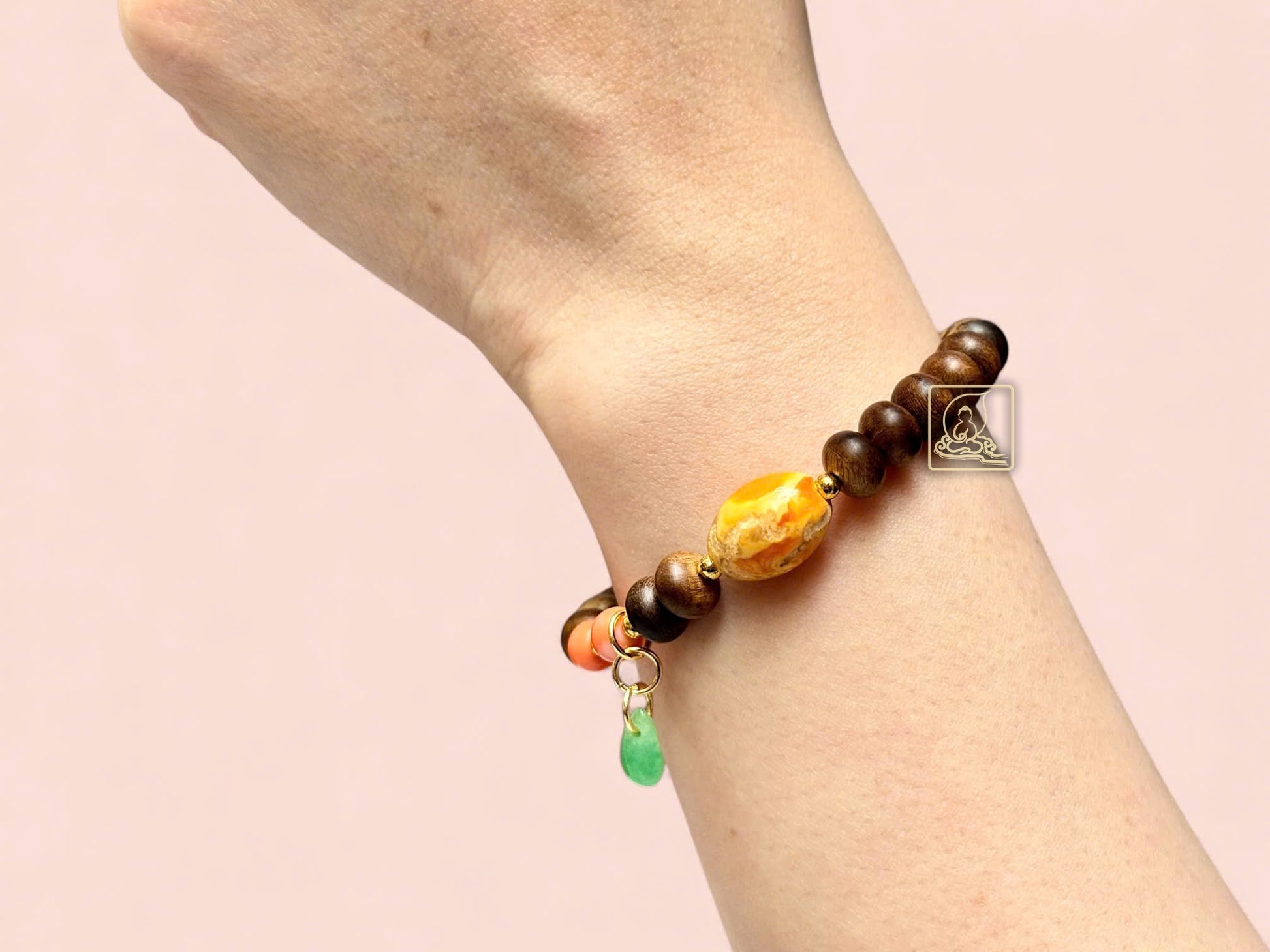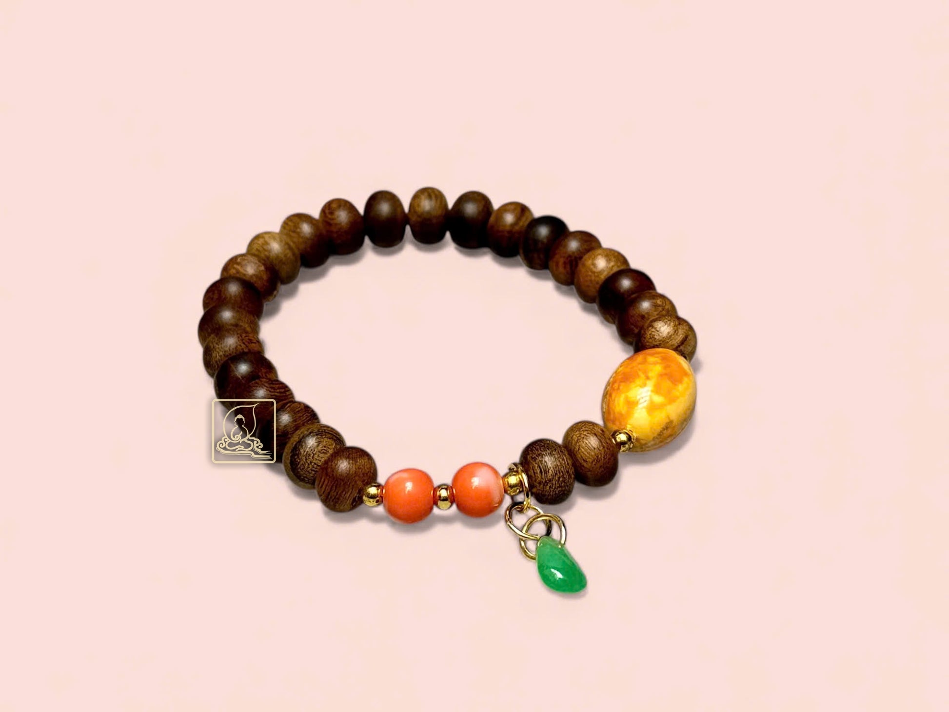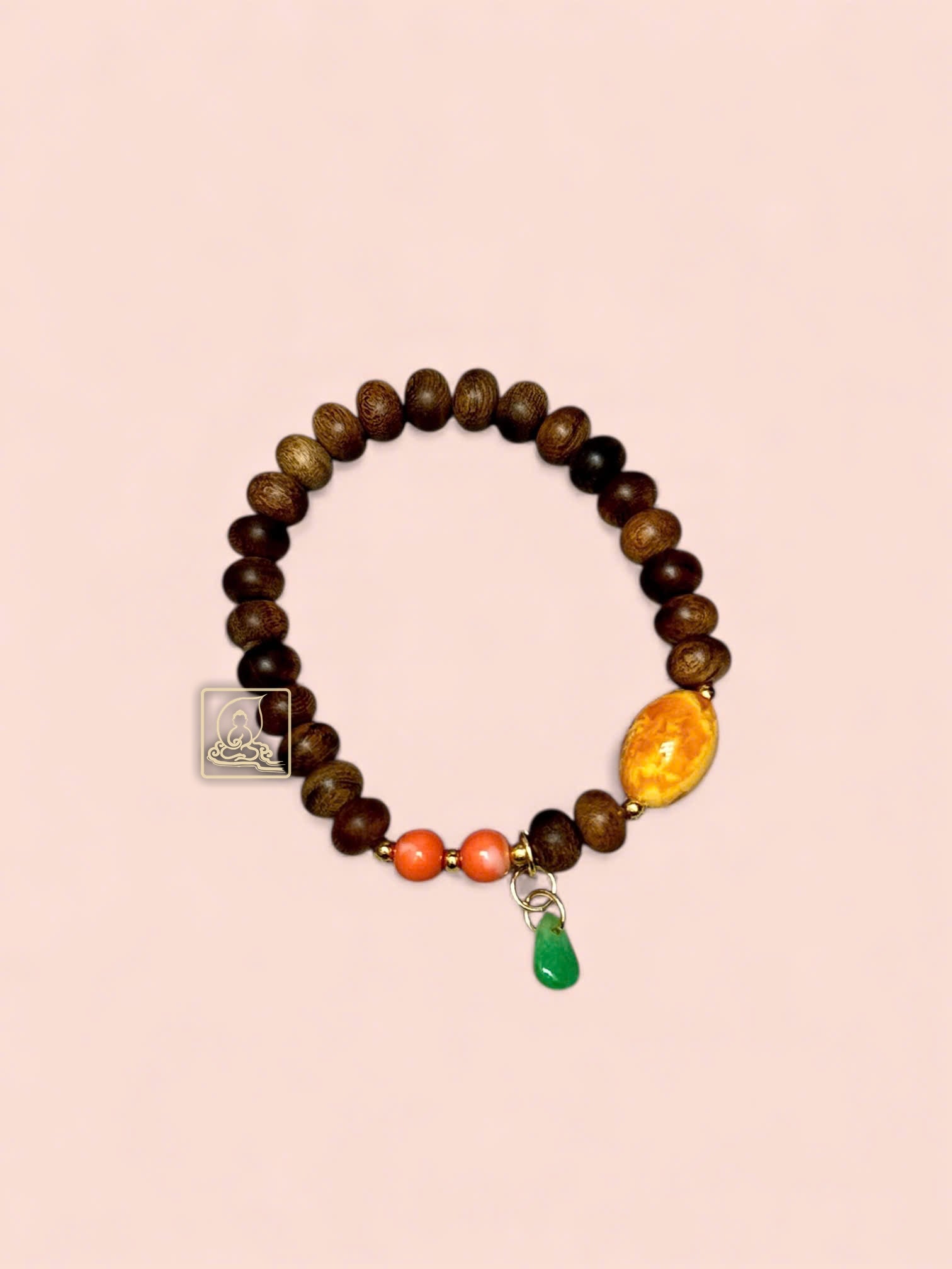 This 8mm oval Vietnamese agarwood bracelet perfectly blends natural beauty with Feng Shui energy. Crafted from premium agarwood, it is accented with golden copal and red coral beads for a refined, striking look.