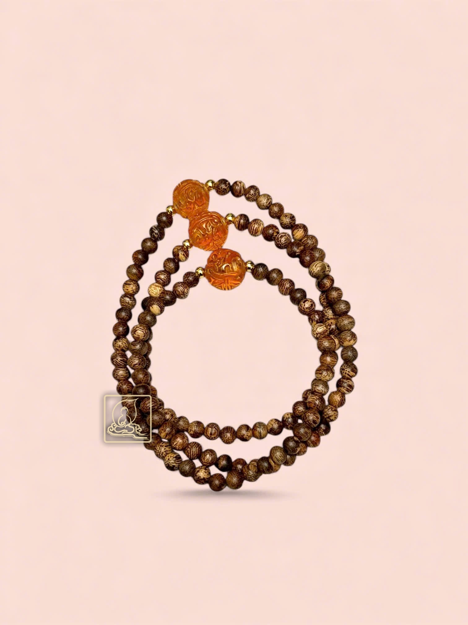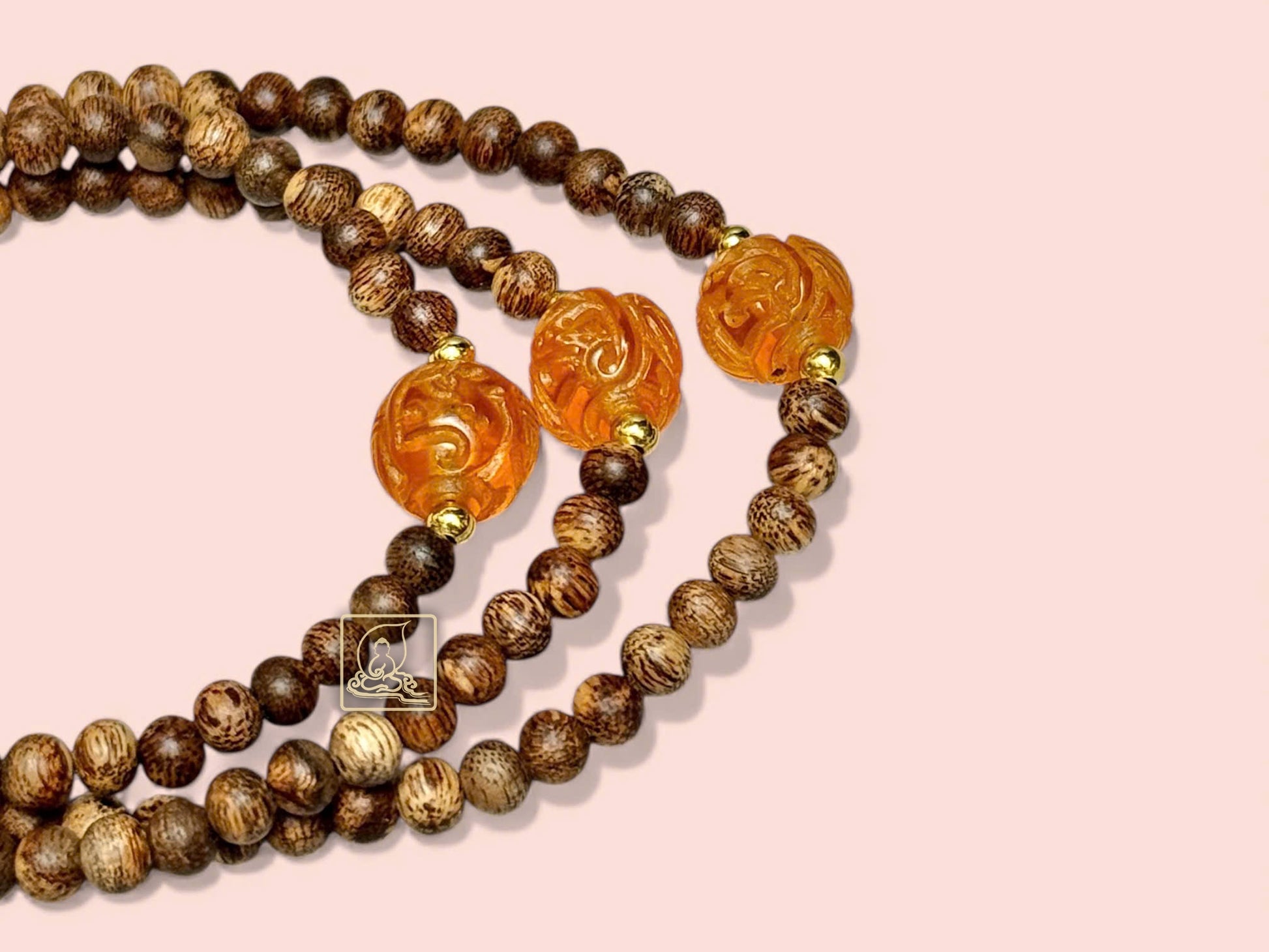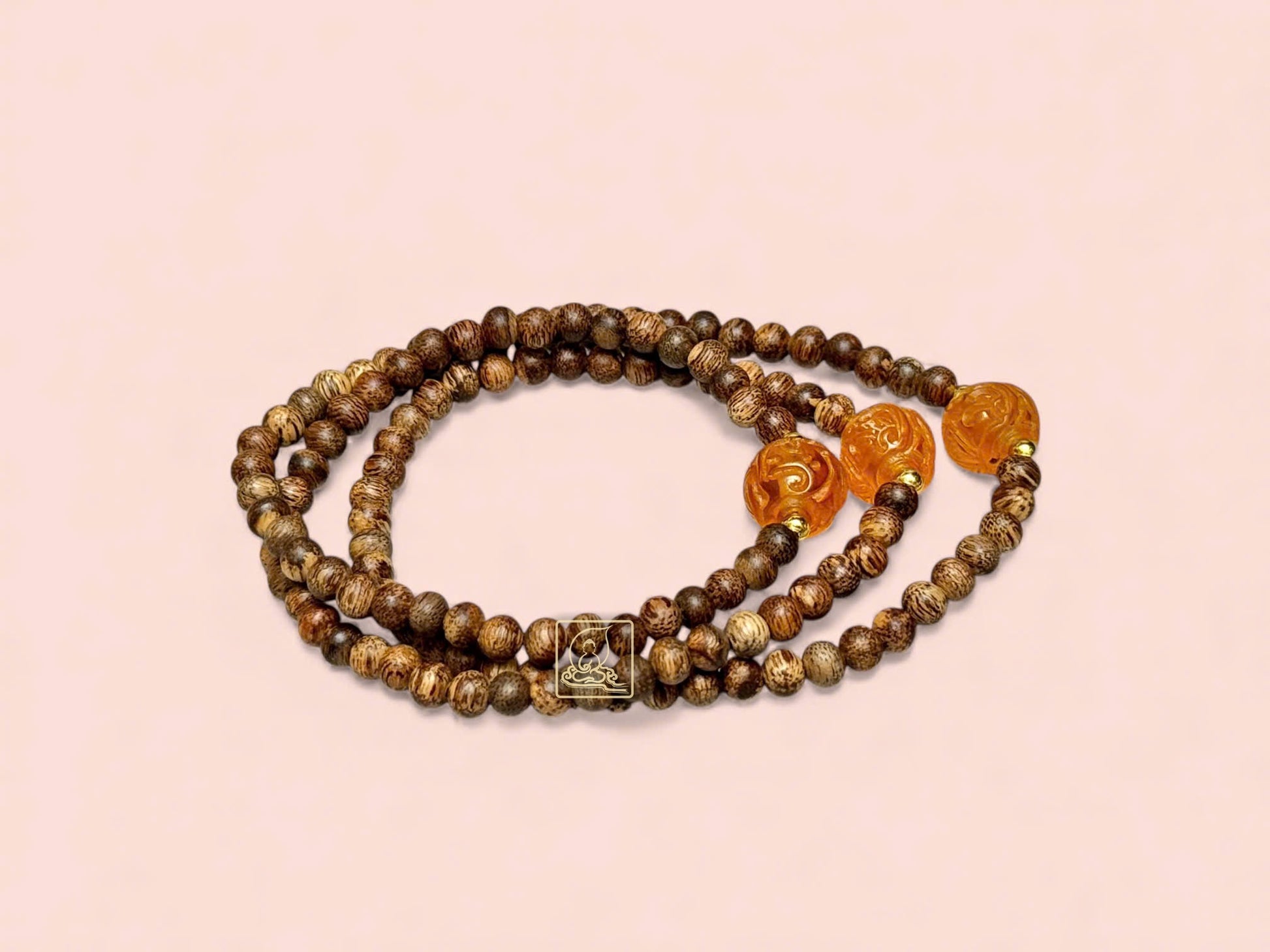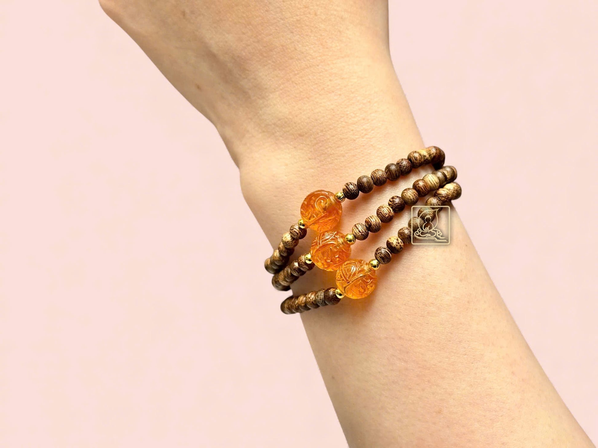 Crafted from natural 4mm agarwood beads, its warm fragrance soothes the mind and balances energy. A highlight of golden amber beads, intricately engraved with the “Thọ” character, symbolizes longevity, peace, and happiness. The rich contrast between golden amber and deep brown agarwood creates a sophisticated, understated look, wrapping the wrist with grace and refinement.